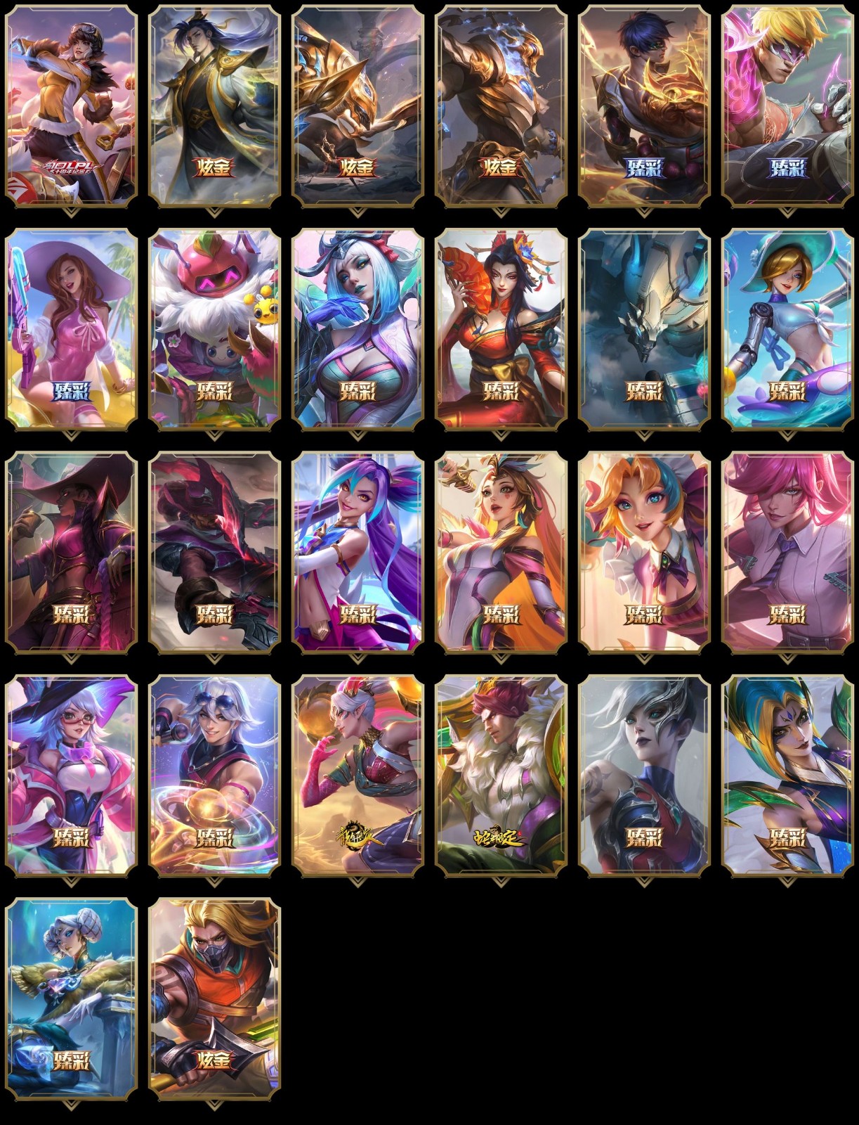 【重要皮肤】灵魂莲华劫至臻 战斗学院奇亚娜至臻 凯旋将军德莱厄斯至臻 心之钢永恩至臻 斗魂觉醒萨科至臻 墨之影武者亚索至臻 青花瓷丽桑卓至臻 至高天奎桑提至臻 海珀利安小队X09星环灵风迦娜至臻 星之守护者辛德拉至臻 女帝黛安娜至臻 未来战士卢锡安至臻 真实伤害亚索至臻 真实伤害赛娜至臻 福牛守护者菲奥娜至臻 源计划逆流塞拉斯至臻 源计划阴劫至臻 神龙尊者炎龙瑟提至臻 黑夜使者凯隐至臻 神龙尊者均衡之龙沃利贝尔至臻 征服者贾克斯至臻 KDA一代卡莎至臻 KDA阿狸至臻 KDA伊芙琳至臻 KDA伊芙琳2022至臻 战斗学院拉克丝至臻 战斗学院拉克丝2022至臻 电玩女神凯特琳至臻 电玩女神凯特琳2022至臻 魅惑女巫厄运小姐至臻 星之守护者妮蔻至臻 源计划正义艾瑞莉娅至臻 源计划正义艾瑞莉娅2022至臻 绒毛菲兹至臻 绒毛菲兹2022至臻 玉剑传说武剑仙至臻 玉剑传说武剑仙2022至臻 腥红之月亚托克斯至臻 腥红之月亚托克斯2022至臻 黑夜使者李青至臻 黑夜使者李青2022至臻 殿堂传奇薇恩 殿堂传奇乐芙兰 灰烬守护者慎 灰烬骑士派克 海克斯科技雷克顿 海克斯科技斯维因 海克斯科技嘉文四世 海克斯科技崔丝塔娜 水晶泰坦诺提勒斯 水晶掠夺者卡兹克 永恒之森奥恩 暗星科加斯 黎明使者卡尔玛 恐惧新星德莱厄斯 零之枪骑赫卡里姆 摄魂使者薇恩 新创战纪希维尔 舞会公主安妮 养蜂人辛吉德 星之守护者伊泽瑞尔 玉剑传说舞剑仙 神凰行者幽羽玄凰萨勒芬妮 玉剑传说舞龙卫 灵能特工易 银龙裁决泰隆 碧玉之牙卡西奥佩娅 春晖神女拉克丝 你看见过我的熊猫吗安妮 北辰之威内瑟斯 美猴王孙悟空 定海神珍孙悟空 玉净夜叉凯特琳 紫金罗刹莫甘娜 广寒仙子嫦娥 虎痴之拳蔚 张辽文远 司马懿仲达 金猪烈焰瑟庄妮 烈焰美人薇恩 王国机神朱雀蕾欧娜 王国机神白虎贾克斯 王国机神玄武盖伦 胜利女神瑟庄妮 胜利女神奥莉安娜 胜利枪神格雷福斯 胜利枪神卢锡安 胜利之剑亚托克斯 碎心之拳蔚 甜心之羽霞 甜心之翎洛 觅心猎手薇恩 幽梦玫瑰泰隆 双城之战2微光实验室辛吉德 北极星神黛安娜 北极星圣贤基兰 北极星猎人斯维因 北极星使者沃里克 寒冬精灵璐璐 冬季仙境奥莉安娜 圣诞老人德莱文 持胡萝卜的雪人易 狂心冰王图奇 魄罗骑士瑟庄妮 平安夜女神娑娜 圣诞糖果棒厄运小姐 魅惑女巫赛娜 魅惑女巫崔丝塔娜 大魔王提莫 克烈古拉伯爵 小恶魔菲兹 海之歌萨勒芬妮 泳池派对凯特琳 泳池派对佐伊 泳池派对奥莉安娜 泳池派对黑默丁格 泳池派对塔莉垭 泳池派对格雷福斯 电玩战魂赫卡里姆 御星魔矢艾希 送披萨的小姐姐希维尔 克格汪 制胜金靴李青 制胜金球拉莫斯 DRX艾希 EDG格雷福斯 DWG崔斯特 DWG烬 FPX锤石 FPX薇恩 FPX李青 iG卡蜜尔 iG卡莎 SKTT1烬 SKTT1辛德拉 SKTT1娜美 SKTT1瑞兹 SSW雷恩加尔 SSW辛吉德 SKTT1贾克斯 SKTT1劫 SKTT1李青 SKTT1薇恩 暗杀星奥莉安娜 暗杀星蒙多 暗杀星努努和威朗普 Fnatic库奇 Fnatic嘉文四世 冰雪节玛尔扎哈 冰雪节辛吉德 冰雪兽纳尔 防暴士兵格雷福斯 防暴士兵辛吉德 防暴天使凯尔 钢铁之翼艾尼维亚 冠军典狱长锤石 冠军掠夺者卡兹克 冠军之隐劫 春晖海神卡兹克 春晖神女艾希 鬼影森森茂凯 胡桃夹子萨科 惊悚派对阿木木 警用试作体K9内瑟斯 蓝色忧郁崔斯特 密林猎手提莫 南瓜头费德提克 女猎手希维尔 破空枪骑孙悟空 圣诞精灵崔丝塔娜 圣诞狂欢基兰 圣诞老人古拉加斯 圣诞玩偶波比 圣诞驯鹿克格莫 外星装甲库奇 无头骑士赫卡里姆 喜庆之树茂凯 邪恶圣诞老人维迦 雪装奈德丽 野兽猎人瑟庄妮 英勇玩具兵普朗克 永恒之森乐芙兰 勇者阿狸 勇者奈德丽 征服者韦鲁斯 暗影沃里克 魅惑女巫菲奥娜 阿木木主人不要我了 2021全球总决赛嘉文四世 波比的巧克力工坊 地底世界崔斯特 都铎王朝图奇 十五周年纪念希维尔 十周年纪念安妮 源代码乐芙兰 神凰行者瑞羽圣凰艾尼维亚 胜利凤凰艾尼维亚 斗魂觉醒佛耶戈 斗魂觉醒莎弥拉 灵魂守卫乌迪尔