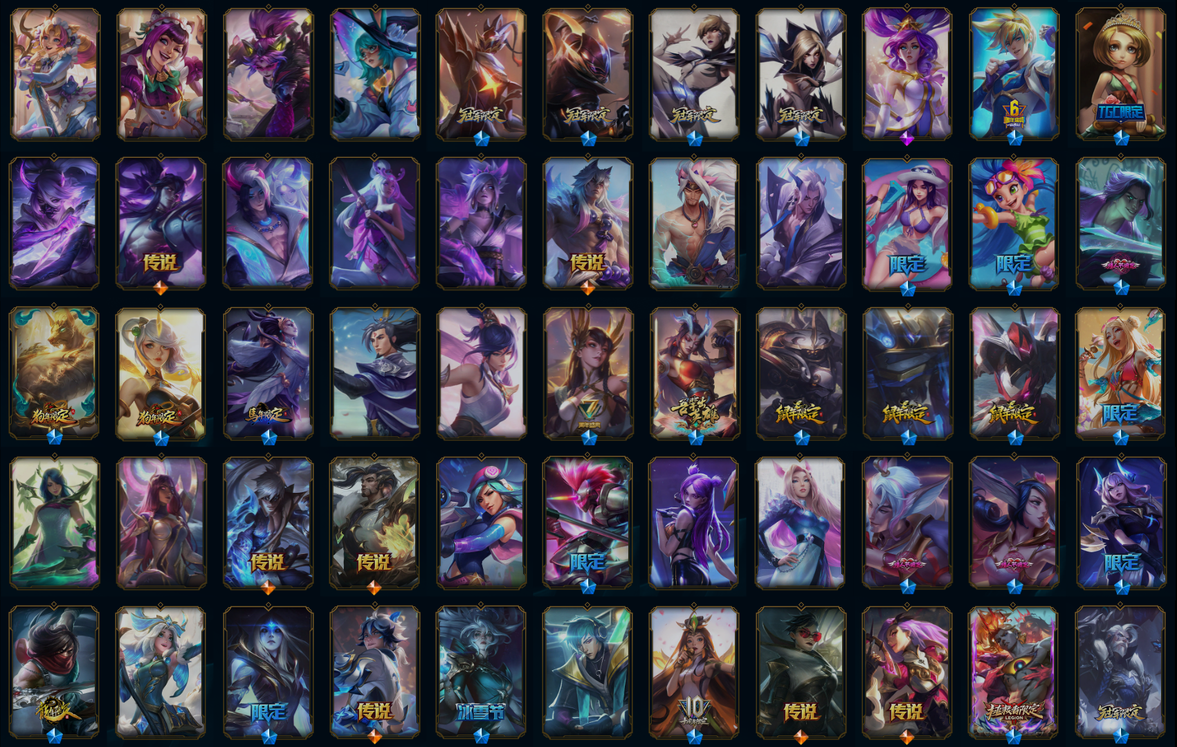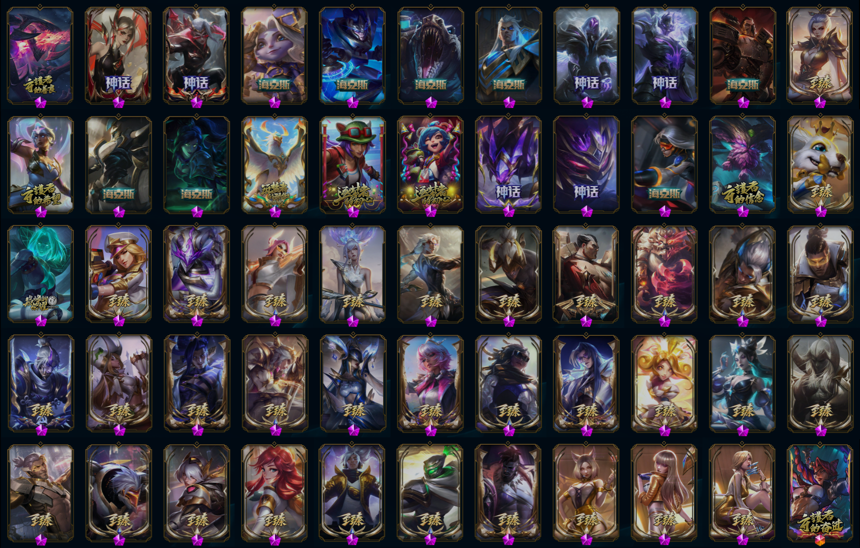 【传说皮肤】神龙尊者夜月幻龙亚索 星之守护者阿卡丽 灵魂莲华瑟提 花仙女王卡尔玛 驯龙学者黑默丁格 光明哨兵薇恩 钢铁之翼凯尔 狼神英灵安蓓萨 死亡骑士盖伦 律政大亨蒙多 暗星女王拉克丝 驯龙炮手崔丝塔娜 青花瓷奥瑞利安索尔 烈焰雄心崔丝塔娜 源计划泯灭雷克顿 黎明使者索拉卡 双重冰晶艾尼维亚 源计划联合艾希 第三类接触黑默丁格 至高天派克 女警狙击凯特琳 冰霜亚龙希瓦娜 银河魔装机神兰博 战斗学院凯特琳 影执事劫 青花瓷伊泽瑞尔 约德尔国队长提莫 黎明使者永恩 神龙尊者昼日真龙亚索 星之守护者洛 源计划毁灭派克 真实伤害艾克 星之守护者霞 暗星锤石 天煞劫 灵魂莲华锤石 暗星尊烬 西部魔影卢锡安 星之守护者金克丝 黑夜使者亚索 奥德赛凯隐 神王德莱厄斯 蔷薇绅士杰斯 霸天异形卡兹克 灌篮高手德莱厄斯 金牌主播德莱文 泳池派对吉格斯 宇航员诺提勒斯 苍穹之光韦鲁斯 符文战熊沃利贝尔 偶像歌手阿狸 黯黑魔龙希瓦娜 星之守护者拉克丝 枯萎之壤泽拉斯 焰尾妖狐阿狸 月蚀骑士蕾欧娜 黎明使者锐雯 钢铁军团盖伦 屠龙勇士潘森 战斗学院伊泽瑞尔 炼狱魔犬内瑟斯 源计划净化薇恩 神龙尊者圣龙李青 丧尸布兰德 神拳李青 地狱行者孙悟空 女帝卡特琳娜 冰川巨兽墨菲特 未来战士凯特琳 苹果机器人布里茨 陆地王者4WD布里茨 最终BOSS维迦 红色男爵库奇 女主播迦娜 冰霜之刃艾瑞莉娅 电玩女神娑娜 黯晶凤凰艾尼维亚 绅士科加斯 战地巨兽科加斯 恶魔之刃泰达米尔 西部天使艾希 女皇艾希 合金巨兽努努和威朗普 欧米伽小队幽灵特工 提莫约德尔人的一大步 恶魔男爵瑞兹 霸天零式赛恩 大天使长米迦勒凯尔 源计划林易 战场女武神凯尔 血石领主弗拉基米尔 地狱之门卫士加里奥 战地机甲厄加特 魔幻卡牌崔斯特 铁哥们儿奥拉夫