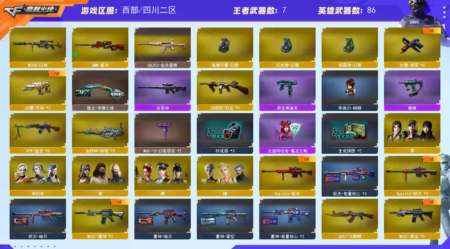 幻神+幻兽沙鹰+6烈龙斯太尔蝴蝶毒蜂清道夫死亡之眼+6盘龙3炼狱+qbz+精品基础v+全套隐蛇宗【92v】【专家3】【Lv.102 荣耀元帅】VIP5 92V,4王者,4炫金,毁灭暗月/极光能量核心/天龙CFSTAR/天龙秘银/天龙能量核心/火麒麟CFSTAR/无影能量核心/AK47雷神/雷神暗月/雷神能量核心/审判者/_零/_葵/_樱/_瞳/M200-幻神/Barrett-毁灭(3)/Barrett-极光/barrett-金色蔷薇/王者之光-觉醒版/M4A1-黑骑士音效卡/屠龙-云海游龙音效卡截图展示段位不代表实际段位,如赛季更新等不可抗拒因素发生变化、