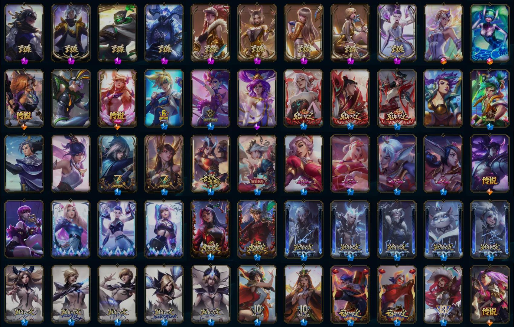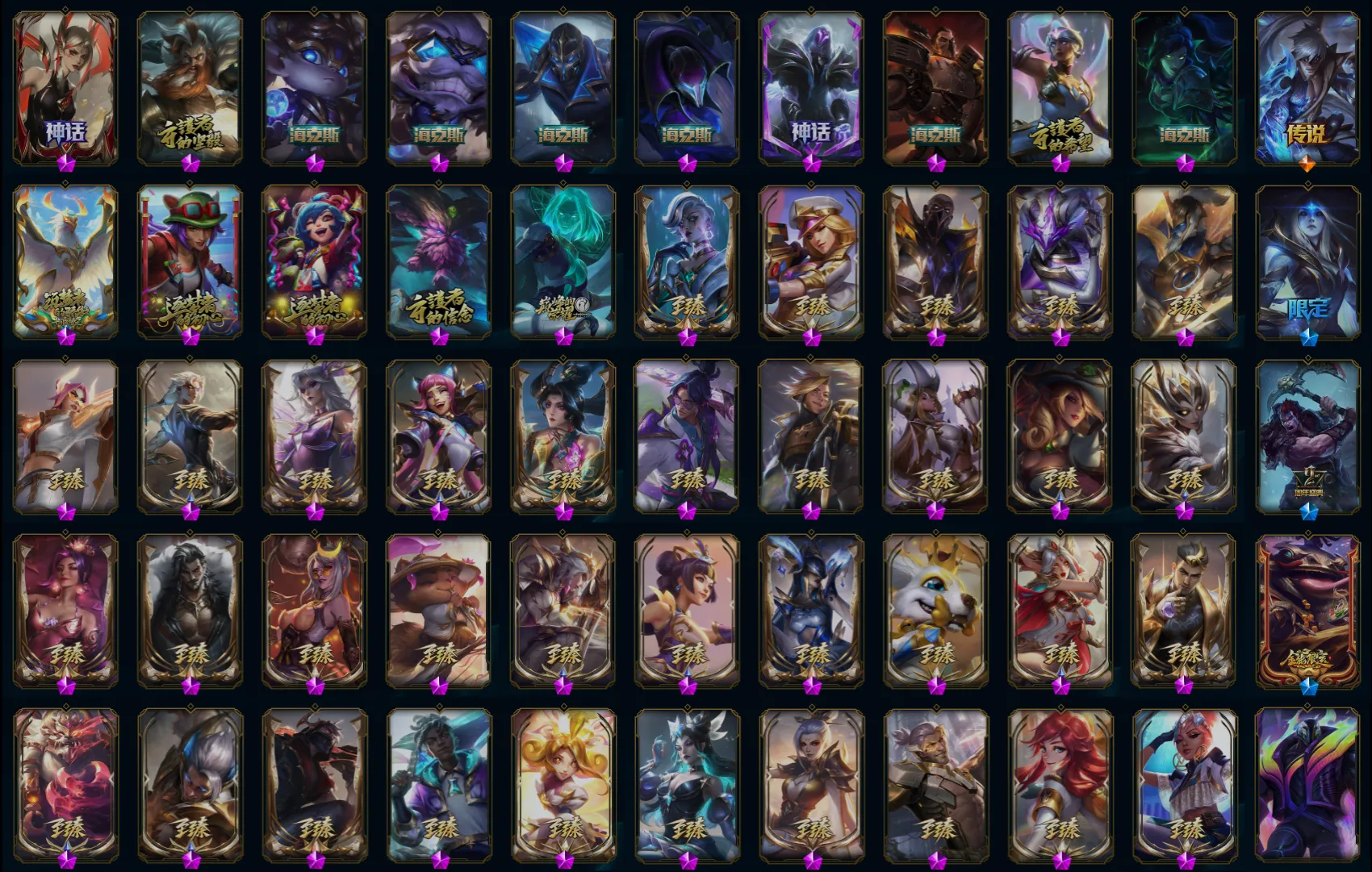 【传说皮肤】月蚀骑士蕾欧娜 暗星尊烬 约德尔国队长提莫 日蚀骑士希维尔 恶魔男爵瑞兹 星之守护者洛 星之守护者拉克丝 西部魔影大小姐蕾欧娜 泳池派对吉格斯 战斗学院伊泽瑞尔 黎明使者索拉卡 神龙尊者夜月幻龙亚索 光明哨兵格雷福斯 恶魔之刃泰达米尔 西部天使艾希 星之守护者阿卡丽 灵魂莲华锤石 焰尾妖狐阿狸 黯黑魔龙希瓦娜 鬼魂新娘莫甘娜 星之守护者霞 枯萎之壤泽拉斯 地狱之门卫士加里奥 幻灵战斗队长厄运小姐 金牌主播德莱文 暗星女王拉克丝 西部天使赛娜 战地机甲厄加特 暗星锤石 黎明使者永恩 银河魔装机神兰博 双重冰晶艾尼维亚 苍穹之光韦鲁斯 地狱行者孙悟空 提莫约德尔人的一大步 第三类接触黑默丁格 女警狙击凯特琳 战地巨兽科加斯 冰霜之刃艾瑞莉娅 苹果机器人布里茨 战场女武神凯尔 真实伤害艾克 奥德赛凯隐 女皇艾希 源计划超体莫德凯撒 电玩女神娑娜 铁哥们儿奥拉夫 女帝卡特琳娜 神龙尊者圣龙李青 上古战魂魔腾 黯晶凤凰艾尼维亚 蔷薇绅士杰斯 宇航员诺提勒斯 西部魔影卢锡安 偶像歌手阿狸 炼狱魔犬内瑟斯 腥红之月鬼武姬阿卡丽 霸天零式赛恩 钢铁军团盖伦 钢铁之翼凯尔 霸天异形卡兹克 神王德莱厄斯 神王盖伦 神拳李青 天煞劫 屠龙勇士潘森 源计划净化薇恩 最终BOSS维迦 女校长菲奥娜 红色男爵库奇 驯龙学者黑默丁格 合金巨兽努努和威朗普 星之守护者金克丝 律政大亨蒙多 陆地王者4WD布里茨 绅士科加斯 未来战士凯特琳 源计划林易 源计划联合艾希 死亡骑士盖伦 丧尸布兰德 星之守护者阿狸 烈焰雄心崔丝塔娜 灌篮高手德莱厄斯