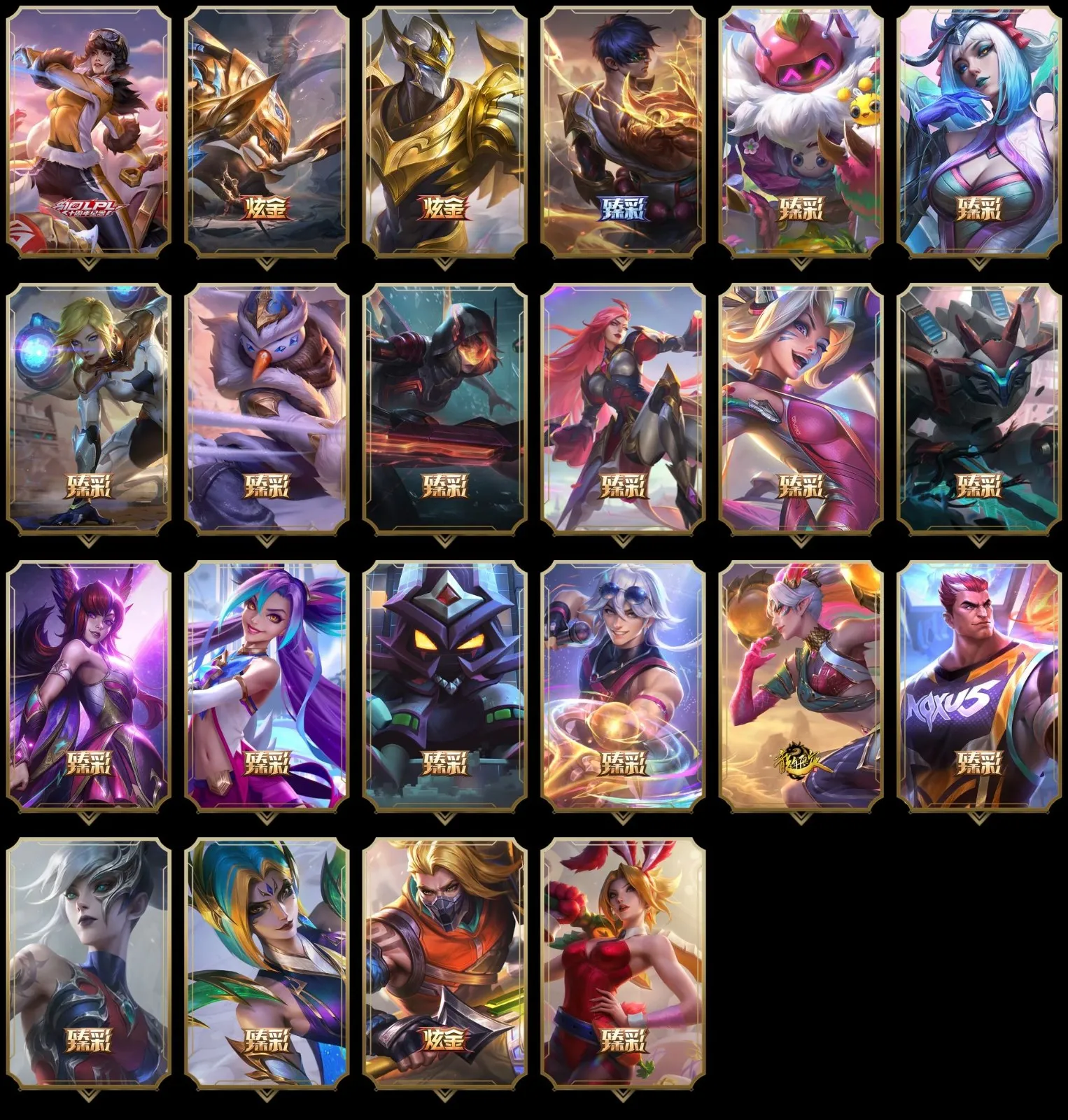 【重要炫彩】无畏骑士瑟庄妮赤子初心 冠军掠夺者卡兹克凯旋圣装 冠军之隐劫凯旋圣装 神龙尊者圣龙李青龙腾云起 可爱可爱粉红红布里茨 净雪之月莫甘娜冬虹 弹幕天使卡莎炽天使公正 持七彩冰棍的雪人易 源计划联合艾希红莲之弓 女帝卡特琳娜纹章之刻印英勇 幻灵战斗猫金克丝梦幻强袭 霸天战士雷恩加尔星啸天火 西部魔影卢锡安圣辉牛仔 星之守护者霞烈羽 星之守护者金克丝黑洞 天煞劫黑洞 最终BOSS维迦里大魔王 灰烬骑士派克余烬觉醒 永恒之森阿狸瑰蕾之尾 御星魔矢艾希焚寂星河 女帝卡特琳娜纹章神圣加冕礼 魔女乐芙兰贪婪 野火首领艾克不忘初心 时之砂艾克邪龙 不给糖就捣蛋艾克喧哗捣蛋鬼 五杀摇滚III遗失的章节凯尔迷幻 末世天使凯尔美德之翼 腥红之月易落樱 持糖果棒的雪人易 怨之砂派克绯幻 冲击之刃慎粉猫 可爱可爱粉红红提莫 小恶魔崔丝塔娜吉蒙里的妃子 星之守护者COS厄加特爱与正义 地狱火韦鲁斯骄傲之焰 永恒之森维迦致幻菇 古神沃里克贪婪 地狱火阿木木阿米的学徒 神凰行者瑞羽圣凰艾尼维亚仙翰 霸天龙神奥瑞利安索尔华天 宇航员巴德万有引力 地下都市梦魇德莱厄斯幻魅 宇航员茂凯万有引力 激萌鳄霸雷克顿 美喵喵尔 霸天零式赛恩毁灭余晖 EDG厄斐琉斯破军 EDG佛耶戈破军 EDG格雷福斯破军 EDG悠米破军 EDG佐伊破军 源计划暗影阿卡丽裂变 光明骑士奎因浪漫守望者 宇航员纳尔万有引力 暗影沃里克至真至诚 西部魔影赫卡里姆拜恩之势 光明哨兵薇恩都市抗击者 心之钢伊泽瑞尔天纵才华 天龙之子卡莎飞龙乘云 灌篮高手德莱厄斯金色神话 魔女阿卡丽虚荣 殿堂传奇乐芙兰登神 墨之影武者亚索金墨耀影 红莲之刃锐雯