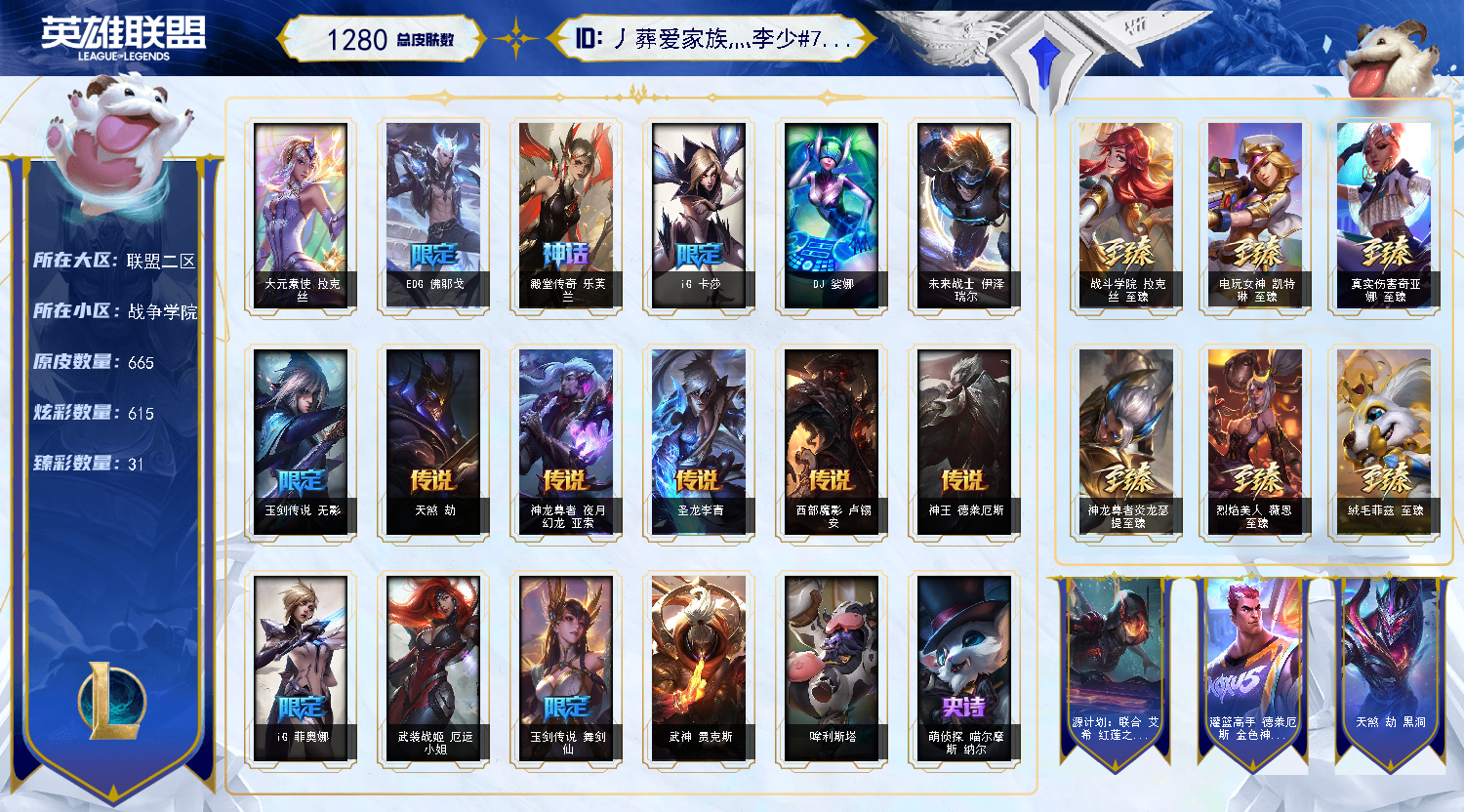 【重要皮肤】剪纸仙灵卡西奥佩娅至臻 狼神英灵斯维因至臻 T1杰斯至臻 北极星钢影卡蜜尔至臻 斗魂觉醒萨科至臻 斗魂觉醒派克至臻 DRX亚托克斯至臻 花仙使者卡特琳娜至臻 剪纸仙灵希维尔至臻 青花瓷丽桑卓至臻 灵魂莲华易至臻 星之守护者辛德拉至臻 星之守护者艾克至臻 西部魔影猎天使恶魔泰隆至臻 幻灵战斗猫金克丝至臻 青花瓷拉克丝至臻 神凰行者烈羽焰凰霞至臻 魅惑女巫莫甘娜至臻 女帝黛安娜至臻 魔女婕拉至臻 真实伤害亚索至臻 真实伤害赛娜至臻 灵魂莲华提莫至臻 灵能特工伊泽瑞尔至臻 福牛守护者菲奥娜至臻 源计划逆流塞拉斯至臻 神龙尊者炎龙瑟提至臻 黑夜使者凯隐至臻 神龙尊者均衡之龙沃利贝尔至臻 征服者贾克斯至臻 飞升战神潘森至臻 KDA二代卡莎至臻 KDA一代卡莎至臻 KDA阿狸至臻 KDA伊芙琳至臻 KDA阿卡丽至臻 战斗学院拉克丝至臻 烈焰美人薇恩至臻 烈焰美人薇恩2022至臻 电玩女神凯特琳至臻 魅惑女巫厄运小姐至臻 星之守护者妮蔻至臻 真实伤害奇亚娜至臻 真实伤害奇亚娜2022至臻 绒毛菲兹至臻 玉剑传说武剑仙至臻 殿堂传奇乐芙兰 灰烬骑士派克 海克斯科技吉格斯 海克斯科技波比 海克斯科技魔腾 永恒之森奥恩 光明哨兵奥拉夫 黎明使者卡尔玛 恐惧新星德莱厄斯 摄魂使者薇恩 荣誉使者玛尔扎哈 养蜂人辛吉德 勇敢的心德莱厄斯 电玩勇者锐雯 星之守护者伊泽瑞尔 玉剑传说无影 玉剑传说舞剑仙 神凰行者幽羽玄凰萨勒芬妮 神凰行者烈羽焰凰霞 女帝厄运小姐 玉剑传说无劫 玉剑传说舞龙卫 玉剑传说翼剑仙 星之守护者佐伊 灵能特工易 点心宝贝阿木木 天龙之子斯莫德 剪纸仙灵艾瑞莉娅 剪纸仙灵希维尔 剪纸仙灵盖伦 剪纸仙灵婕拉 剪纸仙灵加里奥 虎头虎脑崔丝塔娜 烈焰仙子黛安娜 龙腾虎跃瑟提 猛虎下山赵信 招财进宝提莫 金猪烈焰瑟庄妮 烈焰美人薇恩 纳财大帝塔姆 福牛守护者安妮 福牛守护者厄斐琉斯 福牛守护者德莱厄斯 福牛守护者阿利斯塔 福牛守护者嘉文四世 福牛守护者菲奥娜 碎心之拳蔚 甜心之羽霞 甜心之翎洛 甜心宝贝安妮 甜心宝贝娑娜 穿心之剑菲奥娜 觅心游侠卢锡安 觅心魔灵奥莉安娜 觅心女王艾希 觅心之翼奎因 觅心猎手薇恩 双城之战2微光实验室辛吉德 冰雪驯鹿波比 持胡萝卜的雪人易 冰雪女神辛德拉 魄罗骑士瑟庄妮 平安夜女神娑娜 魅惑女巫伊莉丝 灵魂收割者索拉卡 小恶魔菲兹 南瓜头王子阿木木 海之歌艾希 泳池派对黑默丁格 泳池派对厄运小姐 泳池派对格雷福斯 泳池派对李青 泳池派对蕾欧娜 泳池派对雷克顿 御星魔矢艾希 克格汪 制胜金靴李青 EDG厄斐琉斯 EDG佛耶戈 EDG格雷福斯 EDG悠米 EDG佐伊 iG卡蜜尔 iG洛 iG卡莎 iG艾瑞莉娅 iG乐芙兰 iG菲奥娜 SKTT1辛德拉 SKTT1瑞兹 SKTT1贾克斯 SKTT1劫 SKTT1婕拉 暗杀星奥莉安娜 暗杀星蒙多 暗杀星努努和威朗普 暗杀星慎 冰雪节玛尔扎哈 防暴士兵辛吉德 冠军典狱长锤石 冠军掠夺者卡兹克 冠军蔷薇乐芙兰 冠军之矛卡莉丝塔 冠军之刃锐雯2016 冠军之血希瓦娜 冠军之隐劫 冠军之志瑞兹 鬼影森森茂凯 鬼影重重魔腾 胡桃夹子萨科 惊悚派对阿木木 警用试作体K9内瑟斯 密林猎手提莫 南瓜头费德提克 女猎手希维尔 破空枪骑孙悟空 圣诞开心鬼提莫 圣诞狂欢基兰 圣诞狂欢努努和威朗普 圣诞老人古拉加斯 无头骑士赫卡里姆 邪恶圣诞老人维迦 幸福女神乐芙兰 雪默丁格 雪装奈德丽 野兽猎人德莱文 野兽猎人泰达米尔 英勇玩具兵普朗克 暗影沃里克 冠军之箭艾希 2022全球总决赛阿兹尔 2021全球总决赛嘉文四世 都铎王朝图奇 十五周年纪念希维尔 十周年纪念安妮 源代码乐芙兰 神凰行者瑞羽圣凰艾尼维亚 暗裔英雄盖伦 DJ娑娜 大元素使拉克丝 灵魂守卫乌迪尔 未来战士伊泽瑞尔 武装战姬厄运小姐 绝息圣堂洛