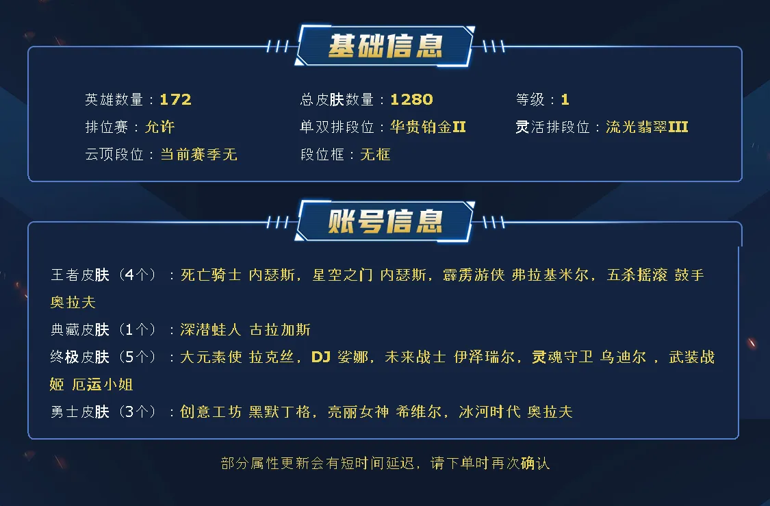 ~~喜欢记得收藏~~可排位~~1119皮全英雄~~租之前尽量查一下游戏ID,确保段位是您需要的,避免浪费您的时间~~请勿挂机逃跑故意送人头,谢谢合作,谢谢~~