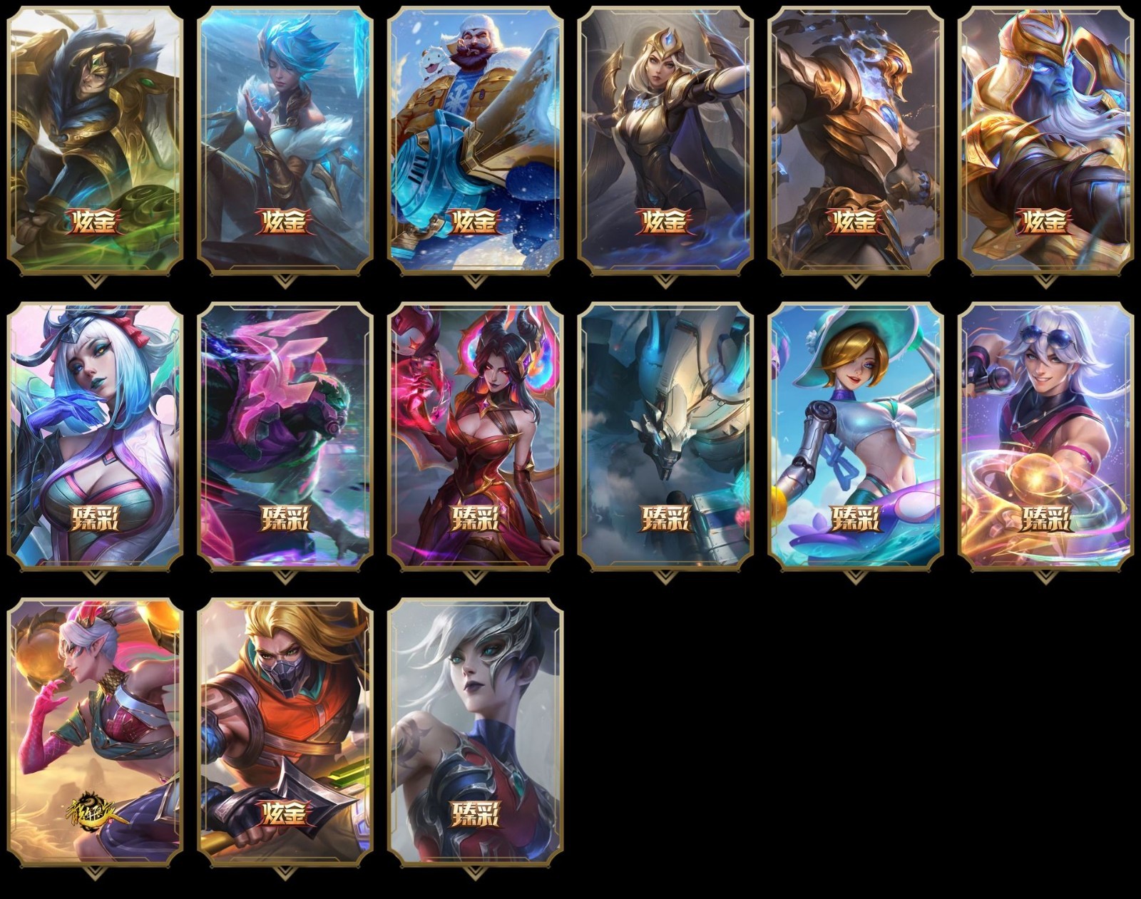 【重要皮肤】魔女婕拉至臻 奥术师佐伊至臻 真实伤害赛娜至臻 灵魂莲华提莫至臻 灵能特工伊泽瑞尔至臻 源计划逆流塞拉斯至臻 王国机神玄武盖伦至臻 暗星墨菲特至臻 神龙尊者炎龙瑟提至臻 KDA二代卡莎至臻 战斗学院拉克丝至臻 战斗学院拉克丝2022至臻 源计划正义艾瑞莉娅至臻 源计划正义艾瑞莉娅2022至臻 玉剑传说武剑仙至臻 玉剑传说武剑仙2022至臻 腥红之月亚托克斯至臻 腥红之月亚托克斯2022至臻 未来战士锤石至臻 未来战士锤石2022至臻 黑夜使者李青至臻 黑夜使者李青2022至臻 海克斯科技雷克顿 海克斯科技斯维因 海克斯科技玛尔扎哈 海克斯科技阿利斯塔 暗星科加斯 黎明使者卡尔玛 恐惧新星德莱厄斯 新创战纪希维尔 胜利剑圣易 胜利女神娑娜 胜利之王泰达米尔 胜利巨口克格莫 创星之灵璐璐 荣誉使者玛尔扎哈 安妮梦游仙境 电玩女神厄运小姐 电玩勇者锐雯 电玩女神阿狸 星之守护者伊泽瑞尔 玉剑传说无影 星之守护者佐伊 灵能特工易 银龙裁决泰隆 神龙烈焰金克丝 碧玉之牙卡西奥佩娅 古琴余韵娑娜 春晖神女拉克丝 你看见过我的熊猫吗安妮 北辰之威内瑟斯 南天之怒沃里克 美猴王孙悟空 玉净夜叉凯特琳 广寒仙子嫦娥 张辽文远 金猪烈焰瑟庄妮 烈焰美人薇恩 纳财大帝塔姆 神龙之翼库奇 王国机神青龙德莱文 王国机神朱雀蕾欧娜 王国机神苍狼瑟提 王国机神白虎贾克斯 王国机神玄武盖伦 胜利女神瑟庄妮 胜利之树茂凯 胜利机器人布里茨 胜利女神奥莉安娜 胜利枪神格雷福斯 胜利枪神卢锡安 胜利之剑亚托克斯 碎心之拳蔚 甜心之翎洛 甜心宝贝安妮 穿心之剑菲奥娜 觅心女王艾希 觅心萝莉金克丝 觅心猫猫悠米 觅心猎手薇恩 寒冬精灵璐璐 冬季仙境奥莉安娜 圣诞老人布隆 圣诞老人德莱文 冰雪驯鹿波比 冰雪女神辛德拉 魄罗骑士瑟庄妮 平安夜女神娑娜 魅惑女巫莫甘娜 魅惑女巫奈德丽 魅惑女巫伊莉丝 大魔法锅布里茨 大魔王提莫 泳池派对凯特琳 泳池派对佐伊 泳池派对普朗克 泳池派对辛德拉 泳池派对奥莉安娜 泳池派对塔莉垭 泳池派对塔里克 泳池派对格雷福斯 泳池派对蕾欧娜 电玩战魂赫卡里姆 斩星魔剑易 穿星魔锋赵信 御星魔矢艾希 送披萨的小姐姐希维尔 鸡里奥 克格汪 制胜金靴李青 制胜金球拉莫斯 FPX锤石 FPX薇恩 FPX李青 FPX普朗克 FPX墨菲特 iG卡蜜尔 iG洛 iG卡莎 iG艾瑞莉娅 iG乐芙兰 iG菲奥娜 SSG洛 SSG塔莉垭 SSG伊泽瑞尔 SKTT1辛德拉 SKTT1艾克 SKTT1阿利斯塔 SKTT1伊莉丝 SKTT1雷克顿 SSW锤石 SSW雷恩加尔 SSW泰隆 SSW图奇 SSW辛吉德 SKTT1贾克斯 SKTT1薇恩 暗杀星蒙多 暗杀星努努和威朗普 暗杀星慎 Fnatic迦娜 Fnatic库奇 Fnatic古拉加斯 Fnatic嘉文四世 冰雪节格雷福斯 冰雪节玛尔扎哈 冰雪节辛吉德 冰雪兽纳尔 防暴机器人布里茨 防暴士兵格雷福斯 防暴士兵辛吉德 防暴天使凯尔 钢铁之翼艾尼维亚 冠军典狱长锤石 冠军之矛卡莉丝塔 冠军之血希瓦娜 鬼影森森茂凯 鬼影重重魔腾 海贼瑞兹 红桃杰克崔斯特 胡桃夹子萨科 惊悚派对阿木木 惊悚派对费德提克 警用试作体K9内瑟斯 密林猎手提莫 南瓜头费德提克 破空枪骑孙悟空 圣诞精灵崔丝塔娜 圣诞开心鬼提莫 圣诞老人古拉加斯 圣诞玩偶波比 圣诞驯鹿克格莫 糖果使徒费德提克 外星装甲库奇 无头骑士赫卡里姆 喜庆之树茂凯 邪恶圣诞老人维迦 幸福女神乐芙兰 雪默丁格 雪装奈德丽 野兽猎人德莱文 野兽猎人瑟庄妮 永恒之森乐芙兰 勇者阿狸 征服者诺提勒斯 暗影沃里克 冠军之箭艾希 诺斯费拉图弗拉基米尔 战场BOSS吉格斯 阿木木主人不要我了 波比的巧克力工坊 地底世界崔斯特 都铎王朝图奇 十五周年纪念希维尔 十周年纪念安妮 源代码乐芙兰 神凰行者瑞羽圣凰艾尼维亚 胜利凤凰艾尼维亚 DJ娑娜 大元素使拉克丝 灵魂守卫乌迪尔 未来战士伊泽瑞尔 武装战姬厄运小姐 绝息圣堂洛