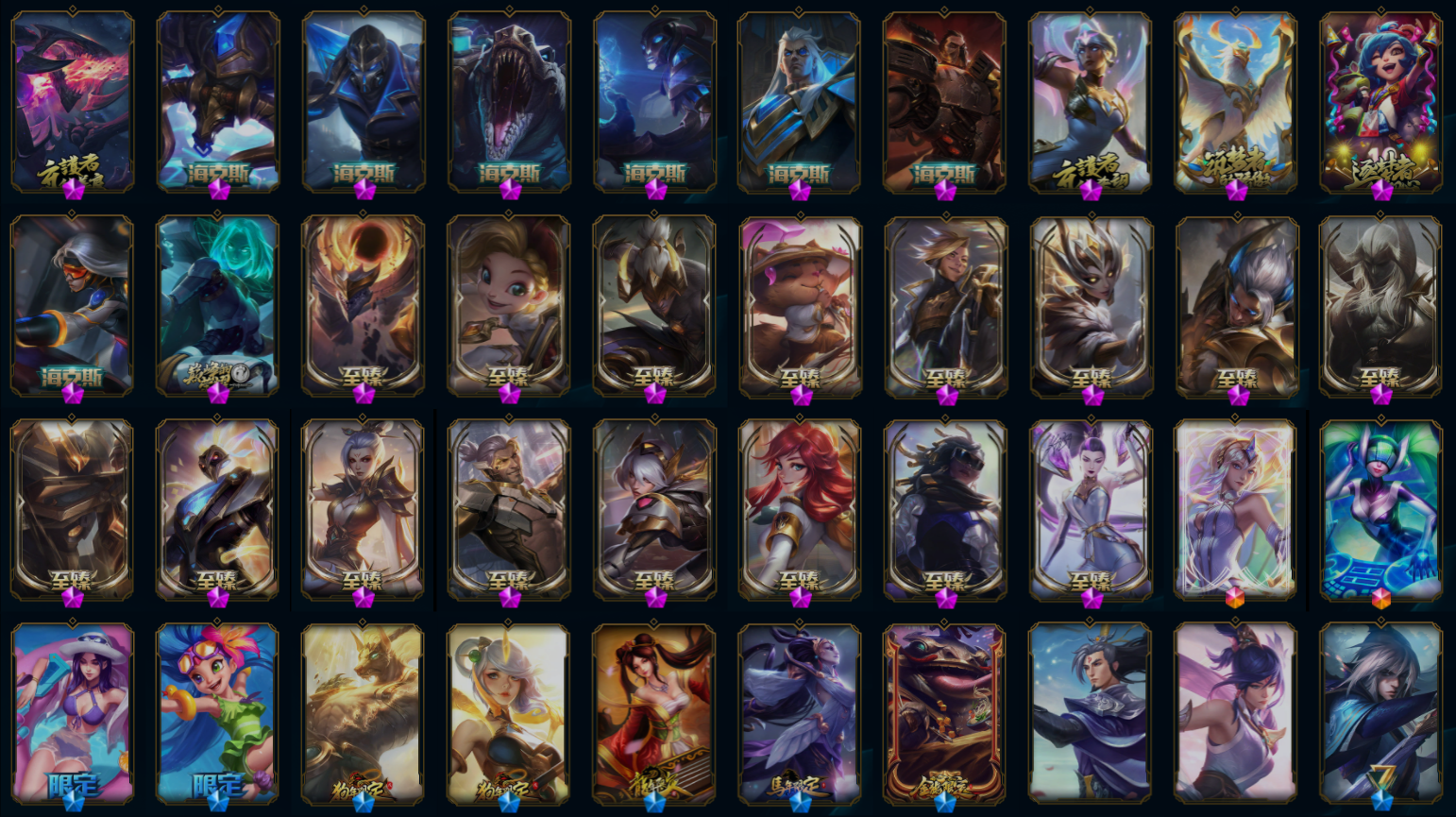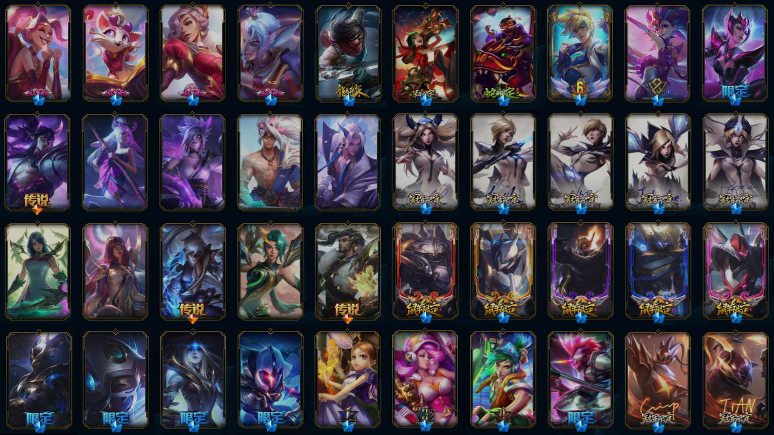 【传说皮肤】冰川巨兽墨菲特 鬼魂新娘莫甘娜 恶魔之刃泰达米尔 神龙尊者昼日真龙亚索 陆地王者4WD布里茨 欧米伽小队幽灵特工 大天使长米迦勒凯尔 焰尾妖狐阿狸 源计划毁灭派克 宇航员诺提勒斯 提莫约德尔人的一大步 真实伤害艾克 蔷薇绅士杰斯 苹果机器人布里茨 霸天异形卡兹克 约德尔国队长提莫 女警狙击凯特琳 冰霜之刃艾瑞莉娅 炼狱魔犬内瑟斯 神王德莱厄斯 第三类接触黑默丁格 黎明使者锐雯 符文战熊沃利贝尔 奥德赛凯隐 源计划林易 屠龙勇士潘森 血石领主弗拉基米尔 女主播迦娜 偶像歌手阿狸 铁哥们儿奥拉夫 电玩女神娑娜 灌篮高手德莱厄斯 战斗学院伊泽瑞尔 枯萎之壤泽拉斯 女皇艾希 最终BOSS维迦 神龙尊者圣龙李青 太空律动猫猫布里和里茨 银河魔装机神兰博 合金巨兽努努和威朗普 腥红之月鬼武姬阿卡丽 星之守护者霞 女校长菲奥娜 星之守护者拉克丝 暗星锤石 金牌主播德莱文 钢铁军团盖伦 恶魔男爵瑞兹 冰霜亚龙希瓦娜 日蚀骑士蕾欧娜 驯龙炮手崔丝塔娜 星之守护者金克丝 战地巨兽科加斯 丧尸布兰德 苍穹之光韦鲁斯 战地机甲厄加特 绅士科加斯 驯龙学者黑默丁格 源计划净化薇恩 泳池派对吉格斯 魔幻卡牌崔斯特 霸天零式赛恩 源计划联合艾希 灵魂莲华锤石 战场女武神凯尔 律政大亨蒙多 黯黑魔龙希瓦娜 黯晶凤凰艾尼维亚 烈焰雄心崔丝塔娜 地狱之门卫士加里奥 死亡骑士盖伦 上古战魂魔腾 钢铁之翼凯尔 邪鸦魅影乐芙兰 红色男爵库奇 双重冰晶艾尼维亚 未来战士凯特琳