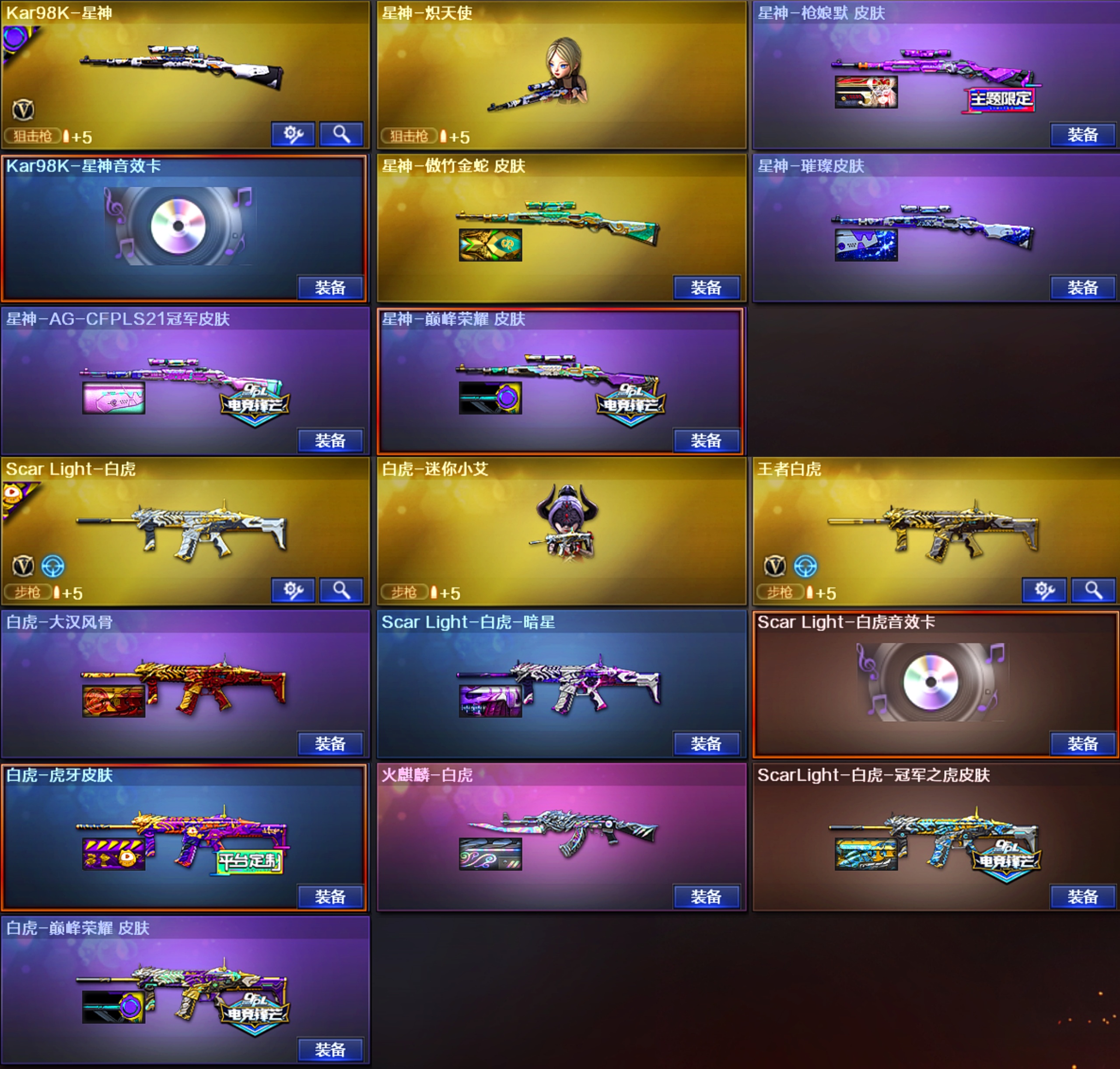 【传说星骇-幽瞳-辉光-幽冥-神秘礼盒】【荣耀之魄-CFPL十周年臻藏版】【M200-幻神】【幻神-AG-CFPLS24-荣耀世冠白鲨2023 -Heartshot -星火小队-星耀 皮肤-CFS2022-M200-幻神音效卡】【Kar98K-星神】【星神-AG-CFPLS21-傲竹金蛇 -巅峰荣耀 -璀璨-枪娘默 】【Kar98K-星神音效卡】【AWM-裁决音效卡】【裁决-流光-异化之源 皮肤】【Scar Light-白虎】【白虎-冠军之虎-虎牙皮-巅峰荣耀 -大汉风骨-暗星】【Scar Light-白虎音效卡】【QBZ03-金色蔷薇】【QBZ03-传奇宠儿-冠军之薇-量子蔷薇 --拼搏-破浪逐光 皮-虎鱼 -荣耀世冠-CFS2024 -纸灯龙皮肤】【QBZ03-金色蔷薇音效卡】
