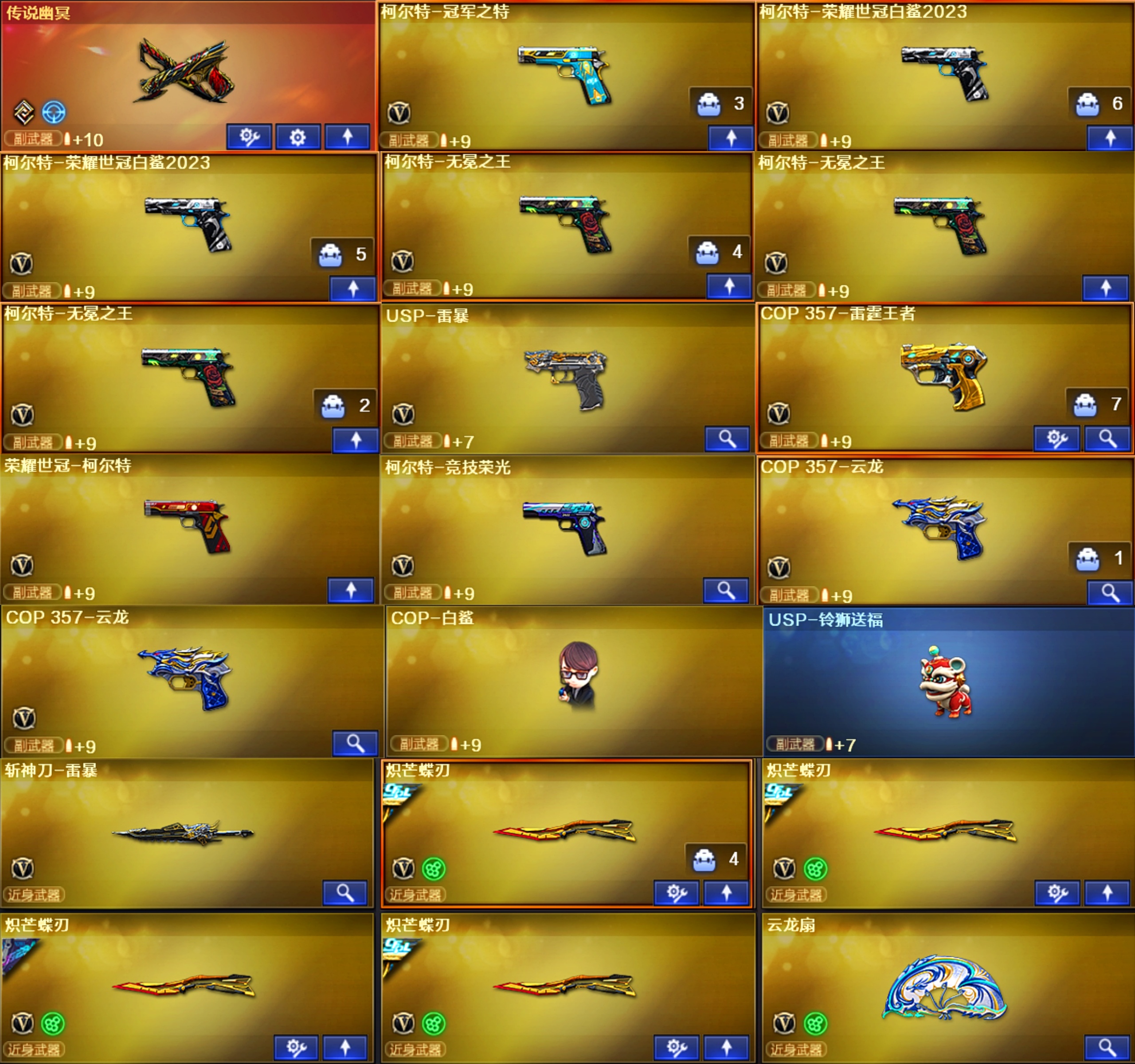 【G36C-幻影】【QBZ191-银翼游侠【柯尔特-荣耀世冠白鲨2023】【USP-雷暴】【柯尔特-冠军之特】【柯尔特-无冕之王】【荣耀世冠-柯尔特】【柯尔特-竞技荣光】【COP 357-云龙】【COP 357-雷霆王者-觉醒版】【Knife-冠军之刃】