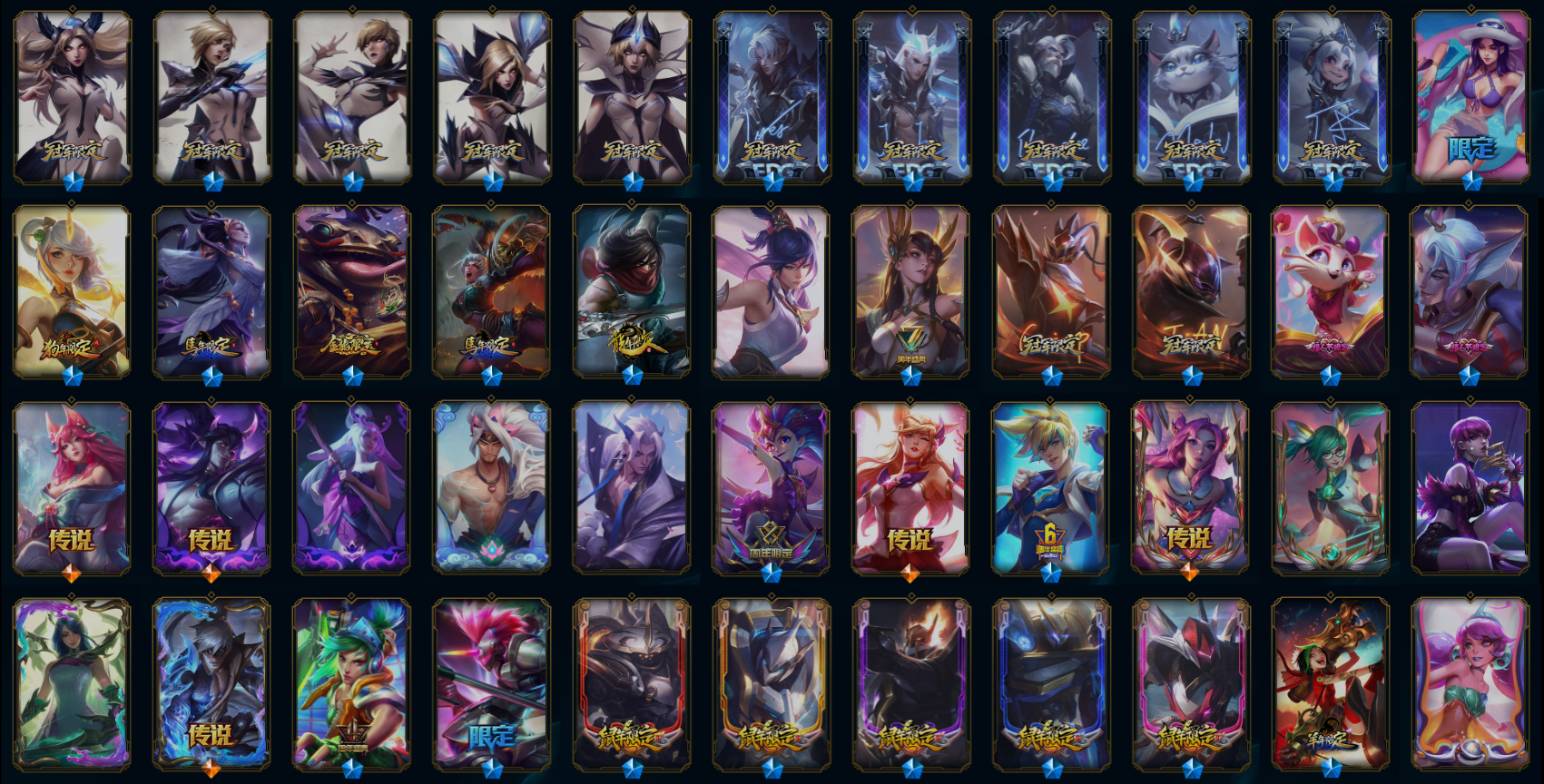 【传说皮肤】灵魂莲华阿狸 炼狱魔犬内瑟斯 星之守护者卡莎 青花瓷伊泽瑞尔 钢铁之翼凯尔 魔女伊芙琳 源计划泯灭雷克顿 源计划超体莫德凯撒 焰尾妖狐阿狸 女警狙击凯特琳 电玩女神娑娜 泳池派对吉格斯 冰霜之刃艾瑞莉娅 战场女武神凯尔 死亡骑士盖伦 苍穹之光韦鲁斯 约德尔国队长提莫 邪鸦魅影乐芙兰 最终BOSS维迦 神龙尊者圣龙李青 灵能特工娑娜 上古战魂魔腾 灵魂莲华锤石 奥德赛凯隐 西部天使赛娜 女校长菲奥娜 黯晶凤凰艾尼维亚 恶魔男爵瑞兹 星之守护者阿狸 战地巨兽科加斯 魔幻卡牌崔斯特 神王德莱厄斯 黑夜使者亚索 霸天异形卡兹克 至尊魔女莫甘娜 暗星尊烬 西部天使艾希 天煞劫 战斗学院伊泽瑞尔 苹果机器人布里茨 陆地王者4WD布里茨 耀星女神拉克丝 暗星女王拉克丝 日蚀骑士蕾欧娜 源计划联合艾希 星之守护者拉克丝 女皇艾希 枯萎之壤泽拉斯 鬼魂新娘莫甘娜 女主播迦娜 红色男爵库奇 律政大亨蒙多 合金巨兽努努和威朗普 未来战士凯特琳 第三类接触黑默丁格 驯龙学者黑默丁格 双重冰晶艾尼维亚 黯黑魔龙希瓦娜 战地机甲厄加特 星之守护者金克丝 神拳李青 符文战熊沃利贝尔 冰霜亚龙希瓦娜 蔷薇绅士杰斯 血石领主弗拉基米尔 黎明使者索拉卡 黑夜使者索拉卡 霸天零式赛恩 暗星锤石 西部魔影卢锡安 冰川巨兽墨菲特 真实伤害艾克 地狱之门卫士加里奥 源计划净化薇恩 星之守护者洛 星之守护者霞 宇航员诺提勒斯 银河魔装机神兰博 屠龙勇士潘森 黎明使者锐雯 烈焰雄心崔丝塔娜 钢铁军团盖伦 绅士科加斯 铁哥们儿奥拉夫 提莫约德尔人的一大步 大天使长米迦勒凯尔 源计划毁灭派克 灌篮高手德莱厄斯