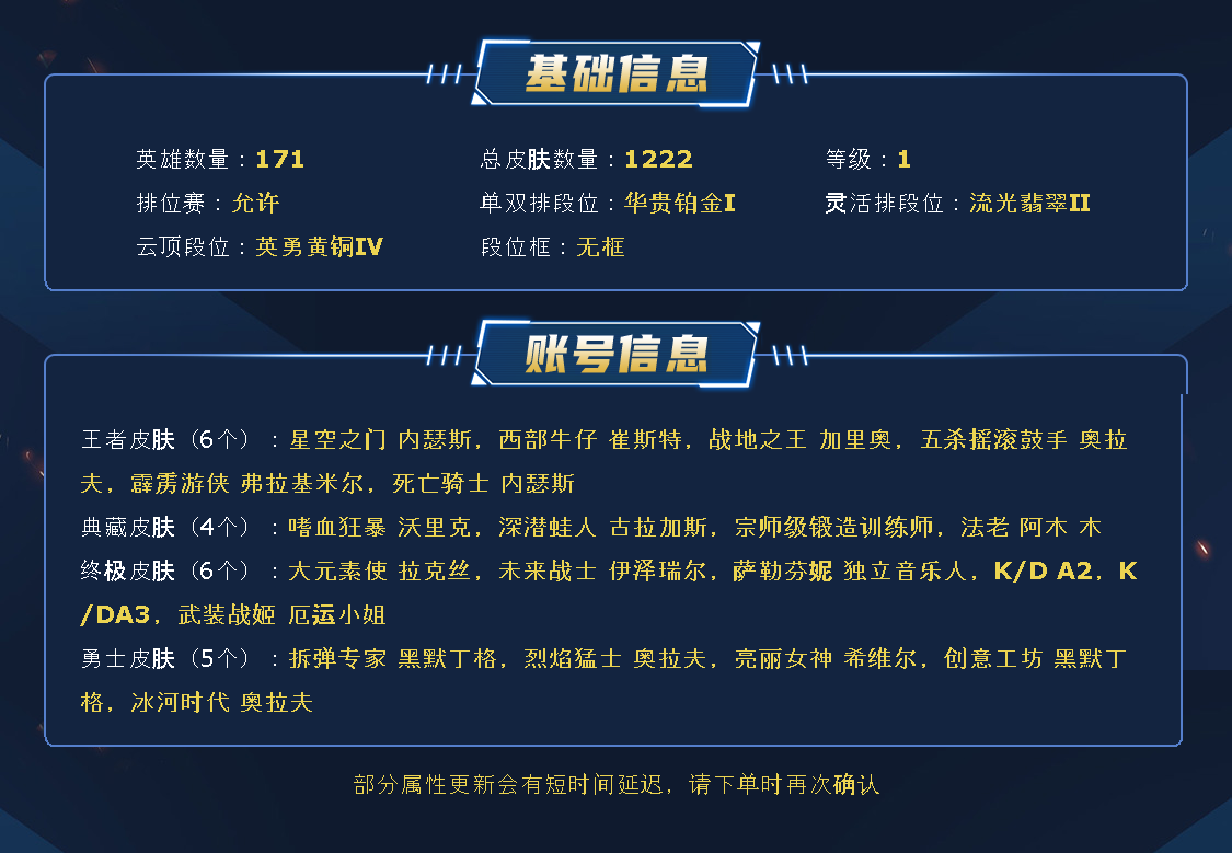 ~~喜欢记得收藏~~可排位~~1217皮全英雄丨922原皮295炫彩~~租之前尽量查一下游戏ID,确保段位是您需要的,避免浪费您的时间~~请勿挂机逃跑故意送人头,谢谢合作,谢谢~~