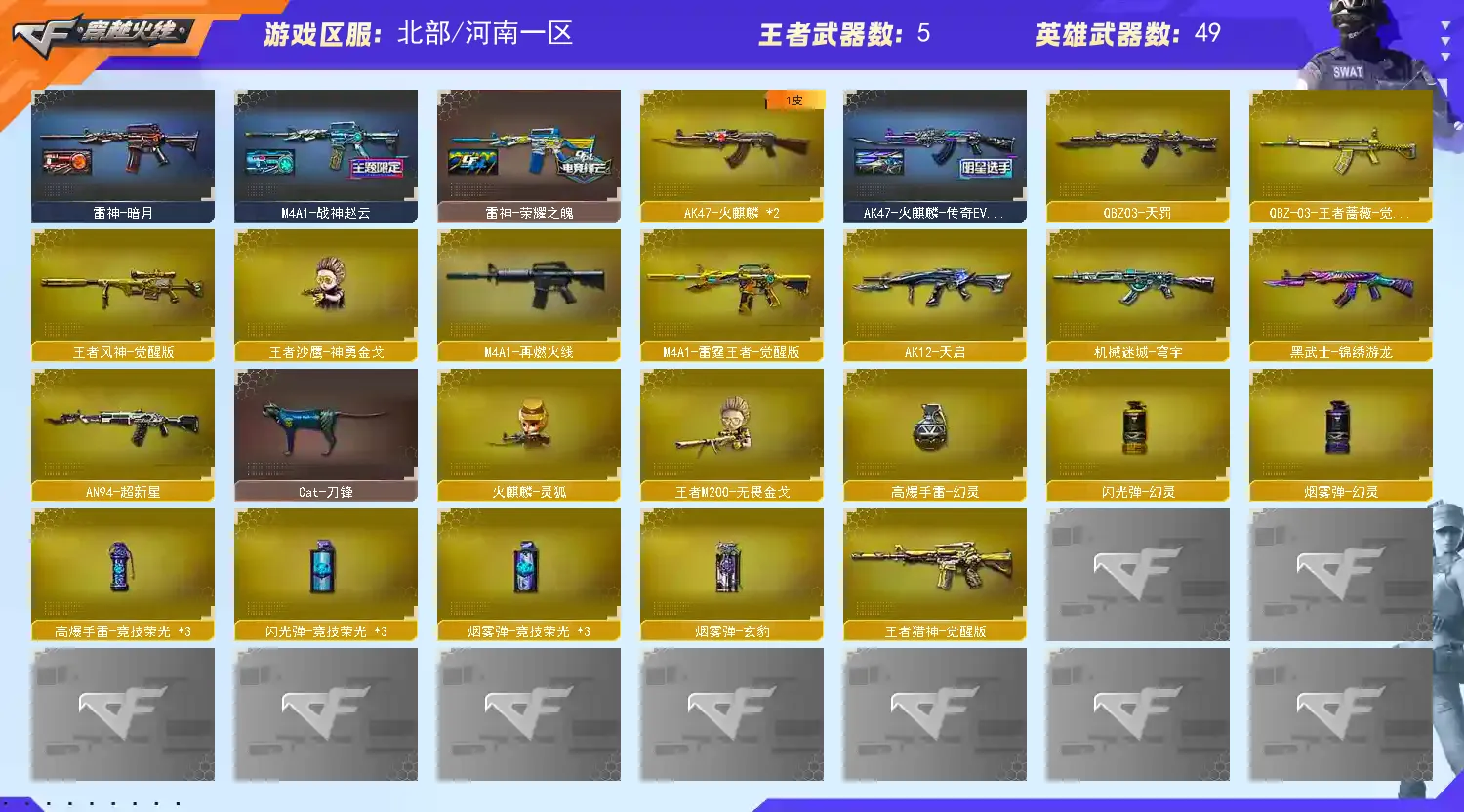 【亮点解析 幻神7皮 星神三件套 裁决三件套 】【m200幻神+ag24冠军+传奇欧欧+星耀 +纸灯龙+电流骇客+冠军之幻+荣耀世冠白鲨+冠军之刃】【98k星神+音效卡+巅峰荣耀+呛娘】【王者风神】【g36c幻影】【scar玄豹】【qbz金色蔷薇+ag19冠军+巅峰荣耀】【qbz天罚+卡】【火麒麟+even】【雷神+白鲨冠军+荣耀之魄+巅峰荣耀】【裁决+卡+巅峰荣耀】 【武器:天戒 雷霆王者 qbz王者蔷薇 王者猎神 炼狱 烈龙*4】 【6手呛:天神*5 修罗 】 【6刀具:麒麟刺*4 尼泊尔雷霆 竞技荣光 】 【4雷套:幻灵雷 竞技荣光雷*3】 【小人呛:火麒麟灵狐 幻神呛娘爱丽丝 毁灭孙三炮 cop白鲨 王者沙鹰 斯太尔呛娘暗刃 】 【音效卡:天罚音效卡 星神音效卡 裁决音效卡 】 【四防角色:王者春 王者影豹 职业经理 】