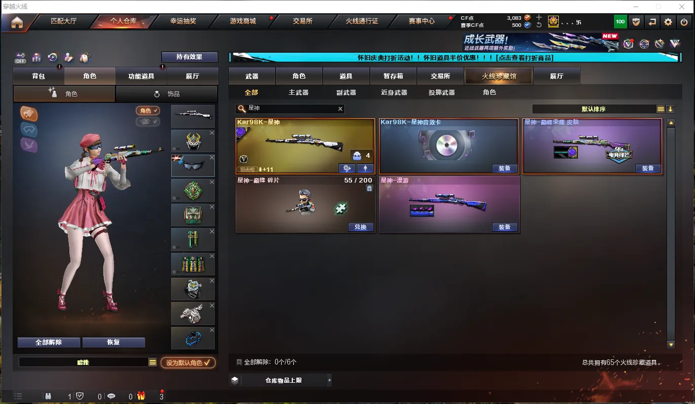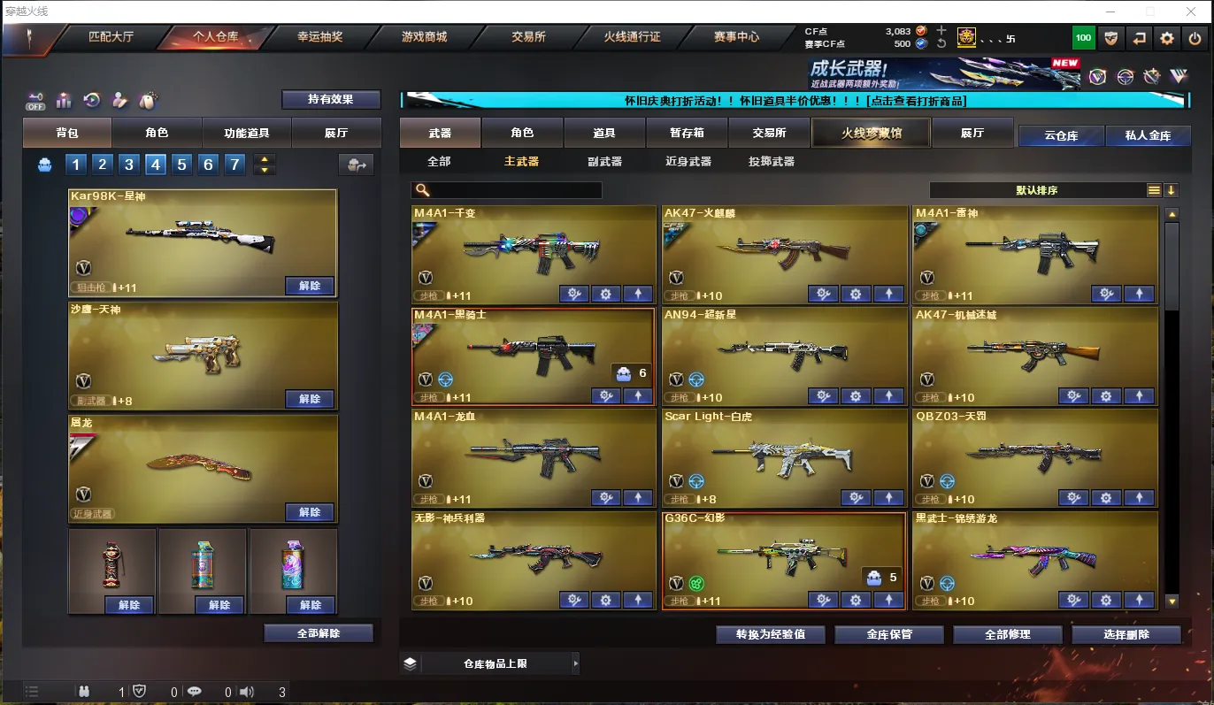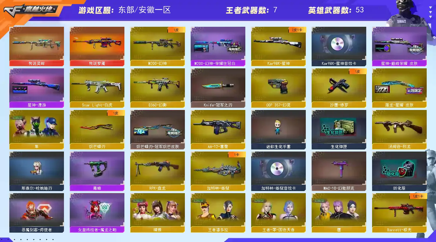 【★★传说梦魇★★】【★★传说灵眸★★】【m200-幻神带幻神-荣耀世冠白鲨皮肤】【98k星神带星神-巅峰荣耀皮肤带星神-漫游皮肤带音效卡】【knife-冠军之刃】【scar白虎】【g36c-幻影】【炽芒蝶刃】【斯泰尔-呛娘暗刃】【四防角色晴雅】狙击呛:【传说梦魇】【传说灵眸】【m200-幻神】【98k星神】【毁灭×2】【极光】【barrett-暗月传说】【王者之光--王者风神】【awm-裁决-百城联赛天津】步呛:【scar白虎】【g36c-幻影】【千变】【火麒麟】【雷神】【黑骑士】【an94-超新星】【ak47-机械迷城】【m4a1-龙血】【qbz03-天罚】【无影-神兵利器】【黑武士-锦绣游龙】【金色蔷薇-古蛇迷踪】【王者之势--王者青龙--王者芳薇】【qbz-03-王者蔷薇】【m4a1-苍鸣雷神】【hk417-朱雀-蛇隐宗】机呛:【盘龙】【炼狱】冲锋呛:【烈龙】【烈龙-云海游龙】【斯泰尔-呛娘暗刃】手呛:【cop357-幻灵】【修罗-古蛇迷踪】刀具:【knife-冠军之刃】【炽芒蝶刃】【屠龙 龙啸 擎天 麒麟刺 尼泊尔-雷霆 幻灵之锋 磨刀-神工天巧 擎天-云海游龙 王者玉锋】手雷:【雷霆高爆手雷 雷暴高爆手雷 幻灵高爆手雷 竞技荣光高爆手雷 云海游龙手雷 古蛇迷踪高爆手雷 雷霆闪光丹手雷套×2】音效卡:【炼狱音效卡 星神音效卡 极光音效卡 烈火-动感闪耀音效卡 擎天-云海游龙音效卡 黑骑士音效卡 修罗-古蛇迷踪音效卡 屠龙-云海游龙音效卡】角色:【四防角色晴雅】【四防角色灵狐者-职业经理】【四防角色 王者-零-国色天香】【鹰 隼 蛇隐宗 王者潘多拉 云海玲珑】皮肤:【m200-幻神-荣耀世冠白鲨】【星神-巅峰荣耀 星神-漫游】【烈火-动感闪耀】【屠龙-星耀】【炽芒蝶刃-冠军炽芒】