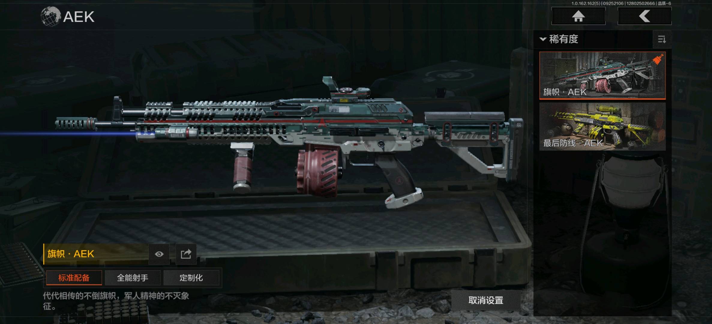 竞技FAL,告丧夜曲AUG,旗帜AEK,棱光裂变AKM,来战AKM,骤羽尖啸M4A1,德尔塔小队M4A1,炎夏浪花H416,自喷网格H416,竞技MDR,北国内卫MDR,棱光裂变AK102,竞技AUG,极恶AUG,棱光裂变AK74N,来战AK74N,骑士之剑AKS74U,最后防线AEK,炎夏浪花AR57,涂绘猎人AR57,棱光裂变ACE31,骑士之剑ACE31,湖冰倒影ACE31,北国内卫AN94,阴影AN94,彻甲铜斑T951,玄戈梨花T03,彻甲铜斑T03,林地数码T03,骤羽尖啸AK12,07式林地迷彩QBZ191;