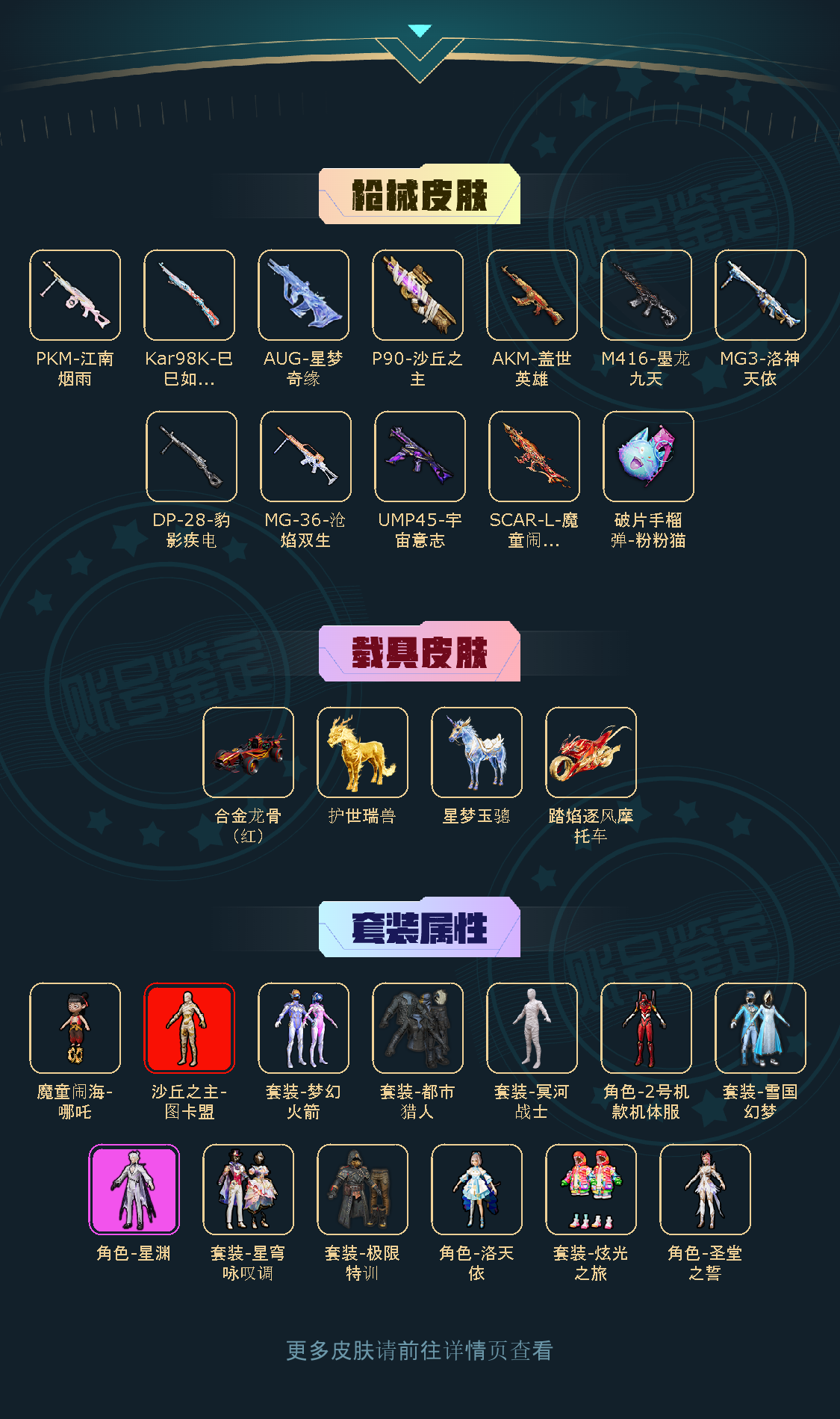 11粉,4载具,119套装,满级木乃伊,15王牌印记,绝世王牌21星历史最高段,98508热力值 Vector-绯穹魔姬/AKM-盖世英雄/AUG-星梦奇缘/M416-墨龙九天/SCAR-L-魔童闹海 哪吒/MG3-洛神天依/PKM-江南烟雨/MG-36-沧焰双生/DP-28-豹影疾电/UMP45-宇宙意志/P90-沙丘之主/破片手榴弹-粉粉猫爪/Kar98K-巳巳如意/合金龙骨(红)/护世瑞兽/星梦玉骢/踏焰逐风摩托车/