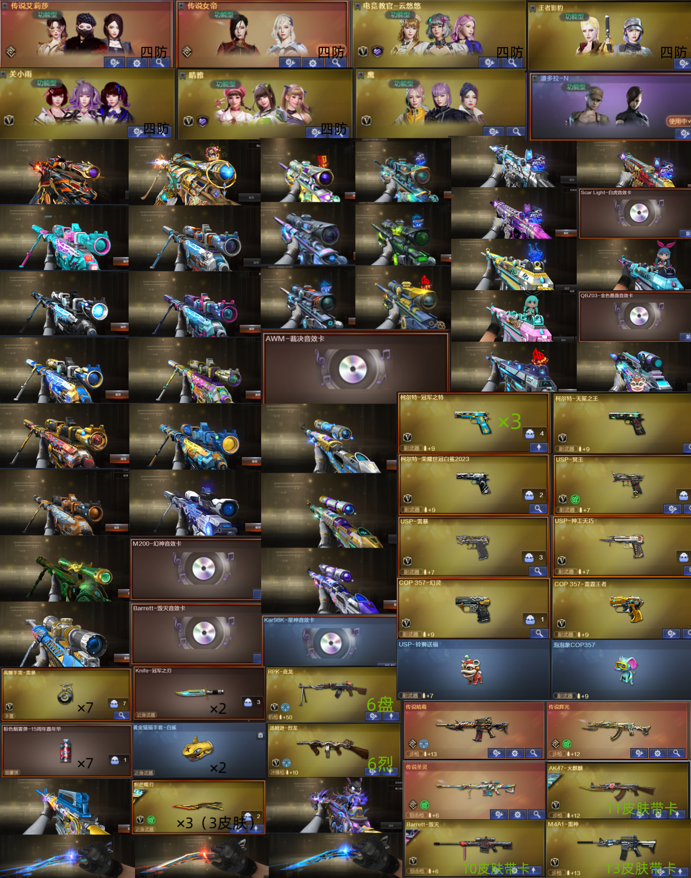 女帝金名、灵眸 幽瞳&幻神11皮肤、星神3皮三件套&裁决6皮三件套、手枪大满配、2个冠军之刃、15张音效卡、G36c、3蝴蝶刀带3皮肤、6盘6烈、八面玲珑