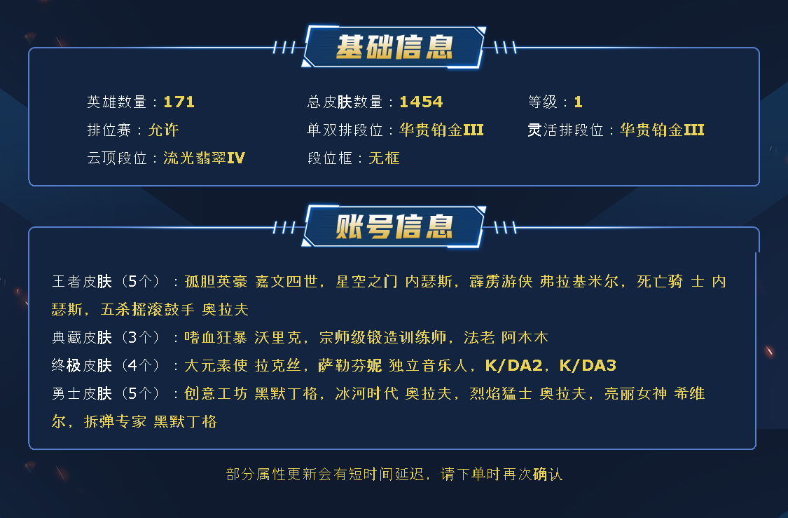 ~~喜欢记得收藏~~可排位~~1454皮全英雄丨946原皮508炫彩~~租之前尽量查一下游戏ID,确保段位是您需要的,避免浪费您的时间~~请勿挂机逃跑故意送人头,谢谢合作,谢谢~~