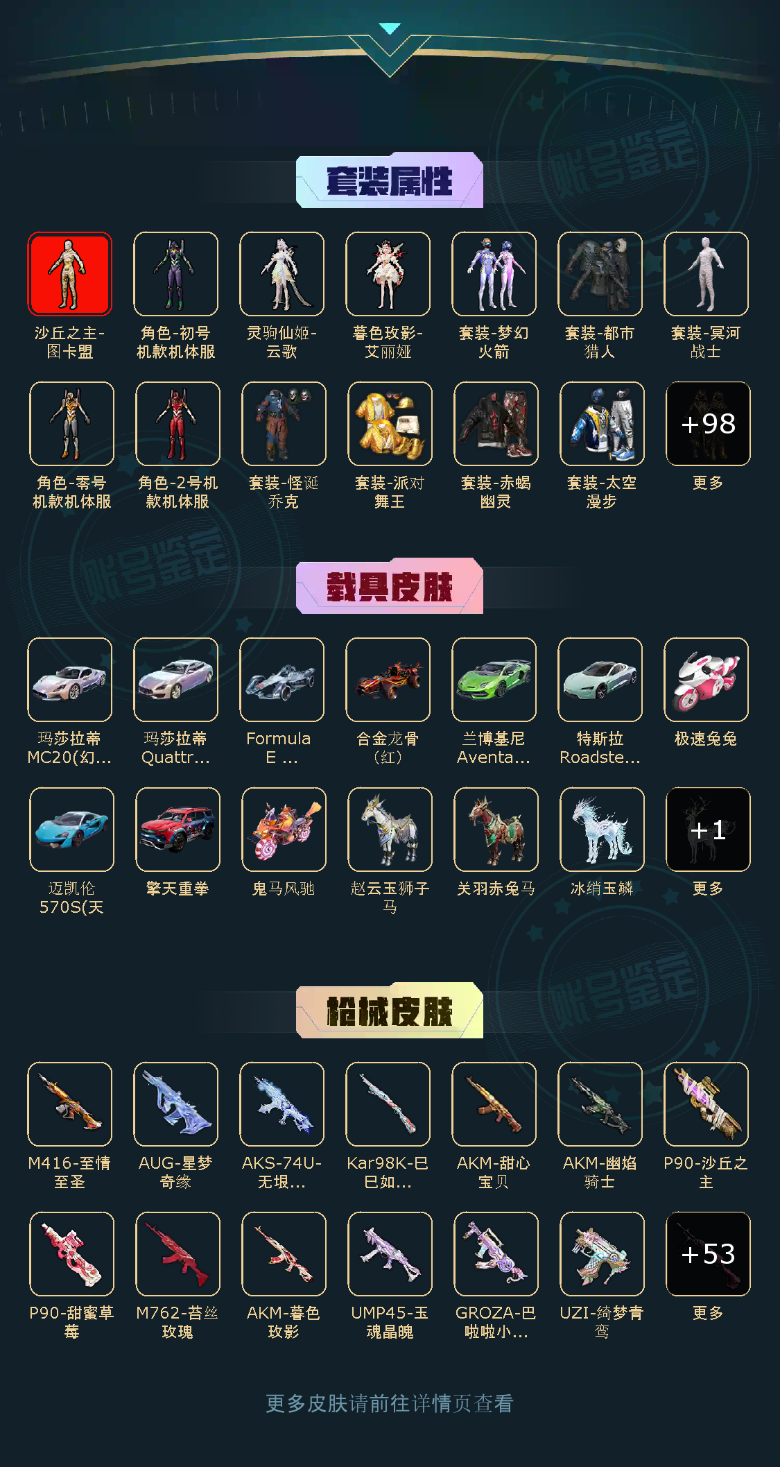 不朽星钻Ⅰ104粉,13载具,619套装,33王牌印记,无敌战神历史最高段,358588热力值 平底锅-仲夏莫吉托/平底锅-林间仙鹿/AKM-盖世英雄/AKM-甜心宝贝/SCAR-L-梦幻火箭/AUG-星梦奇缘/AKM-绿萝繁花/M416-风花雪月/M416-电玩时刻/AUG-星之彼岸/SCAR-L-甜梦小狐/GROZA-巴啦啦小魔仙/GROZA-香水柠檬/M416-暖熊萌萌/AKM-幽焰骑士/M416-心之恋语/SCAR-L-纯梦嫁纱/AKM-炫紫旋律/SCAR-L-青春物语/SCAR-L-锦绣绵绵/M416-至情至圣/AUG-妙趣可丽/M762-甜蜜誓约/M762-苔丝玫瑰/AKM-暮色玫影/SPAS-12-蜜语绒猫/SPAS-12-音爆索尼克/S12K-海渊国主/M417-第五大道/SKS-诡面斩/Mini14-绚金瑰梦/SLR-暗夜玫瑰/VSS-烈焰拳霸/MK20-H-海螺星光/DP-28-暗夜鎏金/DP-28-扶摇飞仙/M249-彩虹甜喵/MG3-梦幻舞会/PKM-天星战神/DP-28-枪炮玫瑰/MG3-洛神天依/M249-蓝莓炮弹/DP-28-豹影疾电/UZI-绮梦青鸾/Vector-飒粉甜心/汤姆逊-怪笑疯兔/Vector-红伞翩翩/P90-甜蜜草莓/汤姆逊-荒漠赏金/P90-粉樱探戈/Vector-环太平洋/UZI-筑梦精灵/野牛-青空秋雨/UMP45-恐龙拽拽/P90-沙丘之主/UMP45-玉魂晶魄/AKS-74U-无垠阁/爆炸猎弓-雪梅暗香/Kar98K-伏魔团/AWM-花间之火/Kar98K-巳巳如意/AWM-橘柚倾心/Kar98K-未来歌姬/M24-星之信仰/M24-莲影清波/特斯拉Roadster(水滴蓝)/玛莎拉蒂Quattroporte(幻星粉)/擎天重拳/鬼马风驰/Formula E Gen2(巅峰兰)/合金龙骨(红)/兰博基尼Aventador(翡翠绿)/玛莎拉蒂MC20(幻星粉)/迈凯伦570S(天际蓝)/冰绡玉鳞/关羽赤兔马/赵云玉狮子马/照夜玉狮子/极速兔兔/