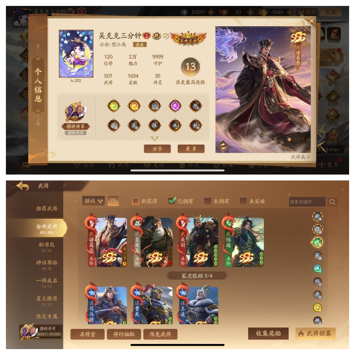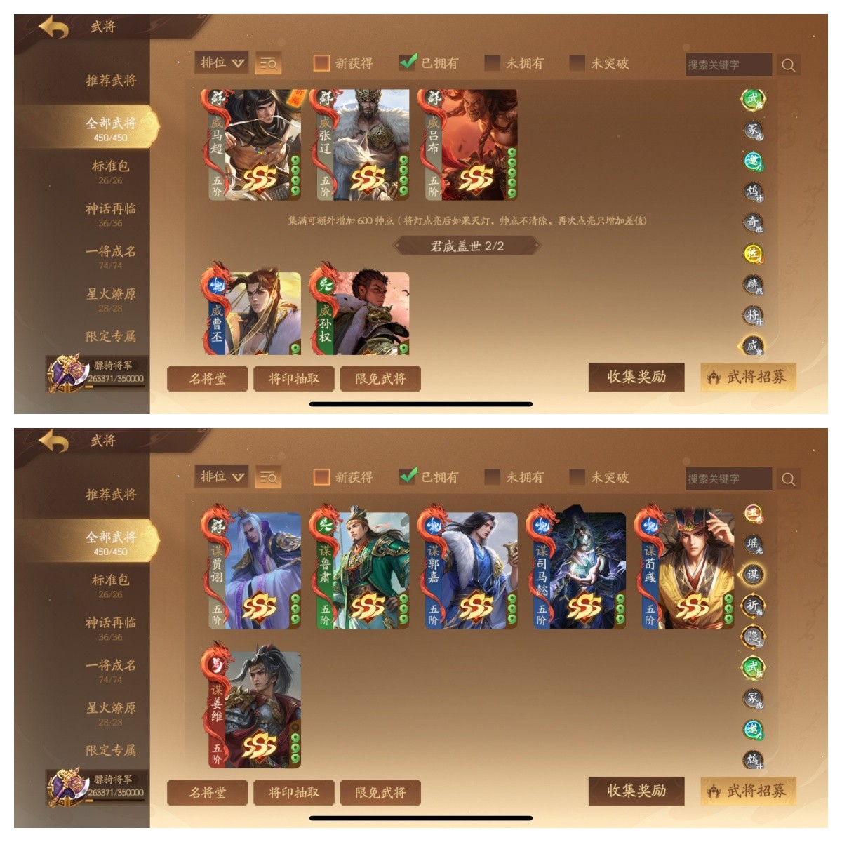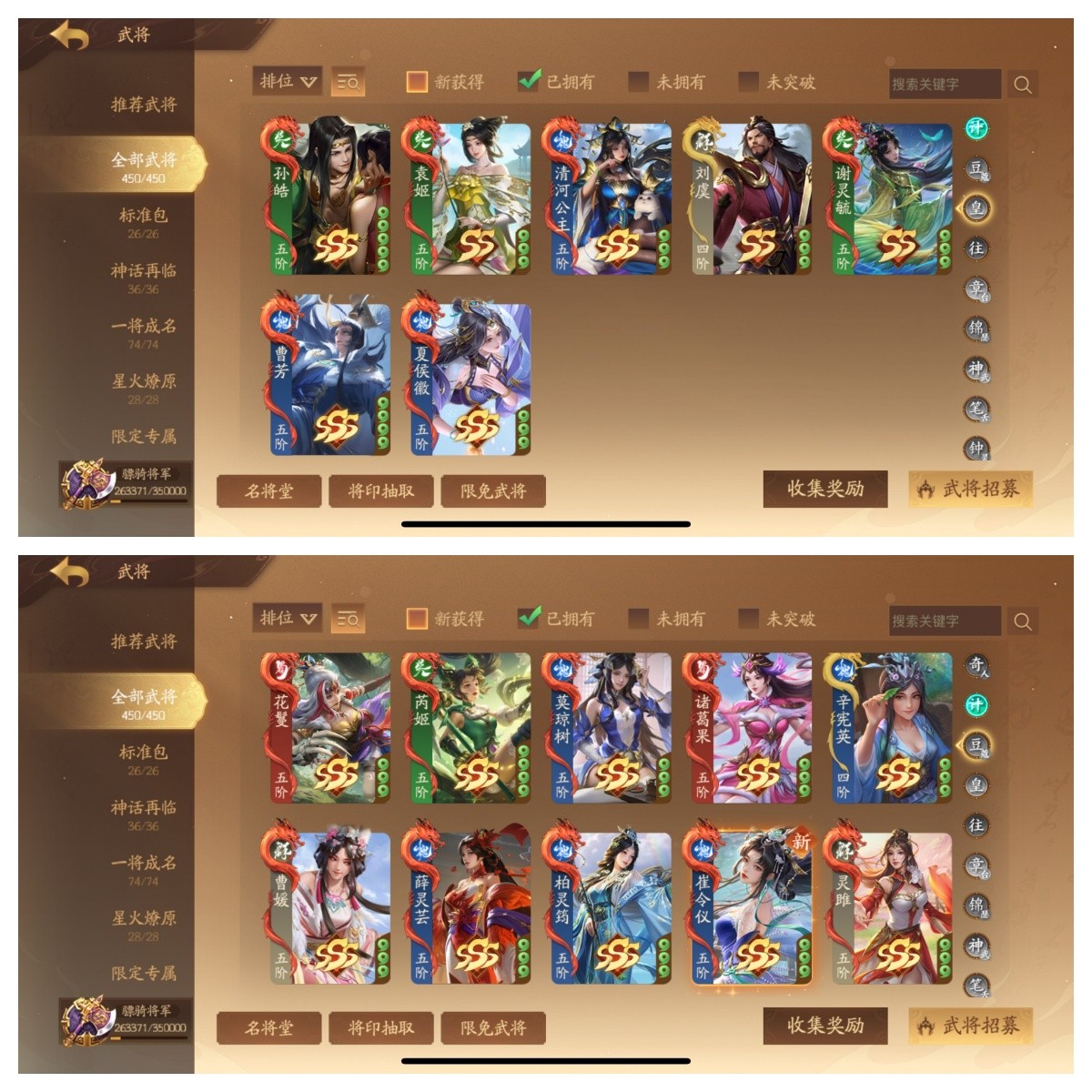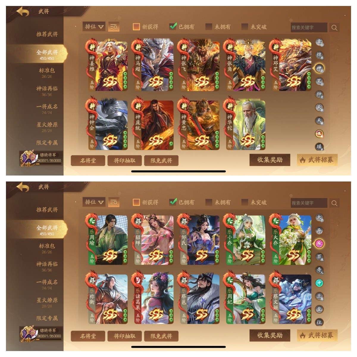 骠骑将军 510将4武庙9神武6大谋17谋10乐5威100+阴间7星河【武庙】:武诸葛亮千古传,武陆逊神秀传,武关羽武义传,武皇甫嵩【神武】:神张飞,神张角,神邓艾,神华佗,神黄忠,神姜维,神马超,神钟会,神庞统动【大谋】:谋姜维,谋司马懿双形态动,谋郭嘉,谋贾诩,谋荀彧,谋鲁肃【谋】:谋邓艾,谋司马师,谋关平, 谋典韦,谋胡车儿,谋沮授,谋董承,谋曹洪,谋刘协,谋王凌,谋曹爽,谋诸葛瑾【乐】:乐蔡文姬(动),乐祢衡,乐诸葛果,乐大乔,乐小乔,乐貂蝉,乐周瑜,乐周妃,乐蔡邕,乐邹氏【威】:威马超,威曹丕,威张辽,威吕布,威孙权 ;其他:夏侯玄;关樾;许靖,孙翎鸾,滕芳兰,诸葛京 曹芳动;刘衿刘佩,柳婒 任婉 曹金玉,柏灵筠 薛灵雲动;崔令仪;许劭动, 黄舞蝶,曹媛; 周宣动;和尚;朱建平,丁尚涴,孙霸,SP甄姬,钟毓, 关宁, 莫琼树,夏侯徽 庞会,张曼成,黄舞蝶;吴质,朱铄,刘巴,曹宪 陈珪动, 文钦, 凌操,吕据,孙桓,袁姬,谢灵毓,甘糜夫人,吴普,乐綝,周不疑,孙礼,宣公主,马钧,张奂;庞宏;袁胤;刘晔焚焰动;诸葛均;庞会 张怀;张嫙动;清河公主;星曹仁星法正星董卓星袁术星文丑星张春华;等各种