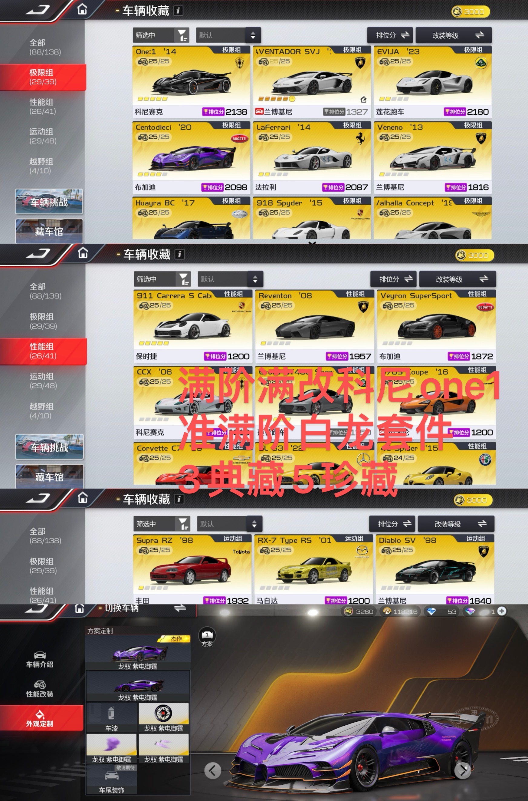 【安卓】 满阶满改科尼one1✅4满阶白龙带套件✅2阶满改莲花✅布加迪珍藏典藏拉法雷文顿rx7共50金车