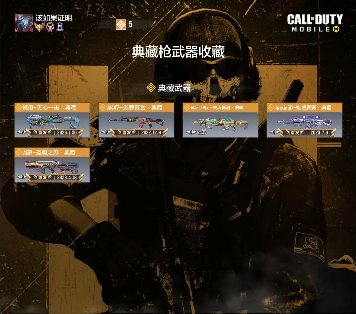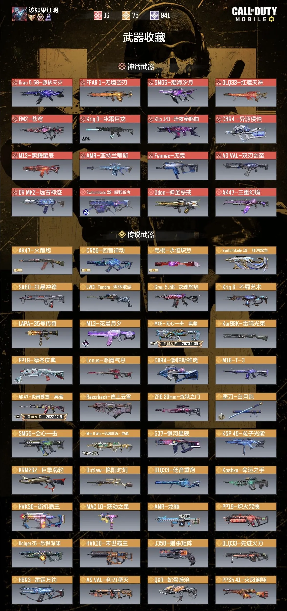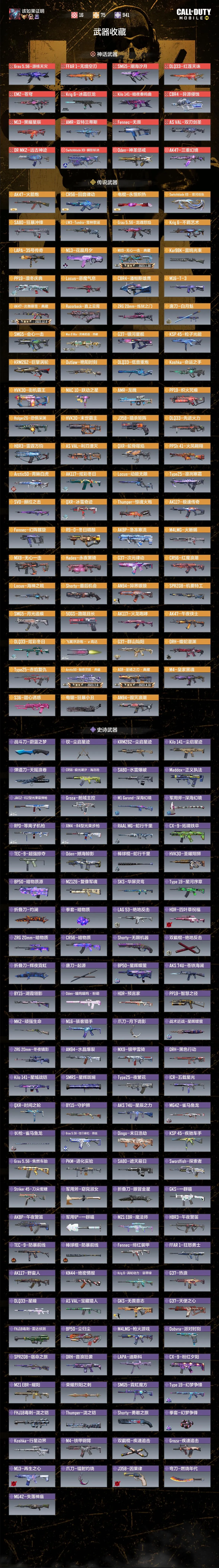 Grau 5.56-源核天灾 FFAR 1-无境空刃 SMG5-潮海汐月 DLQ33-红莲天诛EM2-苍穹 Krig 6-冰霜巨龙 Kilo 141-暗夜奏鸣曲 CBR4-异源侵蚀M13-黑耀星辰 AMR-亚特兰蒂斯 Fennec-无畏 AS VAL-双刃剑圣 DR MK2-远古神迹 SwitchbladeX9-瞬影斩决 Oden-神圣惩戒 AK47-三重幻境