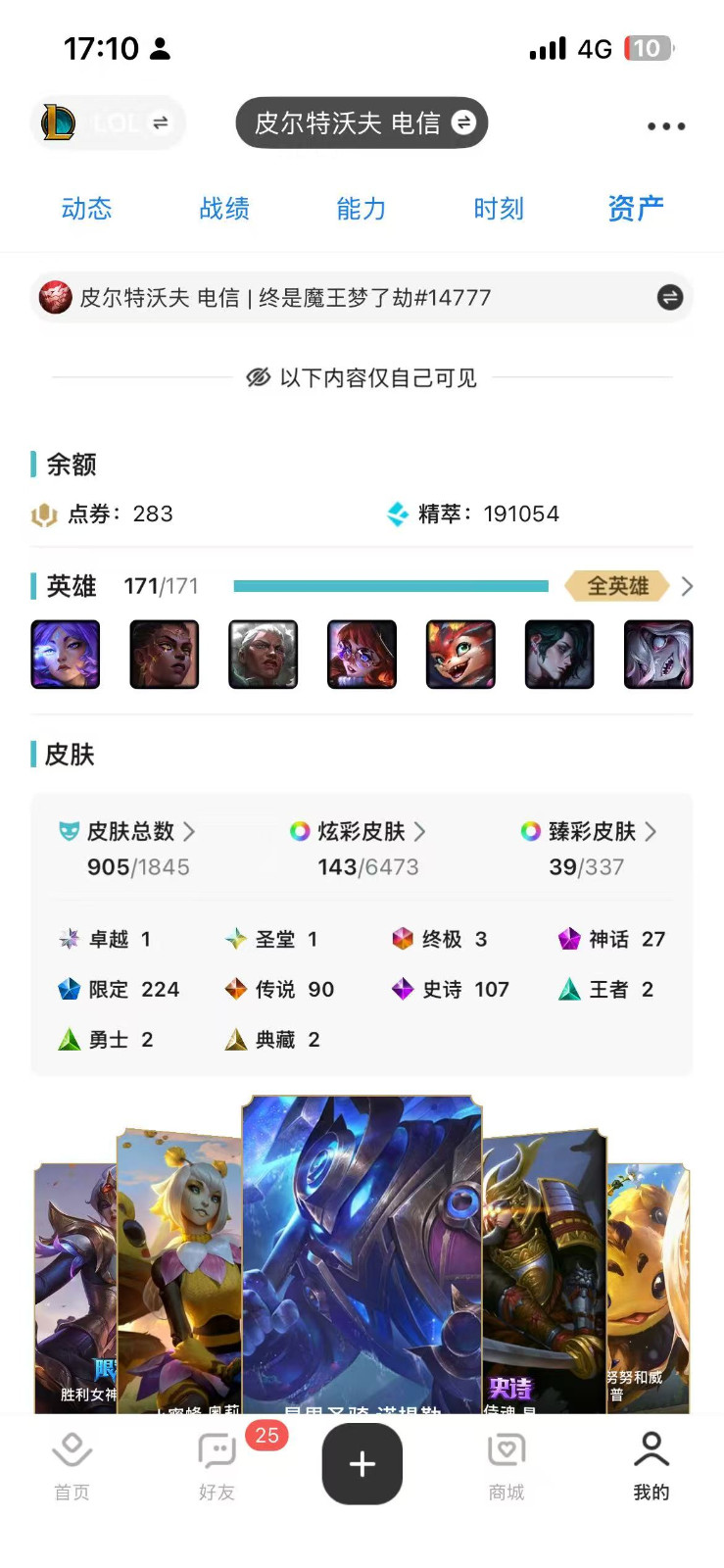 不算是精品号,自玩的号。大部分热门皮肤和部分臻彩都有