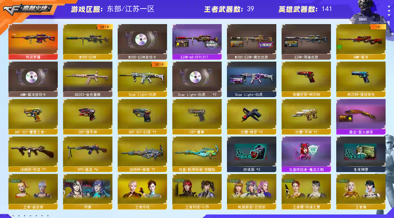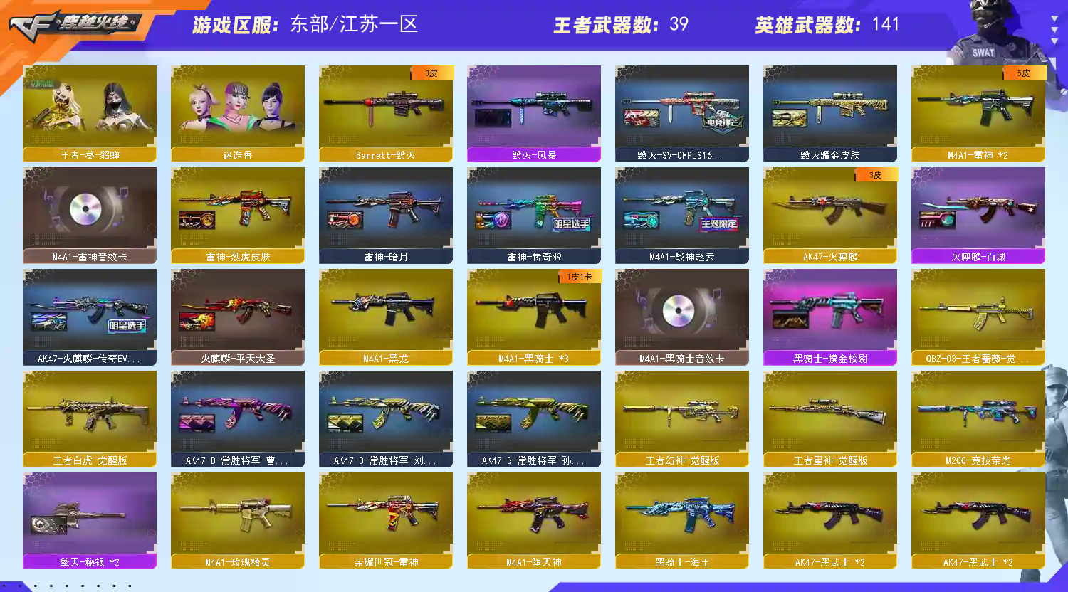 稀有武器:传说梦魇、M200幻神、7把烈龙+死亡之眼、6把盘龙+2把炼狱+炼狱惊涛骇浪、荣耀世冠柯尔特、USP雷暴、M200竞技荣光、QBZ金色蔷薇、HK朱雀、SL白虎、M4堕天神、火麒麟、黑龙、雷神X2、黑骑士X3、黑武士X2、天启、超新星、机械迷城、黑鲨、龙血、黑武士锦绣游龙、玫瑰精灵、猎神、烈火、黑武士CF网剧冠军武器套装X2、黑骑士海王、荣耀世冠雷神、天龙、毁灭、裁决、Barrett朱雀X2、修罗X3、天神X2、COP堕天神、COP幻灵X2、柯尔特竞技荣光、天神CF网剧冠军武器套装X2、COP雷霆王者、屠龙X3、龙啸X9、擎天X3、麒麟刺、麒麟刺堕天神X2、龙啸堕天神X2、幻灵之锋X2、擎天竞技荣光、擎天CF网剧冠军武器套装X2、雷霆王者之锋、暴君乱世-超越MAX、寒冰征服者-超越MAX、冰龙粉碎者、冰龙粉碎者-白马银枪X2、激光毁灭者3-白马银枪、封神放逐者3、黑龙吞噬者