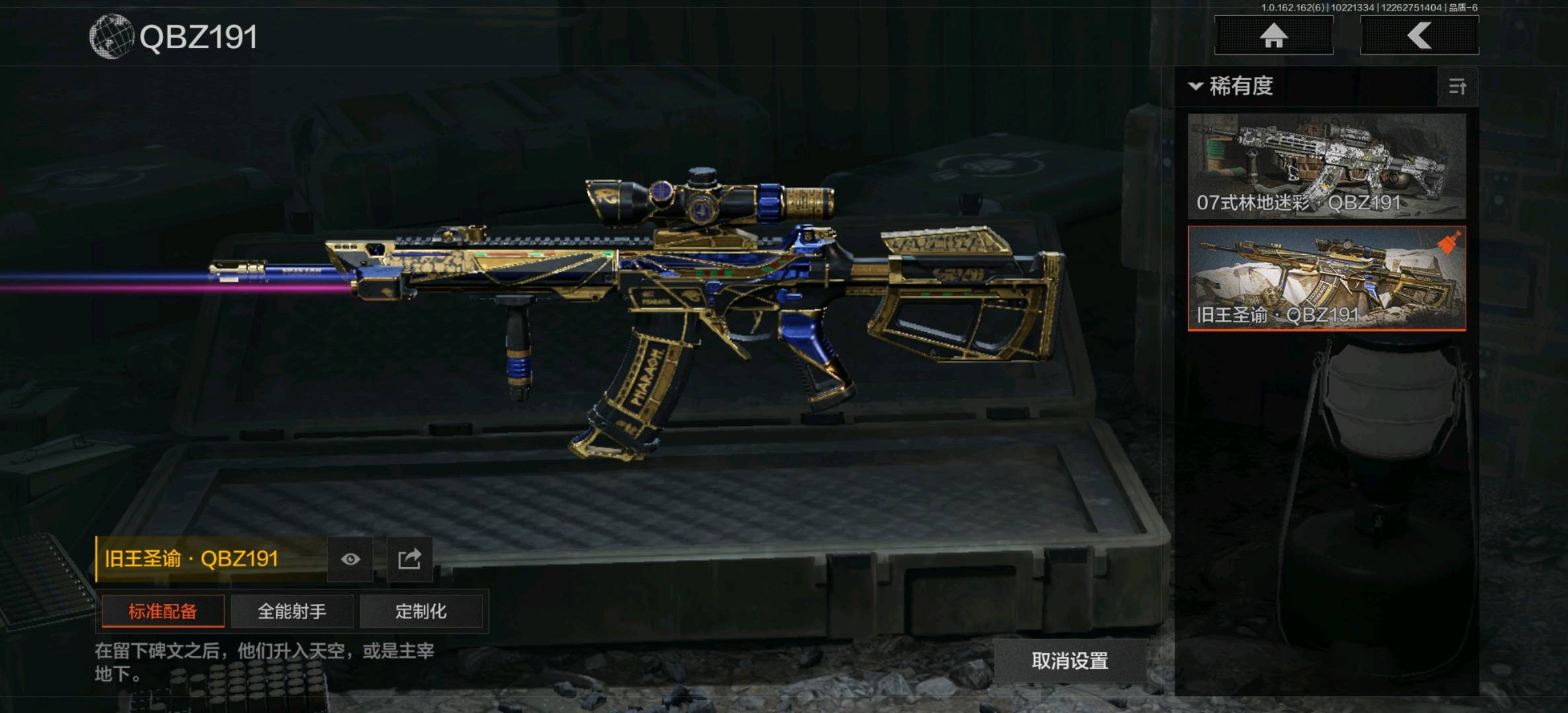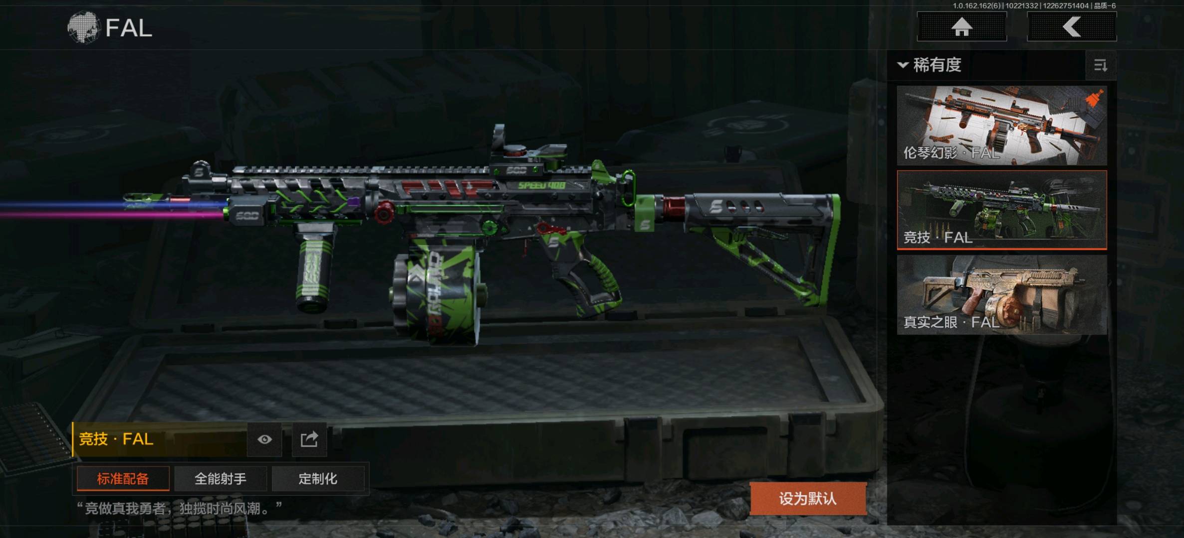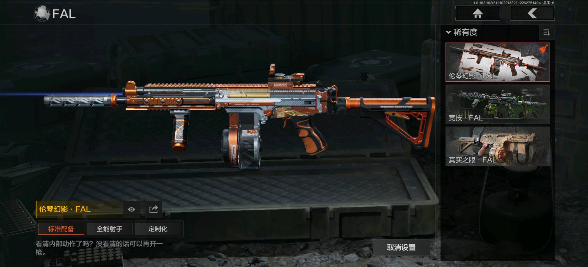 伦琴幻影FAL,竞技FAL,告丧夜曲AUG,告丧夜曲AR57,旗帜AEK,旧王圣谕QBZ191,浮鳞影青QBZ192,棱光裂变AKM,来战AKM,骤羽尖啸M4A1,巅峰M4A1,德尔塔小队M4A1,竞技M4A1,自喷网格H416,鱼跃丹青DTMDR,利齿风暴MDR,竞技MDR,北国内卫MDR,鱼跃丹青AK102,火力倾泻AUG,伦琴计量AK74N,棱光裂变AK74N,雪原凌锋AK74N,来战AK74N,山地伪装AK74N,骑士之剑AKS74U,炎夏浪花AR57,涂绘猎人AR57,逆火玄石ACE31,战术大师ACE31,骑士之剑ACE31,最后防线AEK,火绒AN94,北国内卫AN94,伦琴计量T951,百锻寒芒T951,飞鲨T951,武侍FAMAS,利齿风暴T03,百锻寒芒T03,林地数码T03,鱼跃丹青MCX,典礼武备MCX,07式林地迷彩QBZ191;
