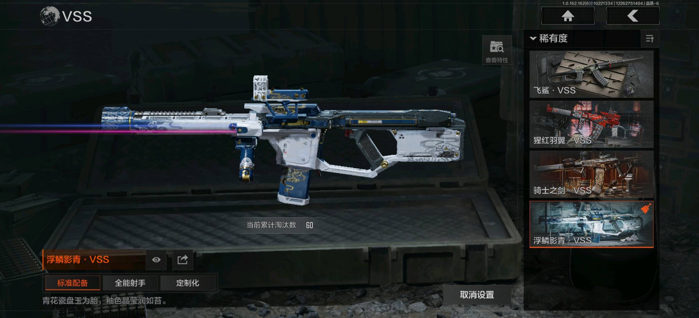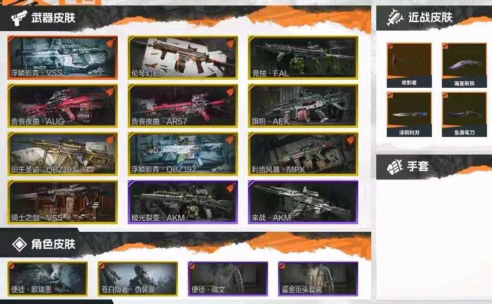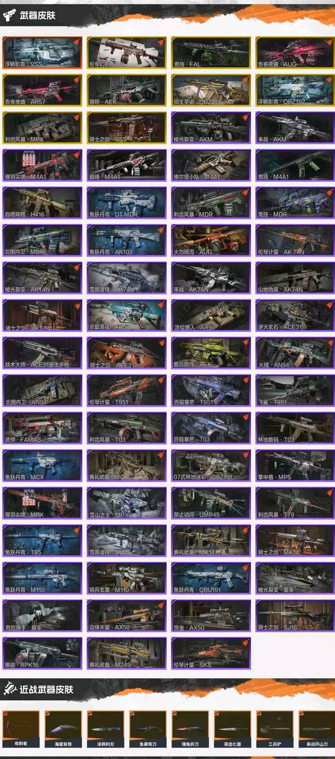 利齿风暴MPX,掌中盾MP5,骤羽尖啸MPX,雪山之王MPX,禁止访问UMP45,利齿风暴T79,鱼跃丹青T85;浮鳞影青VSS,骑士之剑VSS,雪原凌锋SVDS,典礼武备MK14,骑士之剑MK14,鱼跃丹青M110,缟兵玄墨M110,鱼跃丹青QBU191;棱光裂变莫辛,危险猎手莫辛,边缘矢量AX50,饰金AX50,骑士之剑SJ16;娜迦RPK16,典礼武备M249伦琴计量SKS