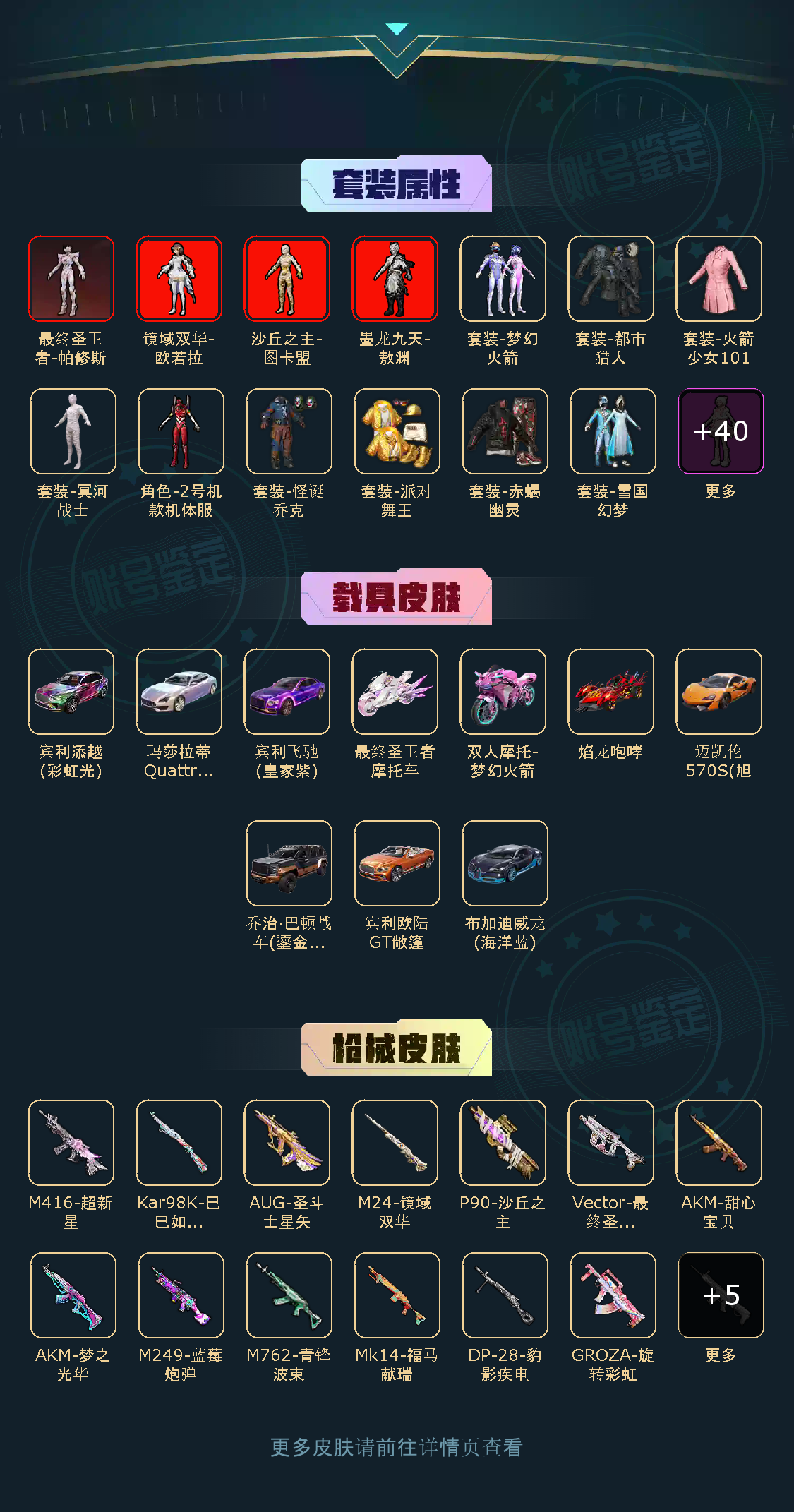 超级王牌5星48粉,10载具,321套装,21王牌印记,无敌战神历史最高段,174930热力值 Vector-绯穹魔姬/AKM-甜心宝贝/GROZA-旋转彩虹/M416-心之恋语/SCAR-L-纯梦嫁纱/AUG-圣斗士星矢/M762-青锋波束/M416-墨龙九天/M416-超新星/AKM-梦之光华/M417-第五大道/Mk14-福马献瑞/M249-蓝莓炮弹/DP-28-豹影疾电/Vector-最终圣卫者/P90-沙丘之主/Kar98K-巳巳如意/M24-镜域双华/AMR-炫光之旅/宾利飞驰(皇家紫)/玛莎拉蒂Quattroporte(幻星粉)/宾利欧陆GT敞篷(火焰橘)/乔治·巴顿战车(鎏金黑)/宾利添越(彩虹光)/焰龙咆哮/迈凯伦570S(旭日黄)/布加迪威龙(海洋蓝)/双人摩托-梦幻火箭/最终圣卫者摩托车/
