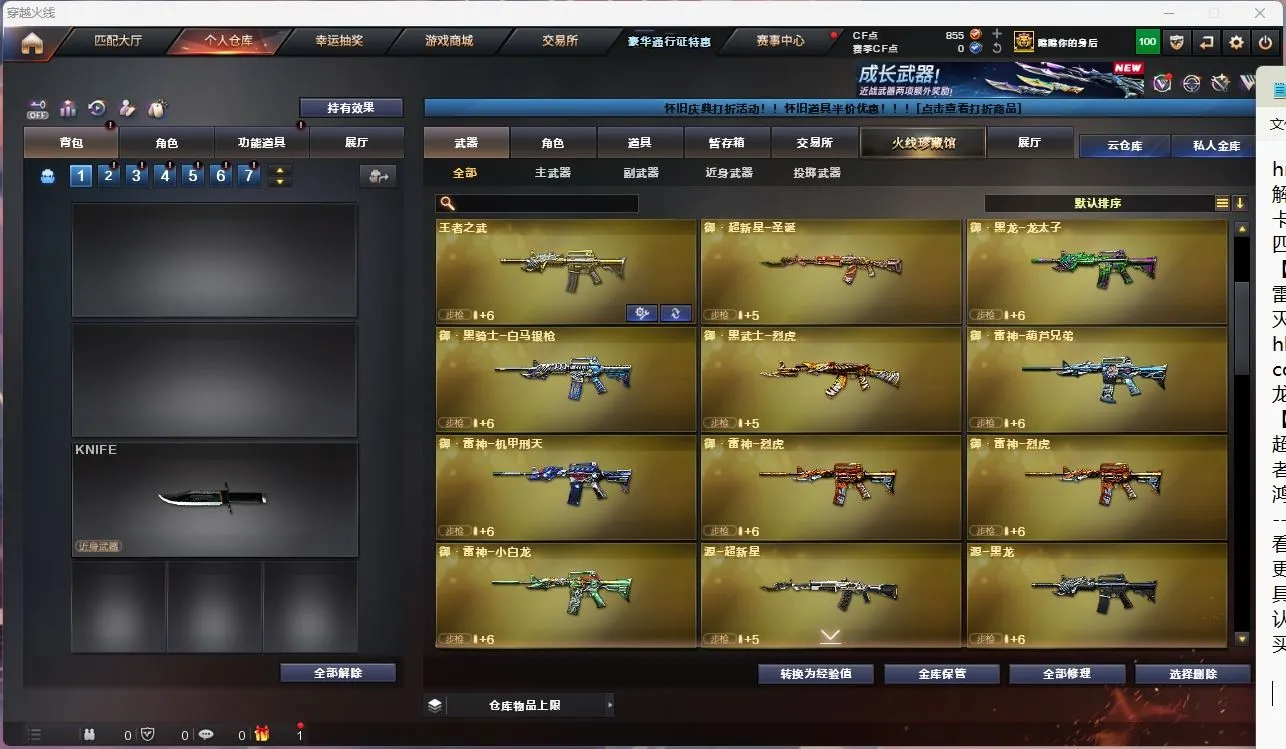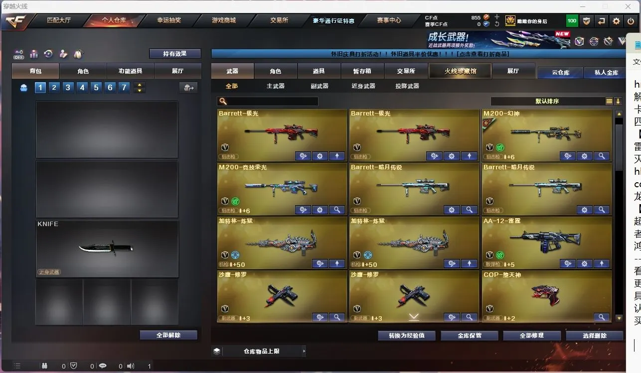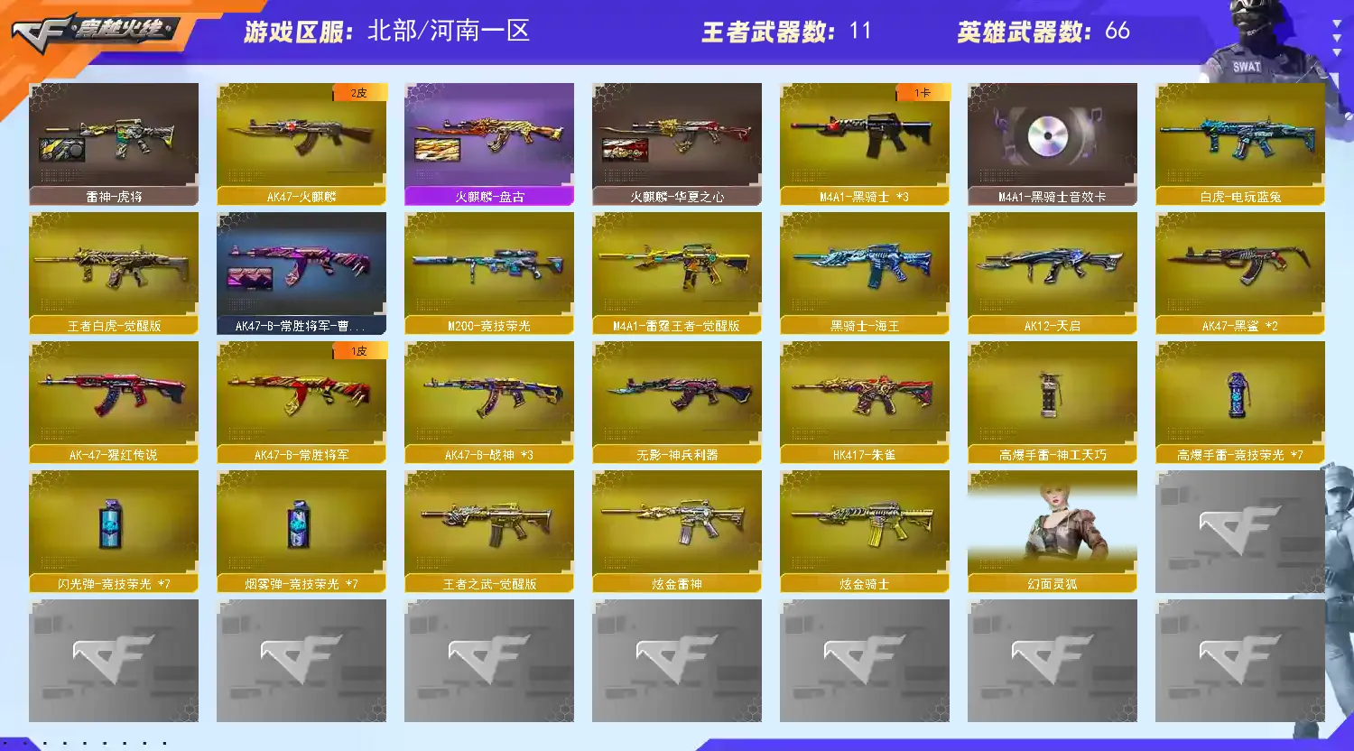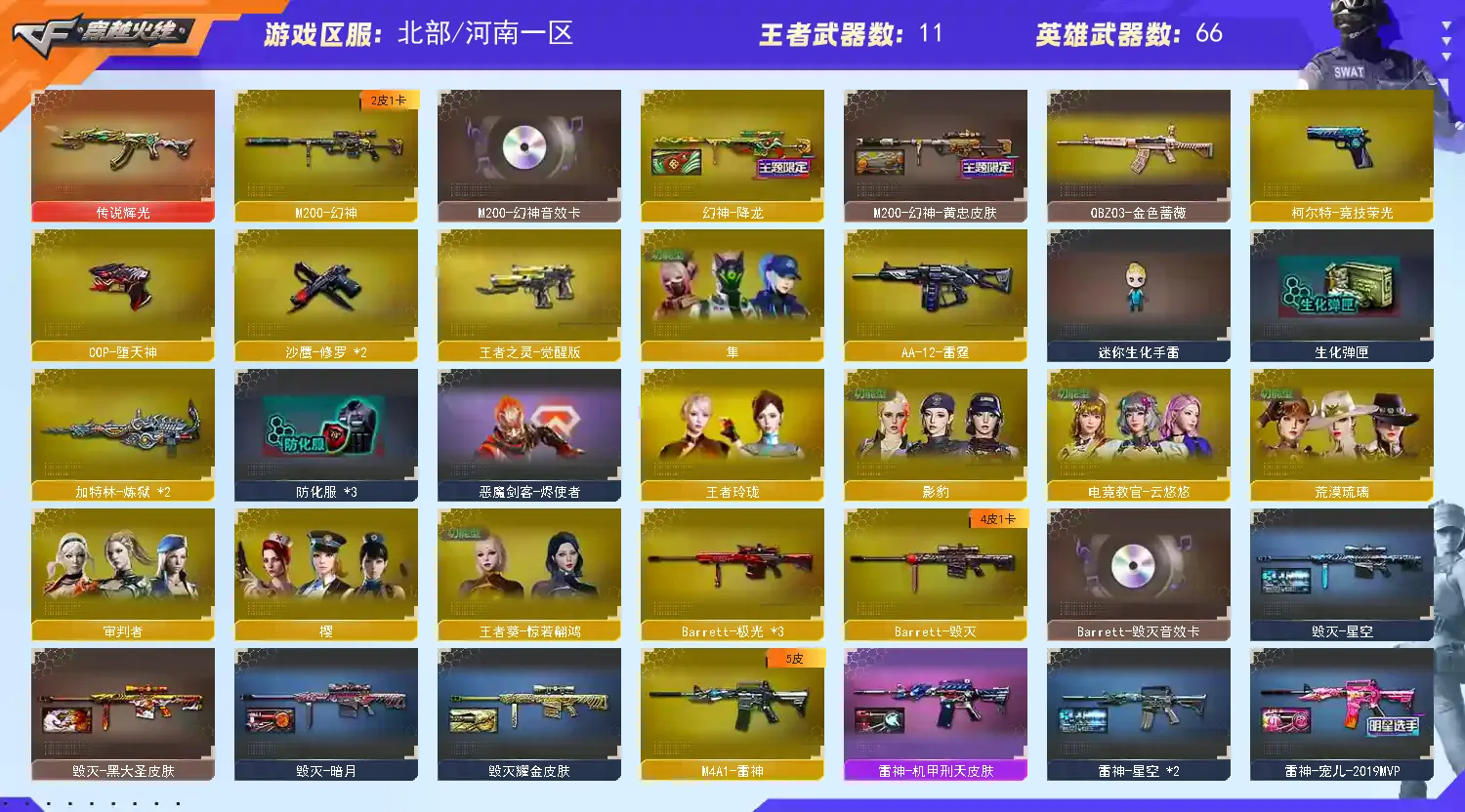 【亮点解析 幻神三件套】 【m200-幻神+音效卡+降龙+幻神-黄忠】 【竞技荣光套+四防云悠悠+usp雷暴】 【传说辉光】 【qbz金色蔷薇】 【火麒麟】 【雷神+雷神-宠儿】 【黑骑士+音效卡】 【毁灭+音效卡】 【极光】 【天启 黑鲨 hk417-朱雀 烈火】 【5手呛 修罗*2 cop堕天神 王者之灵】 【10近战 屠龙 龙啸 麒麟刺 幻灵之锋 王者之锋*2】 【手雷 竞技荣光*7】 【挑战 臻选套 擎天柱 集束激光-超越max 集束激光-超越max 地狱征服者-超越max】 【四防 云悠悠 隼 王者葵惊若翩鸿】 【幻神音效卡】