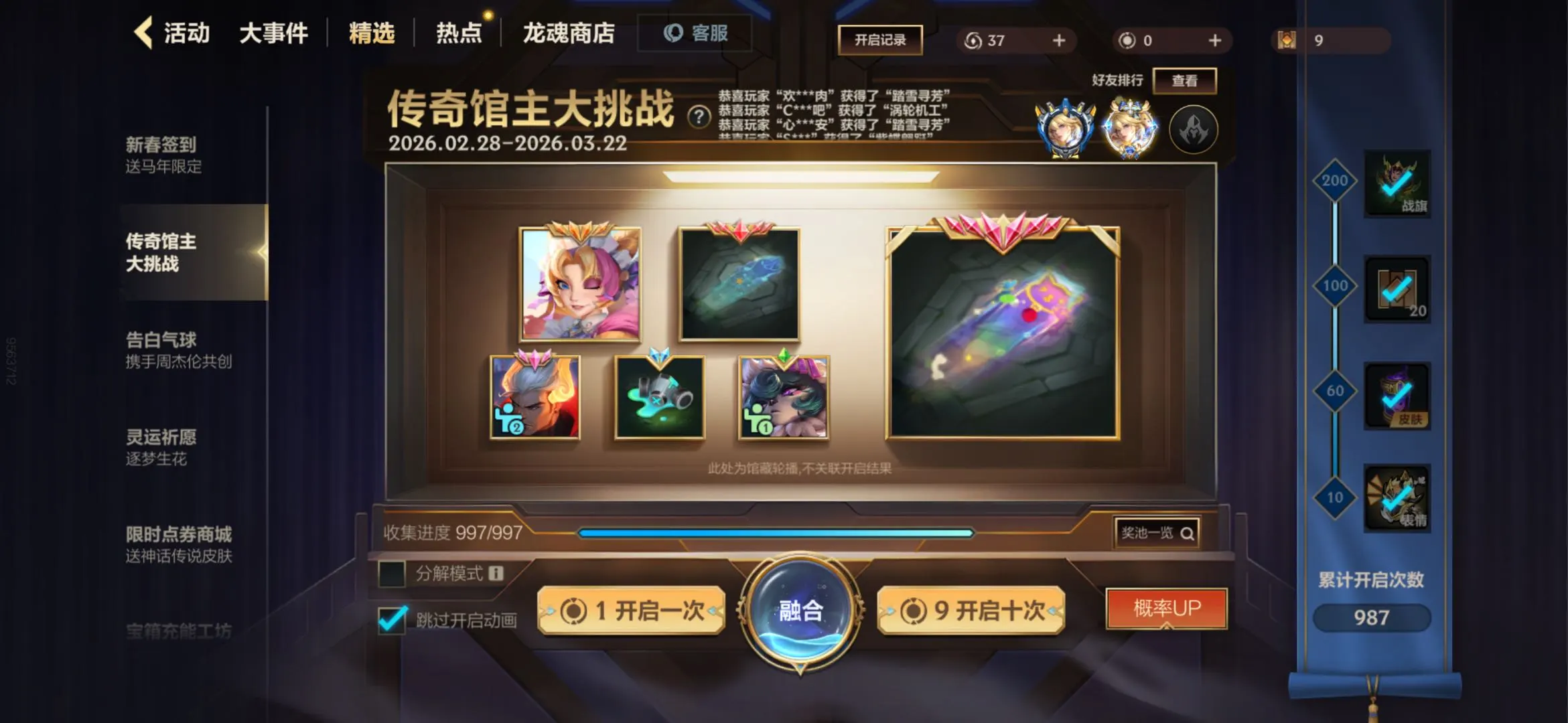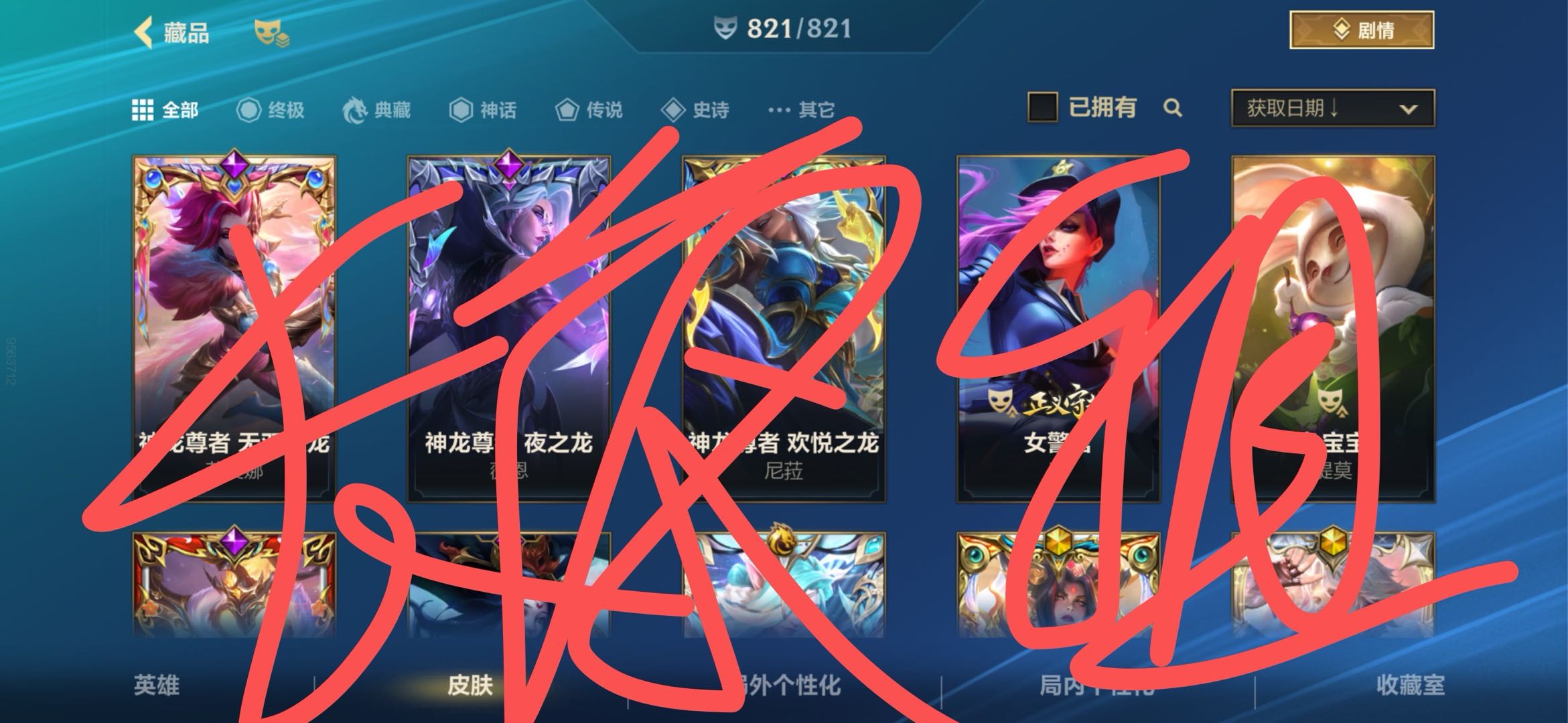 【苹果】 全网唯一国服前十收藏出租!典藏艾希全配件,告白气球全套821满皮肤23.8万收藏,蓝黄粉炫彩昵称全满