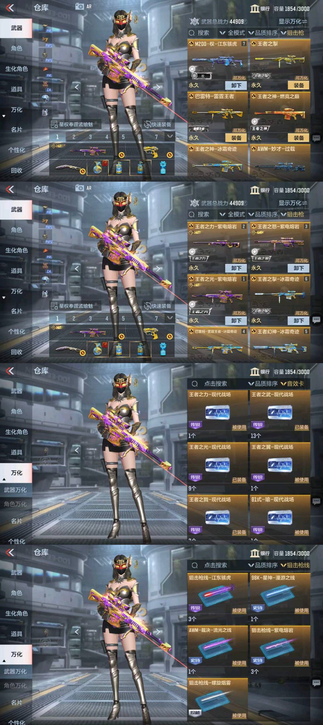 🔥狙击枪:❤🔥王者之力-紫电熔岩❤🔥王者之力-炫金❤🔥王者之力-拉丝❤🔥巴雷特-雷霆王者-冰霜奇迹❤🔥王者之怒-紫电熔岩❤🔥王者之怒-拉丝❤🔥王者之怒-冰霜奇迹:❤🔥王者之光-紫电熔岩❤🔥王者幻神-冰霜奇迹❤🔥王者之掣-冰霜奇迹❤🔥王者之神-冰霜奇迹❤🔥M200-权-江东骇虎❤🔥TAC-慈❤🔥AWM-妙才-过载❤🔥巴雷特-安琪拉❤🔥巴雷特15把❤🔥等省略