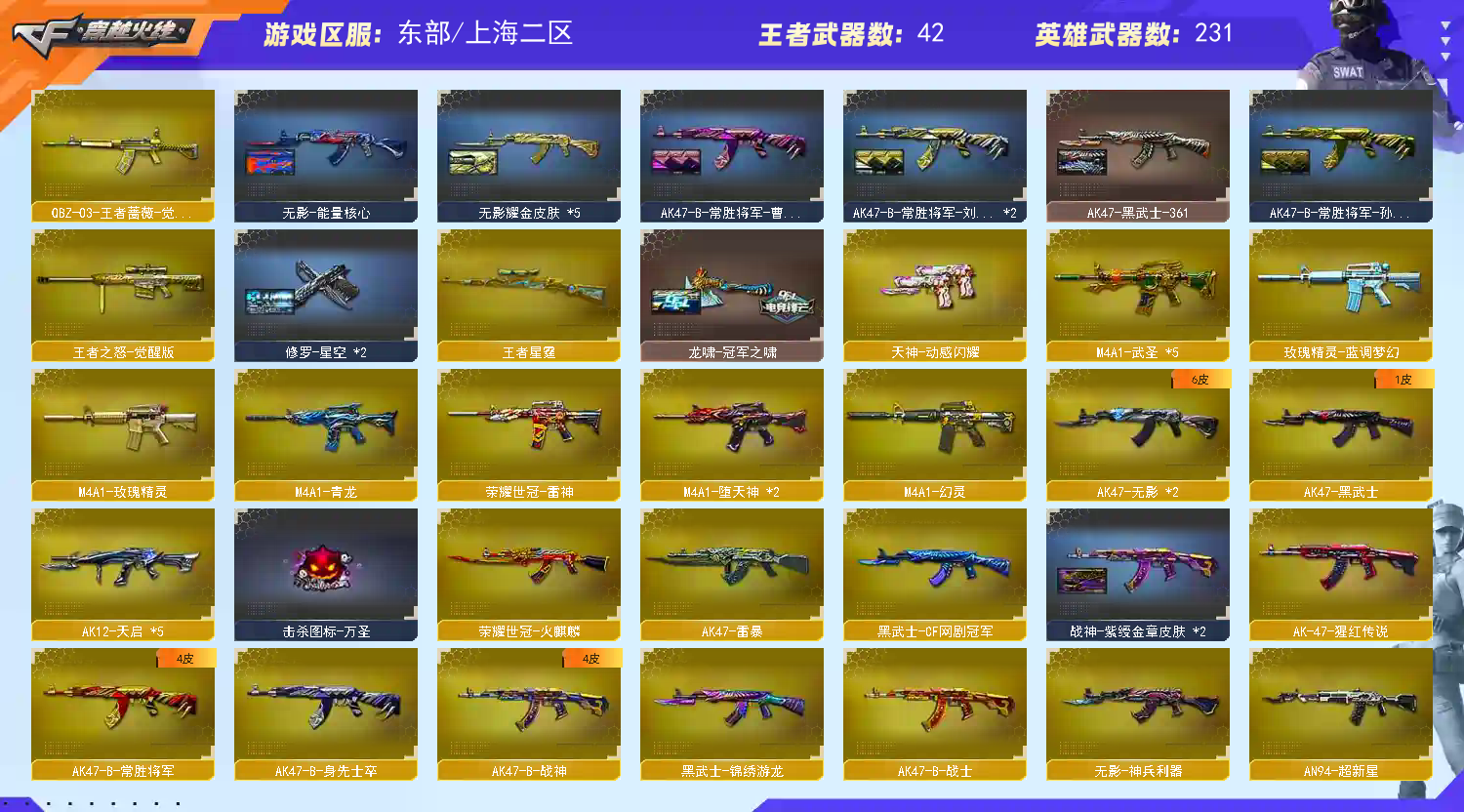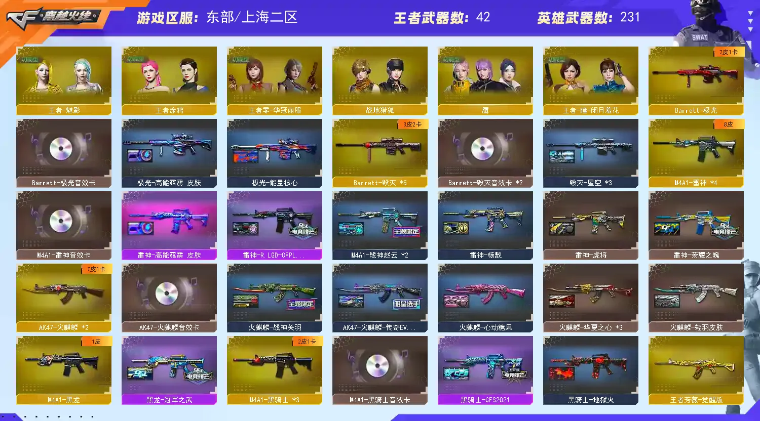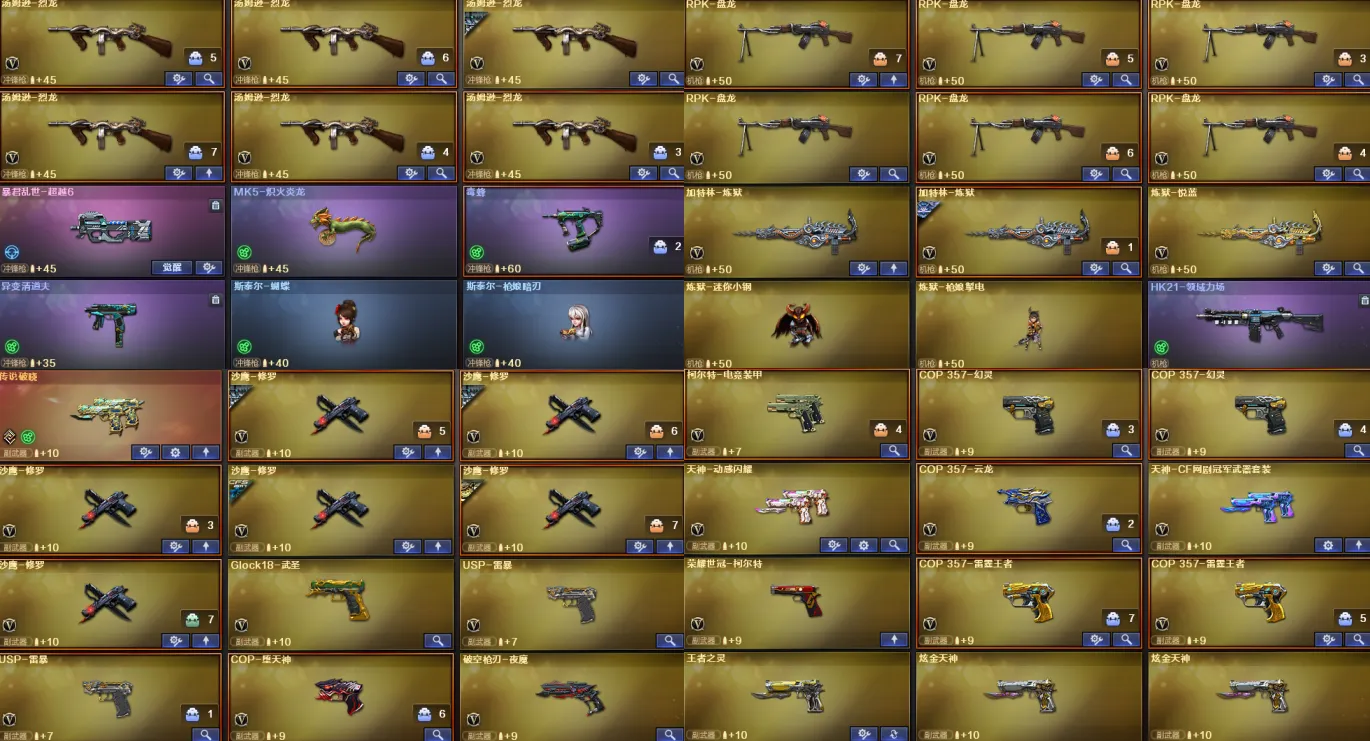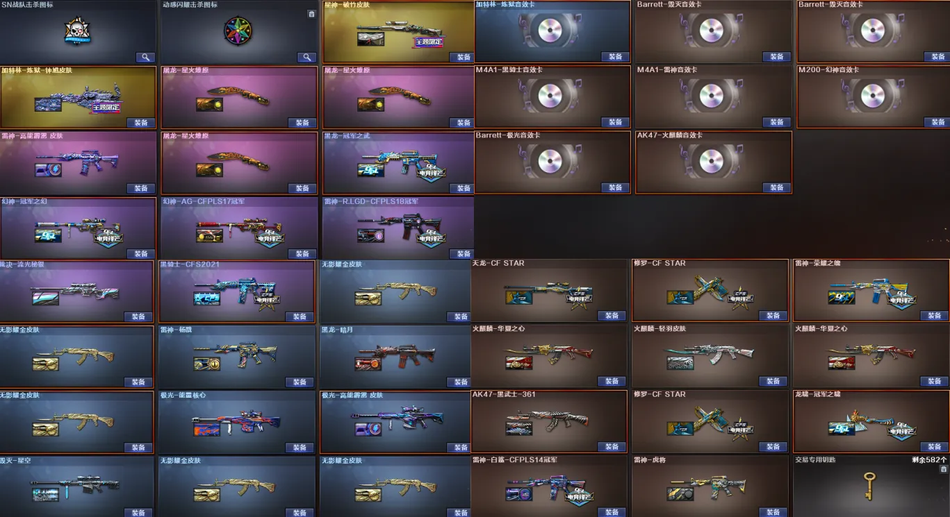 传说影煞/传说暗裔/传说圣灵/传说灵眸/传说破晓/AK47-火麒麟(2)/M4A1-黑龙/M4A1-雷神(4)/M4A1-黑骑士(3)/AK47-无影(2)/AK47-黑武士/AK12-天启(5)/AN94-超新星/M4A1-武圣(5)/M4A1-龙血(5)/AK47-雷暴/M4A1-青龙/M4A1-堕天神(2)/HK417-朱雀/ScarLight-白虎/M4A1-幻灵/M14EBR-玄武(2)/无影-神兵利器/G36C-幻影/黑武士-锦绣游龙/八面凌龙/M4A1-玫瑰精灵/QBZ03-金色蔷薇/M4A1-猎神/王者之心-觉醒版/王者之影-觉醒版/王者之武-觉醒版/王者之魄-觉醒版/王者之势-觉醒版/王者之戮-觉醒版/AK-47-猩红传说/王者之鲨-觉醒版/王者冰魄-觉醒版/王者火魄-觉醒版/王者之烈-觉醒版/QBZ-03-王者蔷薇-觉醒版/王者芳薇-觉醒版/荣耀世冠-火麒麟/荣耀世冠-雷神/黑武士-CF网剧冠军/AWM-天龙/Barrett-毁灭(5)/Barrett-极光/AWM-裁决(5)/M200-幻神/Barrett-朱雀(2)/Kar98K-星神/Barrett-电竞装甲/王者之怒-觉醒版/王者之光-觉醒版/王者之力-觉醒版/RPK-盘龙(6)/加特林-炼狱(2)/炼狱-悦蓝-觉醒版/汤姆逊-烈龙(6)/AA-12-雷霆(4)/沙鹰-修罗(6)/USP-雷暴(2)/COP-堕天神/COP357-雷霆王者-觉醒版(2)/COP357-幻灵(2)/柯尔特-电竞装甲/荣耀世冠-柯尔特/破空枪刃-夜魔/COP357-云龙/王者之灵-觉醒版/Glock18-武圣/天神-动感闪耀/天神-CF网剧冠军/屠龙(4)/龙啸(5)/麒麟刺-堕天神/擎天(2)/麒麟刺(2)/幻灵之锋/炽芒蝶刃/屠龙-动感闪耀/龙啸-热带奇洋/荣耀世冠-龙啸/尼泊尔-电竞装甲/龙啸-堕天神(4)/斩神刀-雷暴/擎天-CF网剧冠军/王者之锋-觉醒版(2)/王者之啸-觉醒版/王者之击-觉醒版(3)/王者之刺-觉醒版/高爆手雷-雷暴(7)/高爆手雷-堕天神(7)/高爆手雷-幻灵(7)/手雷-动感闪耀/手雷-热带奇洋/闪光弹-雷暴(7)/闪光弹-堕天神(7)/闪光弹-幻灵(7)/闪光弹-雷霆王者-觉醒版/烟雾弹-雷暴(7)/烟雾弹-堕天神(7)/烟雾弹-幻灵(7)/烟雾弹-雷霆王者-觉醒版/M4A1-赤狱骑士/Barrett-碧霄极光/王者之戮/王者之幻/王者之翼/王者之势/王者星霆/王者之霆/王者冰锋/炫金火麒麟/炫金骑士(2)/炫金千变/炫金武士/炫金超新星/炫金天龙/炫金天神(3)/王者之魄高爆手雷(2)/王者之魄闪光弹(3)/王者之魄烟雾弹/雷神-小红/天龙-曼陀罗/火麒麟-灵狐(7)/M4A1-雷神-精英刀锋/炼狱-迷你小钢/炼狱-枪娘掣电/MK5-炽火炎龙/MAC-10-龙宝/斯泰尔-蝴蝶/巴雷特-零-水下丽影(2)/斯泰尔-枪娘暗刃/迷你地狱终结者/AWM-灵狐-15周年嘉年华/M37-葵/COP-旗袍/C.A.T/牛牛-AK47/迷你生化手雷(5)/闪光弹-小乔/闪光弹-貂蝉/高爆手雷-大乔/毒蜂/异变清道夫/黑龙吞噬者/超级对讲机/神圣爆裂者III/机甲撕裂者III/KAC-圣炎切割者III/零/葵/樱/魅影/炫/春/沙漠玫瑰/雨棠/影豹/鹰/隼/战地猎狐/王者-瞳-闭月羞花/王者零-华冠丽服/王者-葵-貂蝉/王者春/王者涂鸦/王者玲珑/王者-魅影/王者-迷迭香/王者潘多拉/奇洋探员/乔伊教练/修道士/炽天使/暗夜-X/电竞少女/嘉年华灵狐/零-水下丽影/灵狐者-黄金海岸/龙儿-小淘气/潘多拉-X/邱刚敖/蛇姬/斯沃特-X/甜心偶像/铁骑荣耀/樱-战斗天使/樱-缤纷夏日/幽/游珑儿/职业选手/EP战队炫彩背包/KZ战队炫彩背包/R.LGD炫彩背包/XROCK炫彩背包/冰冰背包-猛男专用/古蛇迷踪炫彩背包/奇洋探员-海龟背包/超级背包/哔哩哔哩名片/女皇终结者-魔龙之吻/救世主-黑桃战神/妩媚妖姬/黄金生化钩/绿色巨人/灵魂忍者/变异宝贝/迷雾幽灵/生化弹匣/夺命之镰/防化服(2)/金色流光-枪王排位(2)/星辰流光-枪王排位/流光-鎏金之域/枪王排位28赛季金色流光/枪王排位29赛季金色流光/热带奇洋特效/电玩兔兔表情/循环实验表情/EP战队名片/C4-沙漠(2)/C4-再燃火线/防弹头盔(2)/防弹衣(2)/C4工具钳(2)/手雷包(2)/M200-幻神音效卡/AK47-火麒麟音效卡/M4A1-雷神音效卡/M4A1-黑骑士音效卡/Barrett-毁灭音效卡(2)/Barrett-极光音效卡/AWM-裁决音效卡/Barrett-碧霄极光音效卡/加特林-炼狱音效卡/幻神-冠军之幻/幻神-AG-CFPLS17冠军/裁决-流光秘银/星神-璀璨皮肤/星神-破竹皮肤/烈龙-星空/雷神-荣耀之魄/雷神-虎将/M4A1-战神赵云(2)/雷神-杨戬/雷神-R.LGD-CFPLS18冠军/火麒麟-华夏之心(3)/AK47-火麒麟-传奇EVEN/火麒麟-轻羽皮肤/火麒麟-战神关羽/火麒麟-心动糖果/毁灭-星空(3)/黑龙-暗月(2)/黑龙-冠军之武/黑骑士-地狱火/黑骑士-CFS2021/无影-能量核心/无影耀金皮肤(5)/AK47-黑武士-361/天启-高能霹雳皮肤/战神-粉色甜心皮肤/战神-紫绶金章皮肤(2)/战神-流金岁月皮肤/天龙-能量核心/极光-能量核心/极光-高能霹雳皮肤/加特林-炼狱-钟馗皮肤/修罗耀金皮肤/修罗-星空(2)/屠龙-荣耀之锋/屠龙-星火燎原(3)/龙啸-冠军之啸