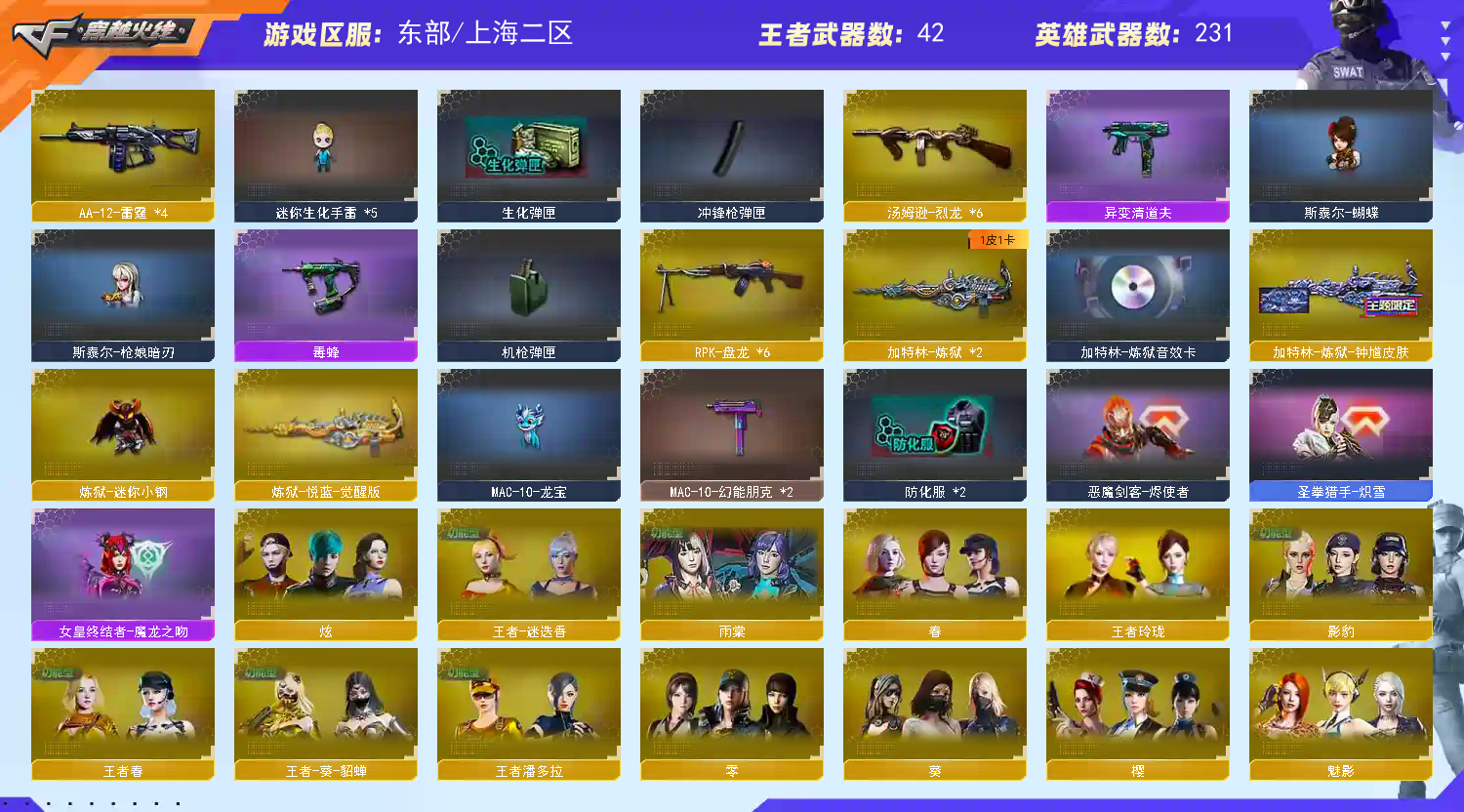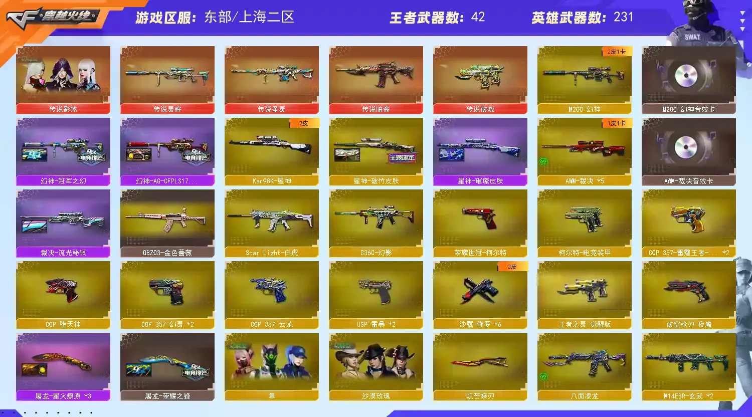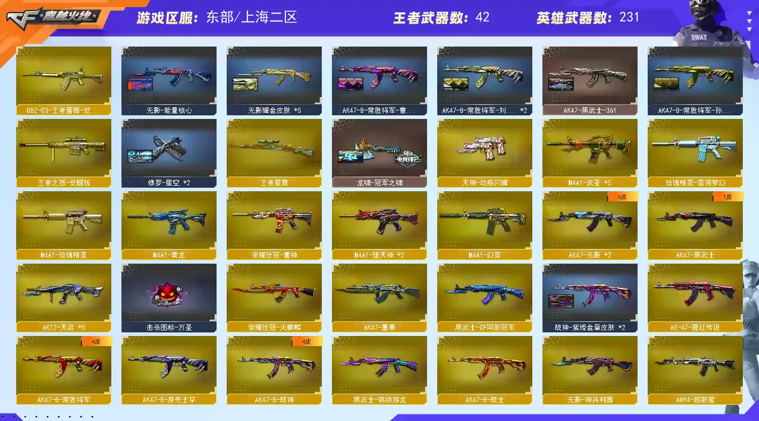 传说影煞/传说暗裔/传说圣灵/传说灵眸/传说破晓/AK47-火麒麟(2)/M4A1-黑龙/M4A1-雷神(4)/M4A1-黑骑士(3)/AK47-无影(2)/AK47-黑武士/AK12-天启(5)/AN94-超新星/M4A1-武圣(5)/M4A1-龙血(5)/AK47-雷暴/M4A1-青龙/M4A1-堕天神(2)/HK417-朱雀/ScarLight-白虎/M4A1-幻灵/M14EBR-玄武(2)/无影-神兵利器/G36C-幻影/黑武士-锦绣游龙/八面凌龙/M4A1-玫瑰精灵/QBZ03-金色蔷薇/M4A1-猎神/王者之心-觉醒版/王者之影-觉醒版/王者之武-觉醒版/王者之魄-觉醒版/王者之势-觉醒版/王者之戮-觉醒版/AK-47-猩红传说/王者之鲨-觉醒版/王者冰魄-觉醒版/王者火魄-觉醒版/王者之烈-觉醒版/QBZ-03-王者蔷薇-觉醒版/王者芳薇-觉醒版/荣耀世冠-火麒麟/荣耀世冠-雷神/黑武士-CF网剧冠军/AWM-天龙/Barrett-毁灭(5)/Barrett-极光/AWM-裁决(5)/M200-幻神/Barrett-朱雀(2)/Kar98K-星神/Barrett-电竞装甲/王者之怒-觉醒版/王者之光-觉醒版/王者之力-觉醒版/RPK-盘龙(6)/加特林-炼狱(2)/炼狱-悦蓝-觉醒版/汤姆逊-烈龙(6)/AA-12-雷霆(4)/沙鹰-修罗(6)/USP-雷暴(2)/COP-堕天神/COP357-雷霆王者-觉醒版(2)/COP357-幻灵(2)/柯尔特-电竞装甲/荣耀世冠-柯尔特/破空枪刃-夜魔/COP357-云龙/王者之灵-觉醒版/Glock18-武圣/天神-动感闪耀/天神-CF网剧冠军/屠龙(4)/龙啸(5)/麒麟刺-堕天神/擎天(2)/麒麟刺(2)/幻灵之锋/炽芒蝶刃/屠龙-动感闪耀/龙啸-热带奇洋/荣耀世冠-龙啸/尼泊尔-电竞装甲/龙啸-堕天神(4)/斩神刀-雷暴/擎天-CF网剧冠军/王者之锋-觉醒版(2)/王者之啸-觉醒版/王者之击-觉醒版(3)/王者之刺-觉醒版/高爆手雷-雷暴(7)/高爆手雷-堕天神(7)/高爆手雷-幻灵(7)/手雷-动感闪耀/手雷-热带奇洋/闪光弹-雷暴(7)/闪光弹-堕天神(7)/闪光弹-幻灵(7)/闪光弹-雷霆王者-觉醒版/烟雾弹-雷暴(7)/烟雾弹-堕天神(7)/烟雾弹-幻灵(7)/烟雾弹-雷霆王者-觉醒版/M4A1-赤狱骑士/Barrett-碧霄极光/王者之戮/王者之幻/王者之翼/王者之势/王者星霆/王者之霆/王者冰锋/炫金火麒麟/炫金骑士(2)/炫金千变/炫金武士/炫金超新星/炫金天龙/炫金天神(3)/王者之魄高爆手雷(2)/王者之魄闪光弹(3)/王者之魄烟雾弹/雷神-小红/天龙-曼陀罗/火麒麟-灵狐(7)/M4A1-雷神-精英刀锋/炼狱-迷你小钢/炼狱-枪娘掣电/MK5-炽火炎龙/MAC-10-龙宝/斯泰尔-蝴蝶/巴雷特-零-水下丽影(2)/斯泰尔-枪娘暗刃/迷你地狱终结者/AWM-灵狐-15周年嘉年华/M37-葵/COP-旗袍/C.A.T/牛牛-AK47/迷你生化手雷(5)/闪光弹-小乔/闪光弹-貂蝉/高爆手雷-大乔/毒蜂/异变清道夫/黑龙吞噬者/超级对讲机/神圣爆裂者III/机甲撕裂者III/KAC-圣炎切割者III/零/葵/樱/魅影/炫/春/沙漠玫瑰/雨棠/影豹/鹰/隼/战地猎狐/王者-瞳-闭月羞花/王者零-华冠丽服/王者-葵-貂蝉/王者春/王者涂鸦/王者玲珑/王者-魅影/王者-迷迭香/王者潘多拉/奇洋探员/乔伊教练/修道士/炽天使/暗夜-X/电竞少女/嘉年华灵狐/零-水下丽影/灵狐者-黄金海岸/龙儿-小淘气/潘多拉-X/邱刚敖/蛇姬/斯沃特-X/甜心偶像/铁骑荣耀/樱-战斗天使/樱-缤纷夏日/幽/游珑儿/职业选手/EP战队炫彩背包/KZ战队炫彩背包/R.LGD炫彩背包/XROCK炫彩背包/冰冰背包-猛男专用/古蛇迷踪炫彩背包/奇洋探员-海龟背包/超级背包/哔哩哔哩名片/女皇终结者-魔龙之吻/救世主-黑桃战神/妩媚妖姬/黄金生化钩/绿色巨人/灵魂忍者/变异宝贝/迷雾幽灵/生化弹匣/夺命之镰/防化服(2)/金色流光-枪王排位(2)/星辰流光-枪王排位/流光-鎏金之域/枪王排位28赛季金色流光/枪王排位29赛季金色流光/热带奇洋特效/电玩兔兔表情/循环实验表情/EP战队名片/C4-沙漠(2)/C4-再燃火线/防弹头盔(2)/防弹衣(2)/C4工具钳(2)/手雷包(2)/M200-幻神音效卡/AK47-火麒麟音效卡/M4A1-雷神音效卡/M4A1-黑骑士音效卡/Barrett-毁灭音效卡(2)/Barrett-极光音效卡/AWM-裁决音效卡/Barrett-碧霄极光音效卡/加特林-炼狱音效卡/幻神-冠军之幻/幻神-AG-CFPLS17冠军/裁决-流光秘银/星神-璀璨皮肤/星神-破竹皮肤/烈龙-星空/雷神-荣耀之魄/雷神-虎将/M4A1-战神赵云(2)/雷神-杨戬/雷神-R.LGD-CFPLS18冠军/火麒麟-华夏之心(3)/AK47-火麒麟-传奇EVEN/火麒麟-轻羽皮肤/火麒麟-战神关羽/火麒麟-心动糖果/毁灭-星空(3)/黑龙-暗月(2)/黑龙-冠军之武/黑骑士-地狱火/黑骑士-CFS2021/无影-能量核心/无影耀金皮肤(5)/AK47-黑武士-361/天启-高能霹雳皮肤/战神-粉色甜心皮肤/战神-紫绶金章皮肤(2)/战神-流金岁月皮肤/天龙-能量核心/极光-能量核心/极光-高能霹雳皮肤/加特林-炼狱-钟馗皮肤/修罗耀金皮肤/修罗-星空(2)/屠龙-荣耀之锋/屠龙-星火燎原(3)/龙啸-冠军之啸