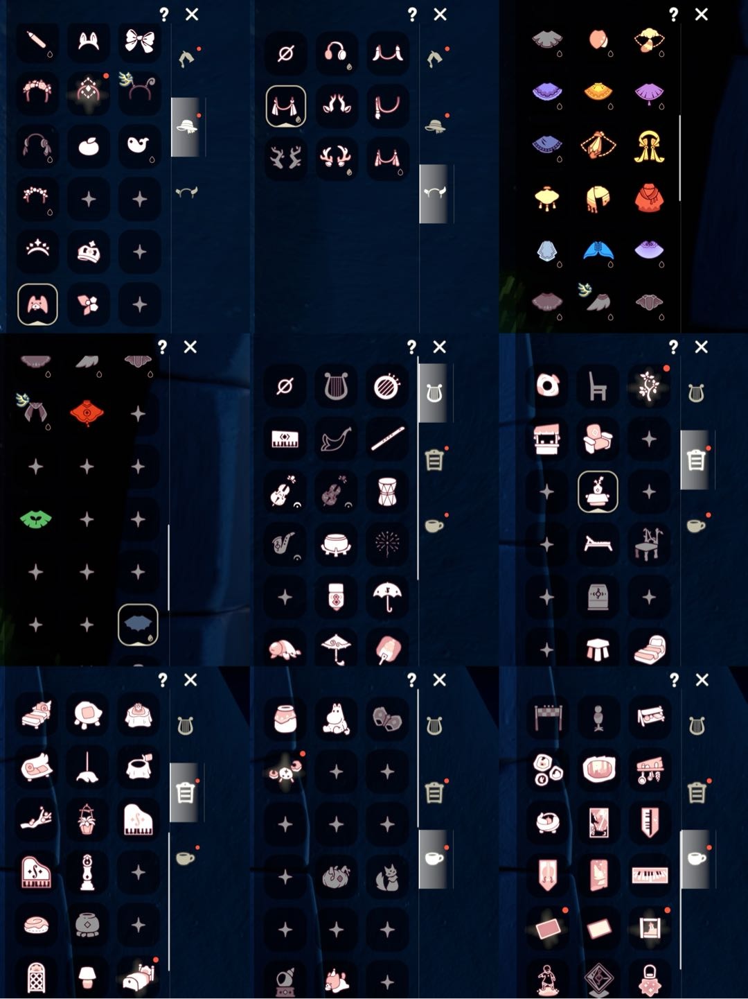 【毕业季】归巢季,九色鹿,筑巢季,二重奏季 【稀有礼包】瑞气服饰,彩虹武士裤,向日葵连衣裙,兔子拖鞋,神鹿祝福礼包,圣诞鹿角,姆明饰品套装,夏日有友礼包,巫师帽,蓝色音乐符,兔子发饰,大橘大利,鲤跃龙门,小狗周年头饰,四叶草头饰,小黄鸭发饰,福娃礼包,蝙蝠斗,白雪斗篷,绊爱斗,青衫落拓礼包,瑞气纸伞,献瑞折扇礼包,花憩茶桌,周年庆抱枕 【毕业物品】五塑彩带斗,五塑彩羽发,飘带斗篷,柔缎花边连,飞天盘发,光之子试衣,设计师长袍,二重奏三角,蓝色燕尾斗篷,二重奏海报,姆明抱枕,姆明红伞,蓝色星星光环 【热门复刻】绿芽,武士裤,正太头,虚荣,背带裤,红耳机,箬笠,军帽,黄鼠狼面具
