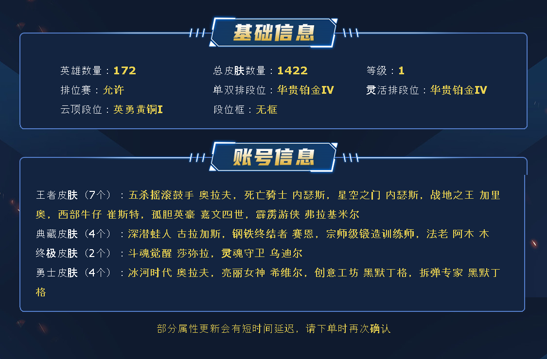 ~~喜欢记得收藏~~可排位~~1267皮全英雄~~租之前尽量查一下游戏ID,确保段位是您需要的,避免浪费您的时间~~请勿挂机逃跑故意送人头,谢谢合作,谢谢~~