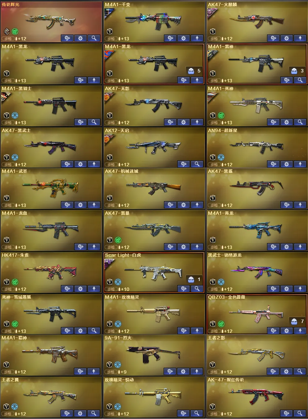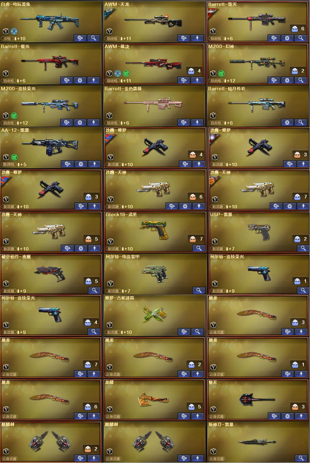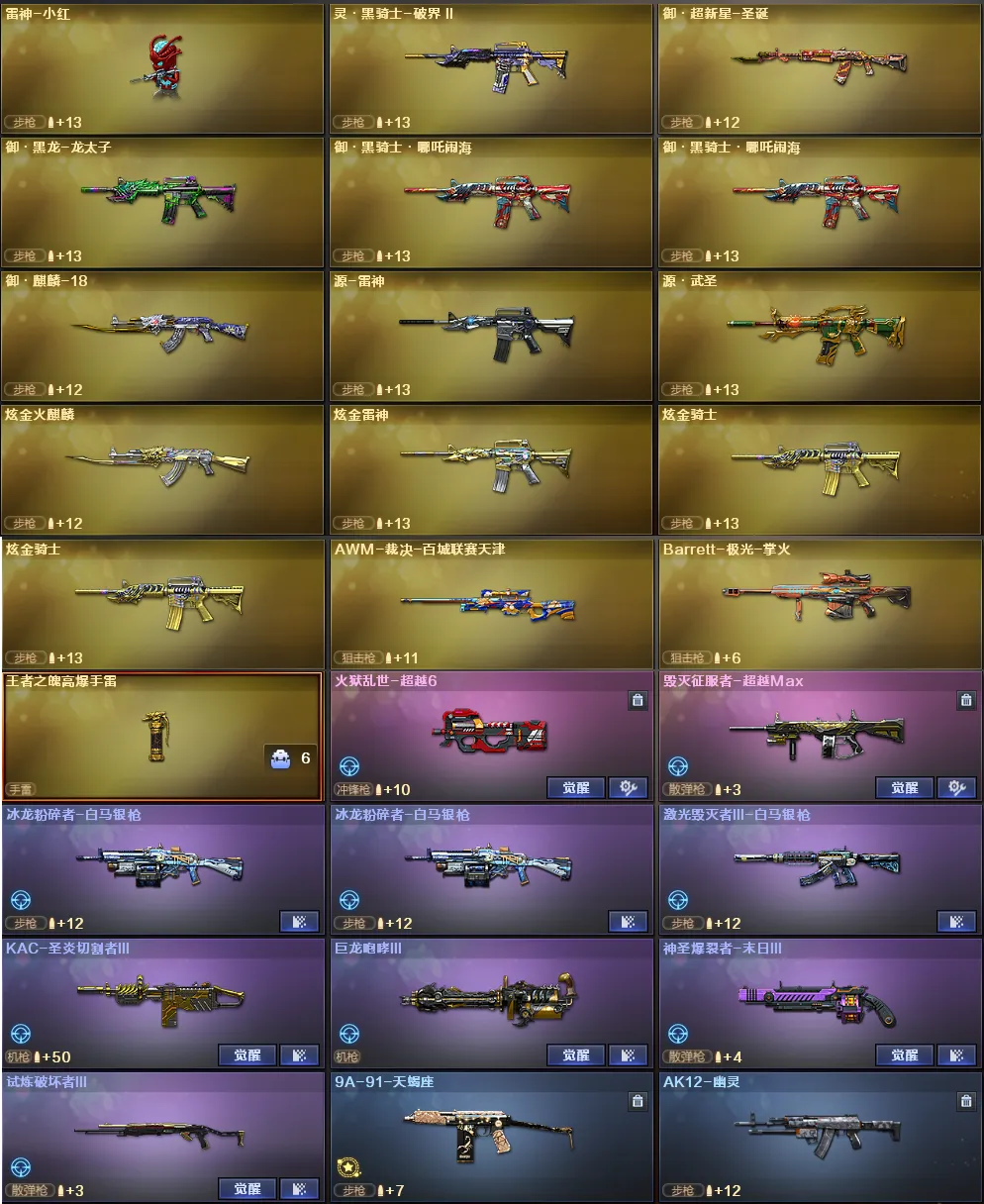 稀有武器:传说辉光、M200幻神、炽芒蝶刃、烈龙X7+斯泰尔蝴蝶、盘龙X6+5炼狱(炼狱百战金芒+3炼狱+炼狱惊涛骇浪)、USP雷暴、M200竞技荣光、QBZ金色蔷薇、Scarlight白虎、M4青龙、HK417朱雀、AK47雷暴、千变、火麒麟、黑龙X2、雷神、黑骑士、无影、死神、黑武士、天启、超新星、武圣、机械迷城、黑鲨、龙血、黑武士锦绣游龙、死神雪域霜狐、玫瑰精灵、猎神、9A91烈火、白虎电玩蓝兔、天龙、毁灭、极光、裁决、Barrett金色蔷薇、暗月传说、A12雷霆、修罗X3、天神X3、Glock武圣、破空枪刃夜魔、柯尔特电竞装甲、柯尔特竞技荣光X2、修罗古蛇迷踪、屠龙X5、擎天、龙啸、麒麟刺X2、斩神刀雷暴、尼泊尔电竞装甲、幻灵之锋、擎天竞技荣光、麒麟刺百战金芒、M4赤狱骑士、昌龙、M4玄龙、黑武士暗月、黑武士能量核心、火麒麟暗月、裁决百城联赛天津、极光掌火、炼狱掌火、火狱乱世-超越6、毁灭征服者-超越Max、冰龙粉碎者白马银枪X2、KAC圣炎切割者3、巨龙咆哮者3、神圣爆裂者-末日3、试炼破坏者3、MAC-10-远古神话