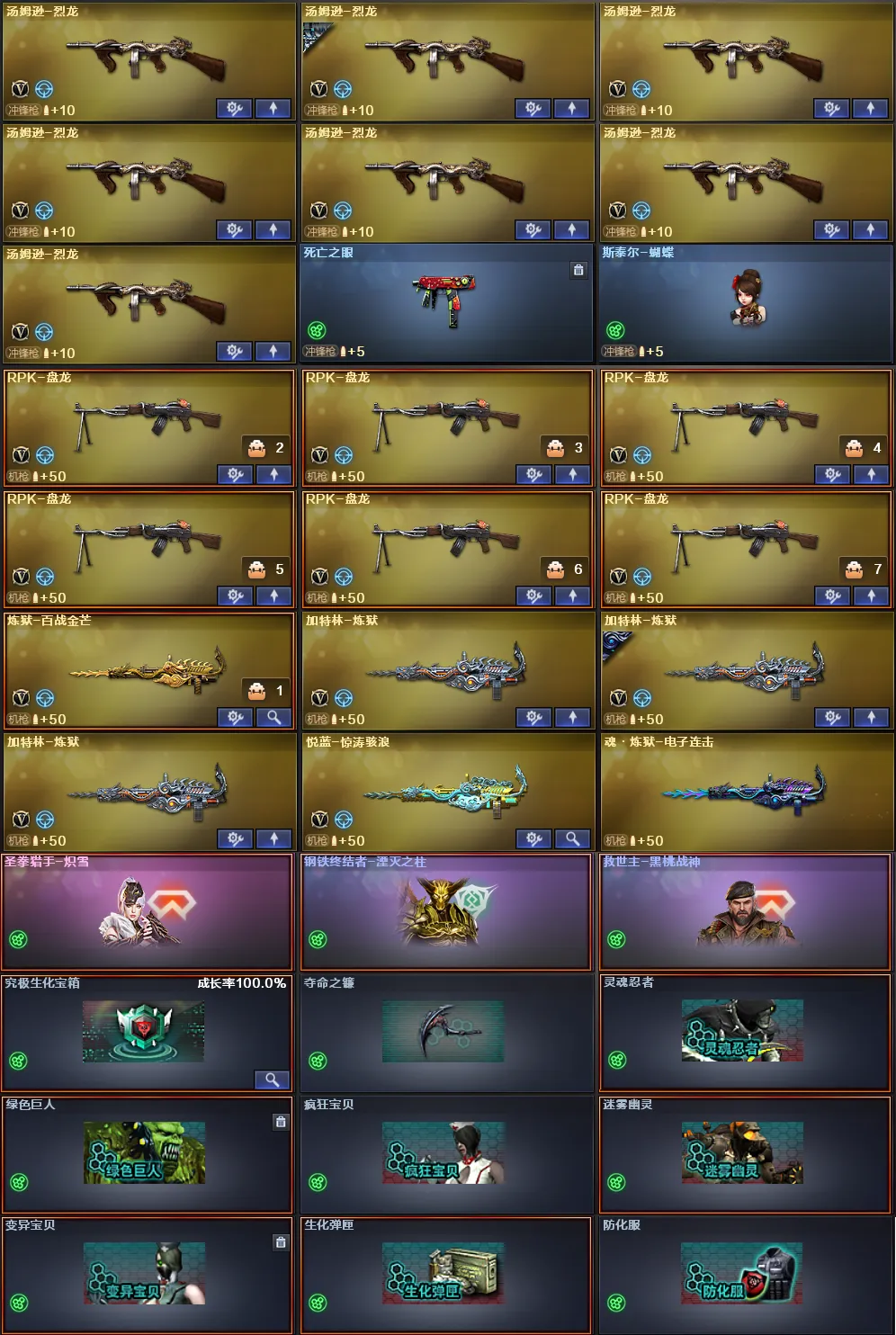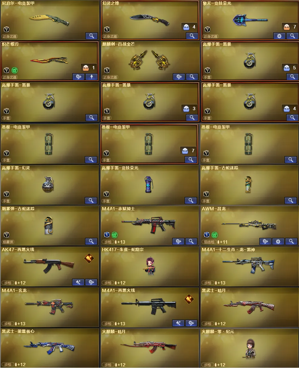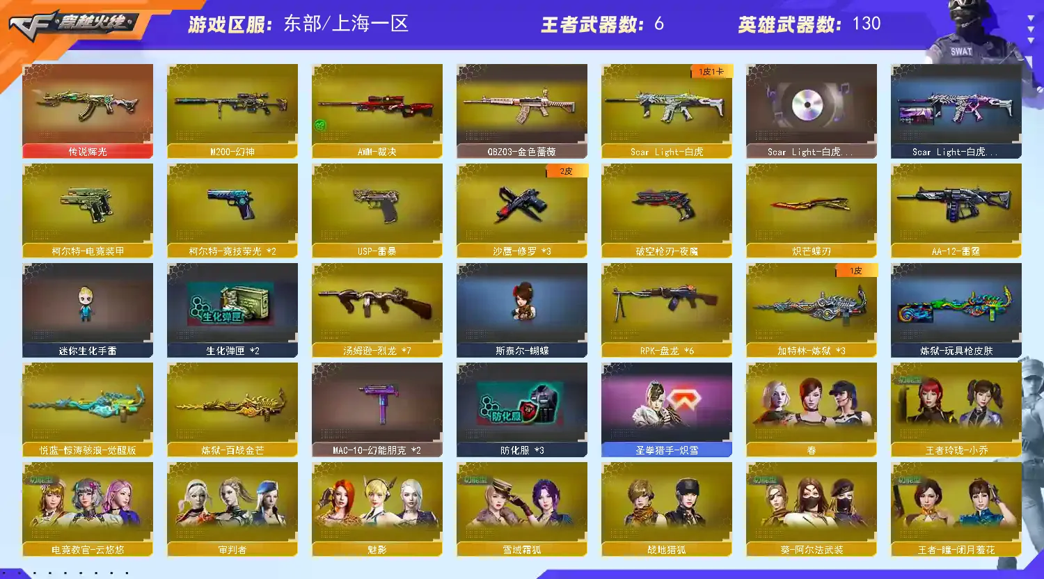 稀有武器:传说辉光、M200幻神、炽芒蝶刃、烈龙X7+斯泰尔蝴蝶、盘龙X6+5炼狱(炼狱百战金芒+3炼狱+炼狱惊涛骇浪)、USP雷暴、M200竞技荣光、QBZ金色蔷薇、Scarlight白虎、M4青龙、HK417朱雀、AK47雷暴、千变、火麒麟、黑龙X2、雷神、黑骑士、无影、死神、黑武士、天启、超新星、武圣、机械迷城、黑鲨、龙血、黑武士锦绣游龙、死神雪域霜狐、玫瑰精灵、猎神、9A91烈火、白虎电玩蓝兔、天龙、毁灭、极光、裁决、Barrett金色蔷薇、暗月传说、A12雷霆、修罗X3、天神X3、Glock武圣、破空枪刃夜魔、柯尔特电竞装甲、柯尔特竞技荣光X2、修罗古蛇迷踪、屠龙X5、擎天、龙啸、麒麟刺X2、斩神刀雷暴、尼泊尔电竞装甲、幻灵之锋、擎天竞技荣光、麒麟刺百战金芒、M4赤狱骑士、昌龙、M4玄龙、黑武士暗月、黑武士能量核心、火麒麟暗月、裁决百城联赛天津、极光掌火、炼狱掌火、火狱乱世-超越6、毁灭征服者-超越Max、冰龙粉碎者白马银枪X2、KAC圣炎切割者3、巨龙咆哮者3、神圣爆裂者-末日3、试炼破坏者3、MAC-10-远古神话