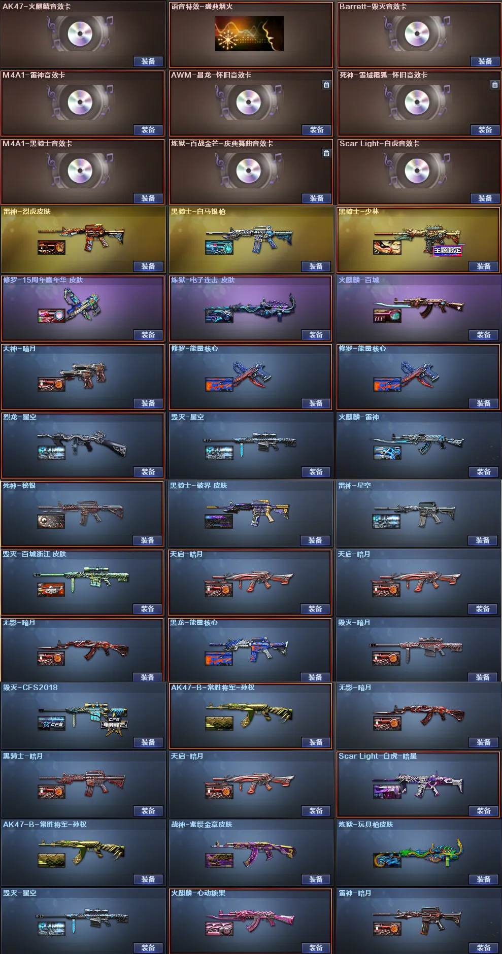 稀有皮肤:白虎暗星皮肤、雷神烈虎皮肤/虎将皮肤/星空皮肤/暗月皮肤、黑骑士白马银枪皮肤/破界皮肤/少林皮肤/暗月皮肤、修罗15周年嘉年华皮肤/能量核心皮肤、炼狱电子连击皮肤/玩具枪皮肤、火麒麟百城皮肤/心动糖果皮肤/CFstar皮肤/冠军之心皮肤/雷神皮肤、天神暗月皮肤、烈龙星空皮肤、死神秘银皮肤、毁灭百城浙江皮肤/CFS2018皮肤/星空皮肤/暗月皮肤、无影暗月皮肤、黑龙能量核心皮肤、天启暗月皮肤、天龙CFstar皮肤、千变孔明皮肤