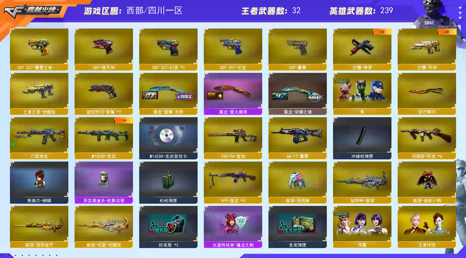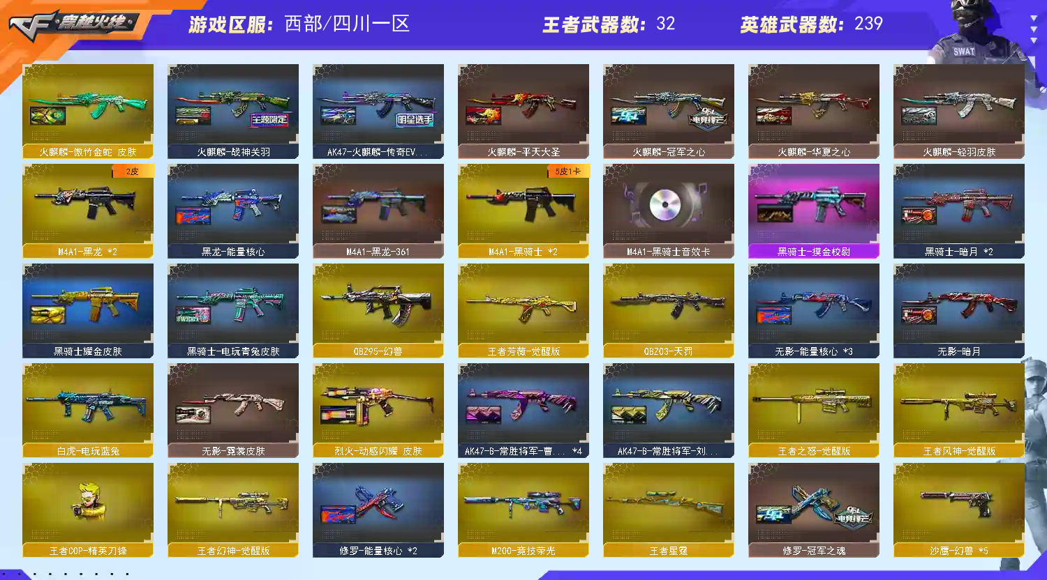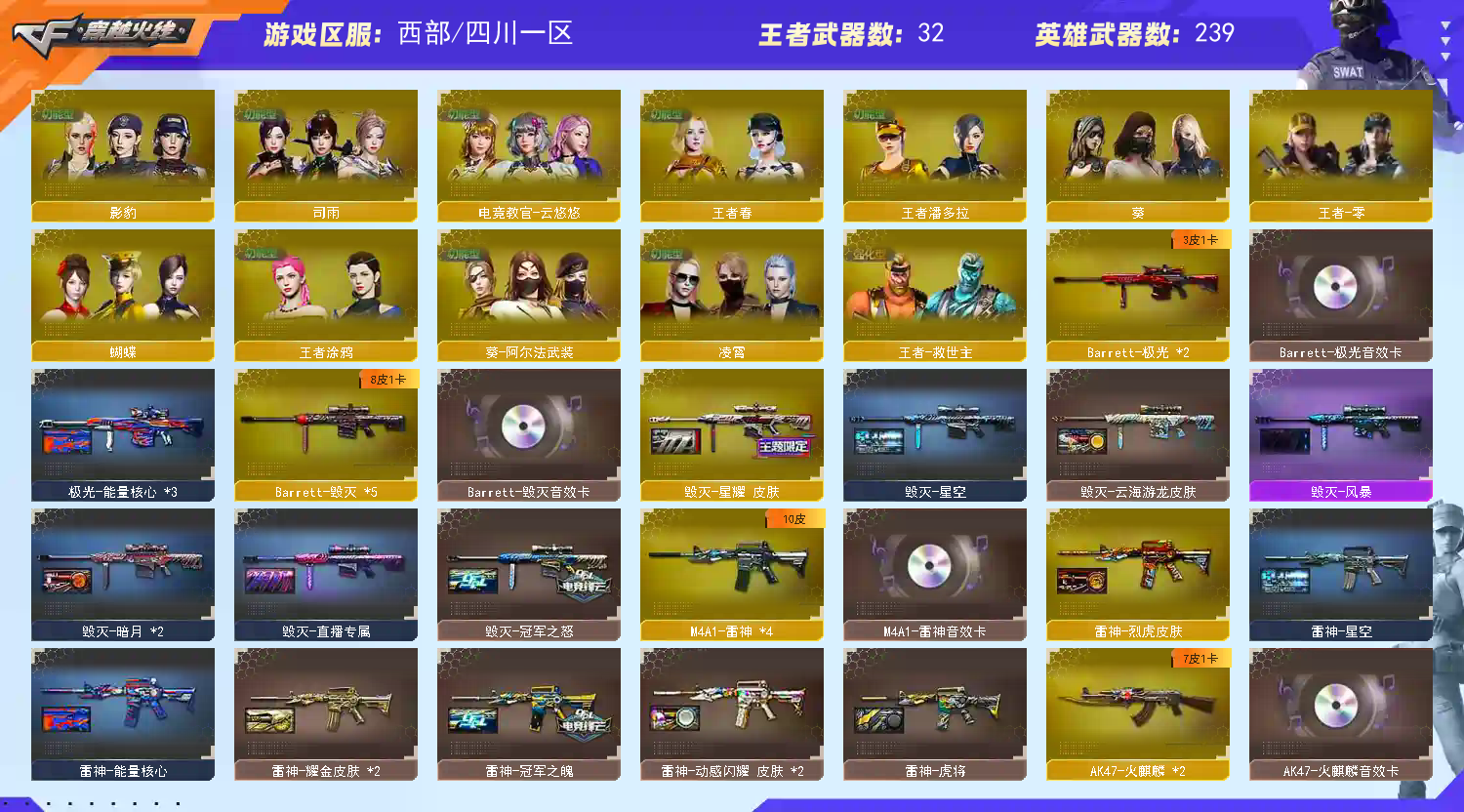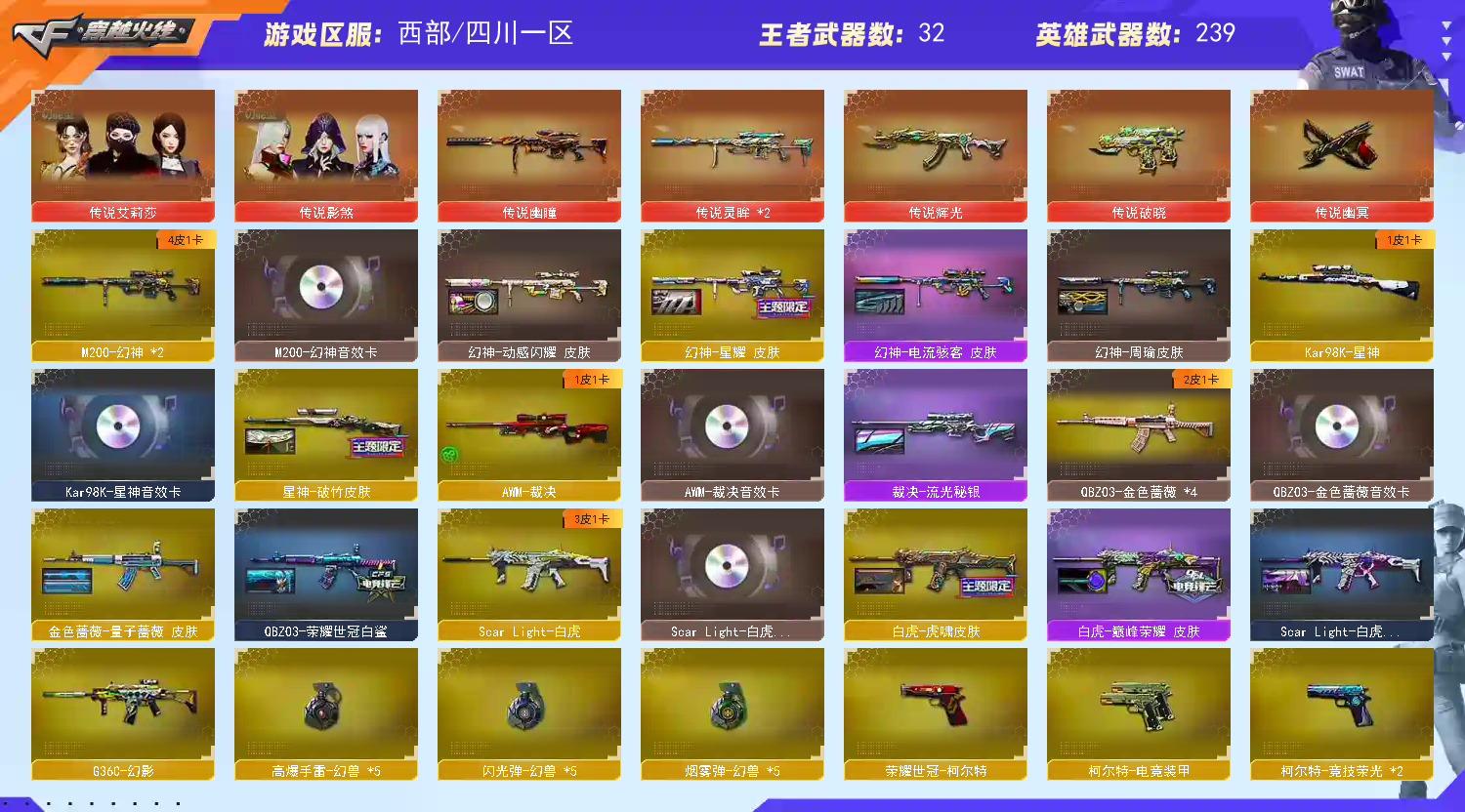 【幻神三件套】【幻神4皮】【星神三件套】【裁决三件套】【白虎三件套】【金色蔷薇三件套】【6烈龙】【MK5-炽火炎龙】【斯泰尔-蝴蝶】【死亡之眼】【炼狱-泡泡象】【炼狱-迷你小钢】【竞技荣光套装X6套】【幻灵套装X7套】【雷暴套装X4套】【夜魔套装X7套】【雷霆套装X1套】【幻兽套装X5套】【传说影煞】【传说艾莉莎】【传说幽瞳】【传说灵眸】【传说辉光】【传说破晓】【传说幽冥】【QBZ95-幻兽】【破空枪刃】【沙鹰-幻兽】【高爆手雷-幻兽】【闪光弹-幻兽】【烟雾弹-幻兽】【M200-幻神】【幻神-星耀 皮肤】【幻神-周瑜皮肤】【幻神-电流骇客 皮肤】【幻神-动感闪耀 皮肤】【M200-幻神音效卡】【M200-竞技荣光】【王者幻神-觉醒版】【王者风神-觉醒版】【Kar98K-星神】【星神-破竹皮肤】【Kar98K-星神音效卡】【王者星霆】【AWM-裁决】【AWM-裁决音效卡】【裁决-流光秘银】【Scar Light-白虎】【白虎-巅峰荣耀 皮肤】【白虎-虎啸皮肤】【Scar Light-白虎-暗星】【白虎-电玩粉兔皮肤】【Scar Light-白虎音效卡】【白虎-电玩蓝兔】【QBZ03-金色蔷薇】【金色蔷薇-量子蔷薇 皮肤】【QBZ03-荣耀世冠白鲨】【QBZ03-金色蔷薇音效卡】【QBZ03-天罚】【王者芳薇-觉醒版】【八面凌龙】【八面凌龙玩偶】【G36C-幻影】【QBZ191-银翼游侠】【M4A1-青龙】【HK417-朱雀】【M14EBR-玄武】【M4A1-夜魔】【M4A1-幻灵】【USP-雷暴】【荣耀世冠-柯尔特】【柯尔特-竞技荣光】【破空枪刃】【沙鹰-幻兽】【COP 357-幻灵】【COP-堕天神】【COP 357-云龙】【COP 357-雷霆王者-觉醒版】【破空枪刃-夜魔】【炽芒蝶刃】【丛林匕首-玄豹】【黄金猫猫手套-白鲨】【炼狱-泡泡象】【炼狱-迷你小钢】【加特林-炼狱】【RPK-盘龙】【炼狱-悦蓝-觉醒版】【炼狱-百战金芒】【汤姆逊-烈龙】【烈龙-云海游龙】【斯泰尔-蝴蝶】【异变清道夫-蛇影双骄】【MK5-炽火炎龙】【死亡之眼】【炼狱-泡泡象】【传说艾莉莎】【传说影煞】【电竞教官-云悠悠】【蝴蝶】【葵】【凌霄】【奇洋探员】【乔伊教练】【蛇隐宗】【司雨】【王者春】【王者-救世主】【王者-零】【王者玲珑】【王者潘多拉】【王者涂鸦】【新海豹突击队】【修道士】【影豹】【雨墨】【云海玲珑】【隼】【M4A1-雷神】【雷神-冠军之魄】【雷神-动感闪耀 皮肤】【雷神-烈虎皮肤】【雷神-虎将】【雷神-能量核心】【雷神-耀金皮肤】【雷神-星空】【M4A1-雷神音效卡】【AK47-火麒麟】【火麒麟-傲竹金蛇 皮肤】【AK47-火麒麟-传奇EVEN】【火麒麟-冠军之心】【火麒麟-华夏之心】【火麒麟-轻羽皮肤】【火麒麟-战神关羽】【火麒麟-平天大圣】【火麒麟-CFSTAR】【AK47-火麒麟音效卡】【M4A1-黑骑士】【黑骑士耀金皮肤】【黑骑士-摸金校尉】【黑骑士-暗月】【黑骑士-电玩青兔皮肤】【M4A1-黑骑士音效卡】【M4A1-黑龙】【M4A1-黑龙-361】【黑龙-能量核心】【黑龙-暗月】【Barrett-毁灭】【毁灭-冠军之怒】【毁灭-星耀 皮肤】【毁灭-星空】【毁灭-直播专属 】【毁灭-云海游龙皮肤】【毁灭-暗月】【毁灭-风暴】【Barrett-毁灭音效卡】