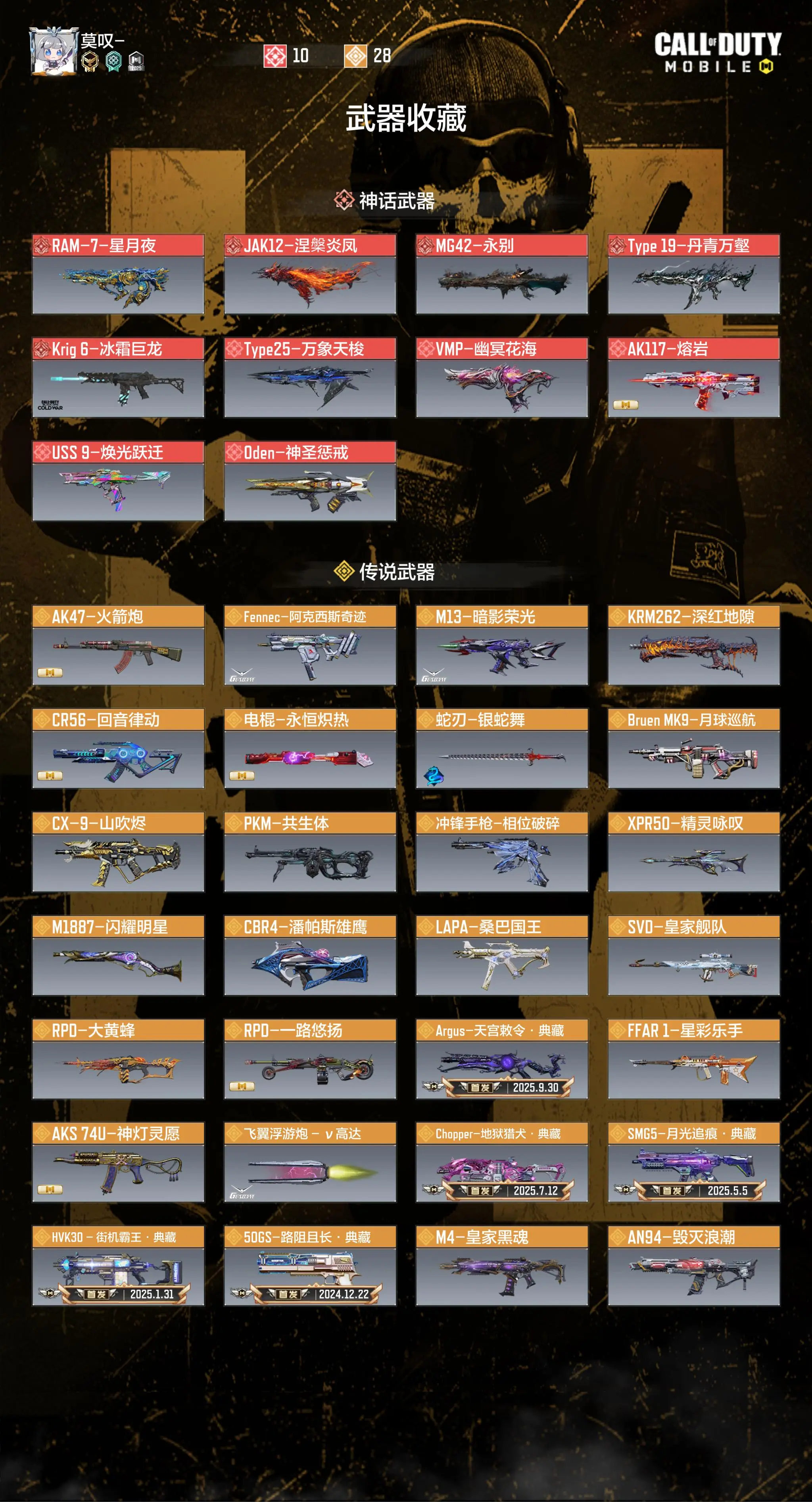 AK47-火箭炮 Fennec-阿克西斯奇迹 M13-暗影荣光 KRM262-深红地隙 CR56-回音律动 电棍-永恒炽热 蛇刃-银蛇舞 BruenMk9-月球巡航 CX-9-山吹烬 PKM-共生体 冲锋手枪-相位破碎 XPR50-精灵咏叹 M1887-闪耀明星 CBR4-潘帕斯雄鹰 LAPA-桑巴国王 SVD-皇家舰队 RPD-大黄蜂 RPD-一路悠扬 Argus-天宫敕令·典藏 FFAR1-星彩乐手 AKS74U-神灯灵愿 飞翼浮游炮-v高达 Chopper-地狱猎犬·典藏 SMG5-月光追痕·典藏 HVK30-街机霸王·典藏 50GS-路阻且长·典藏 M4-皇家黑魂 AN94-毁灭浪潮