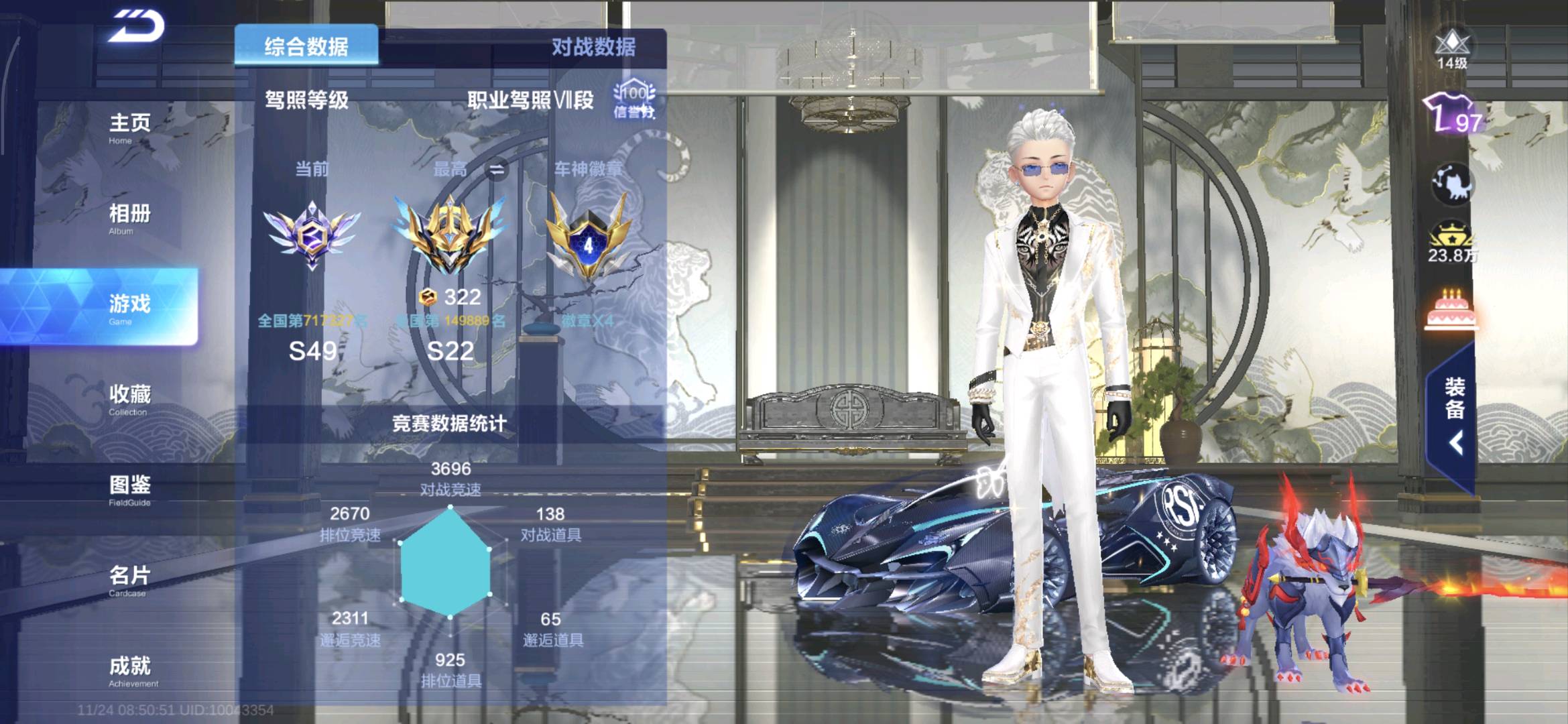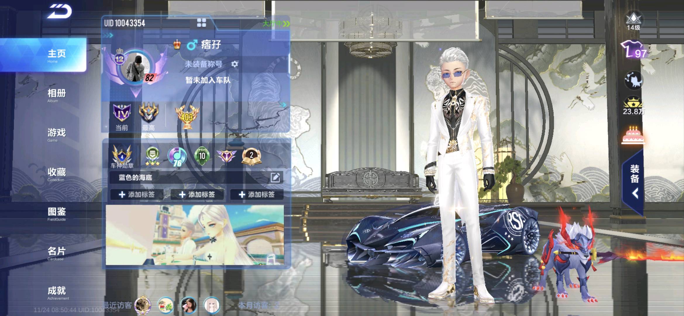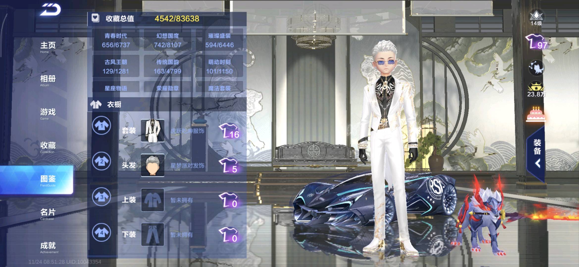 等级82级 魅力值23.8w 男魔法装7 女魔法装3 时装多样化