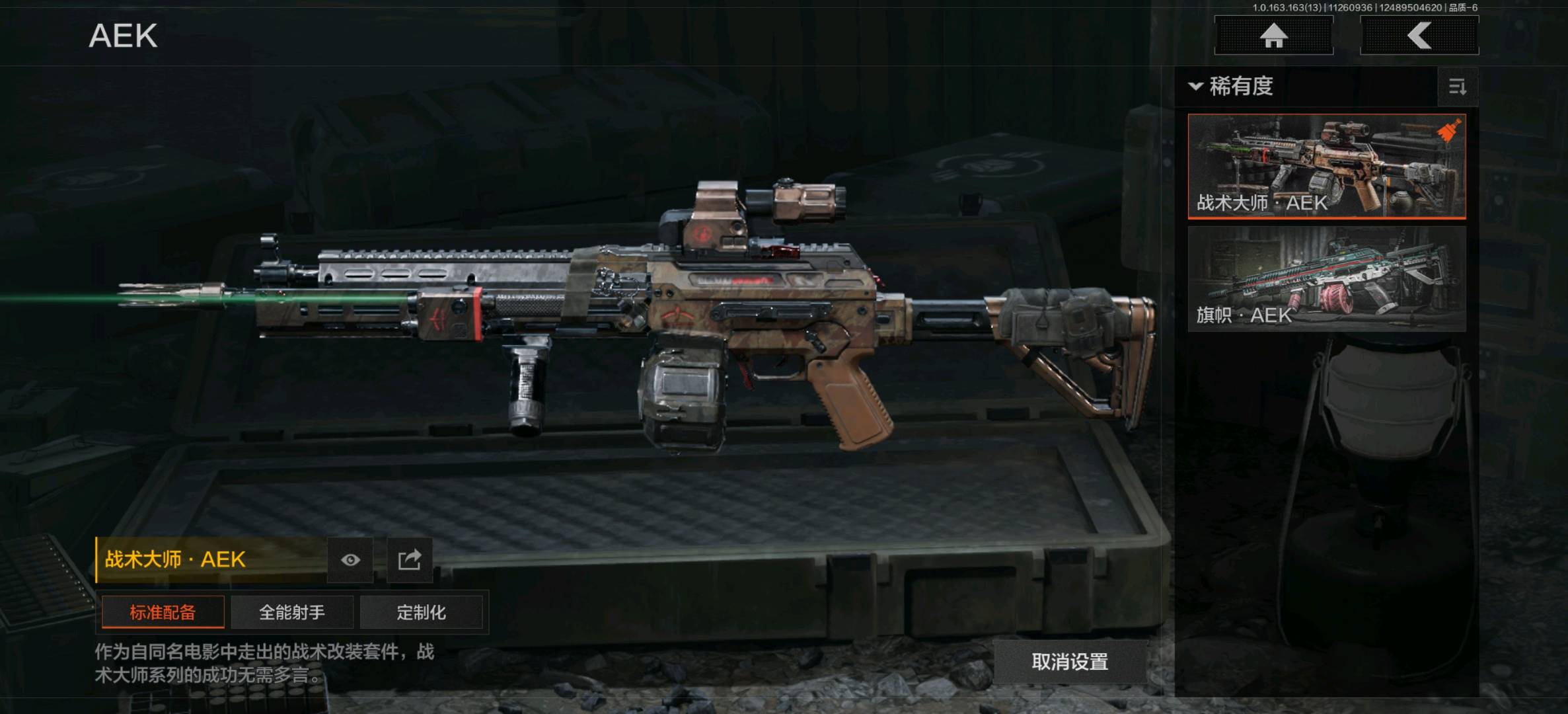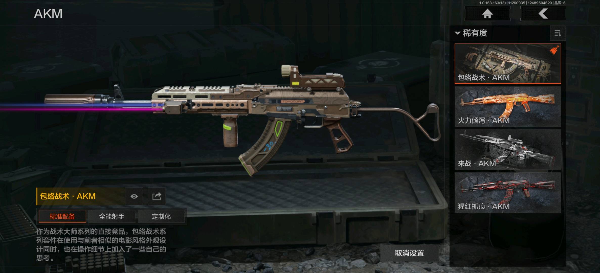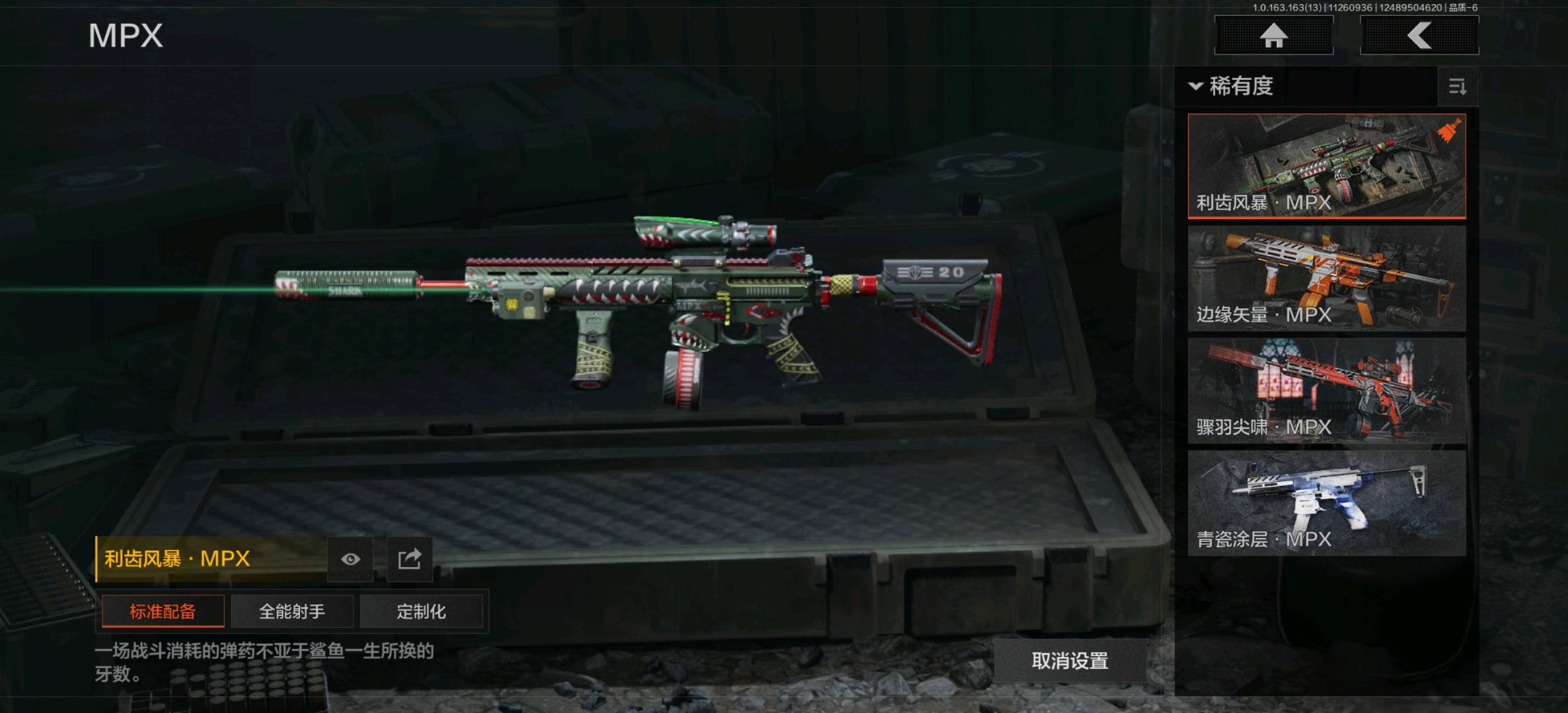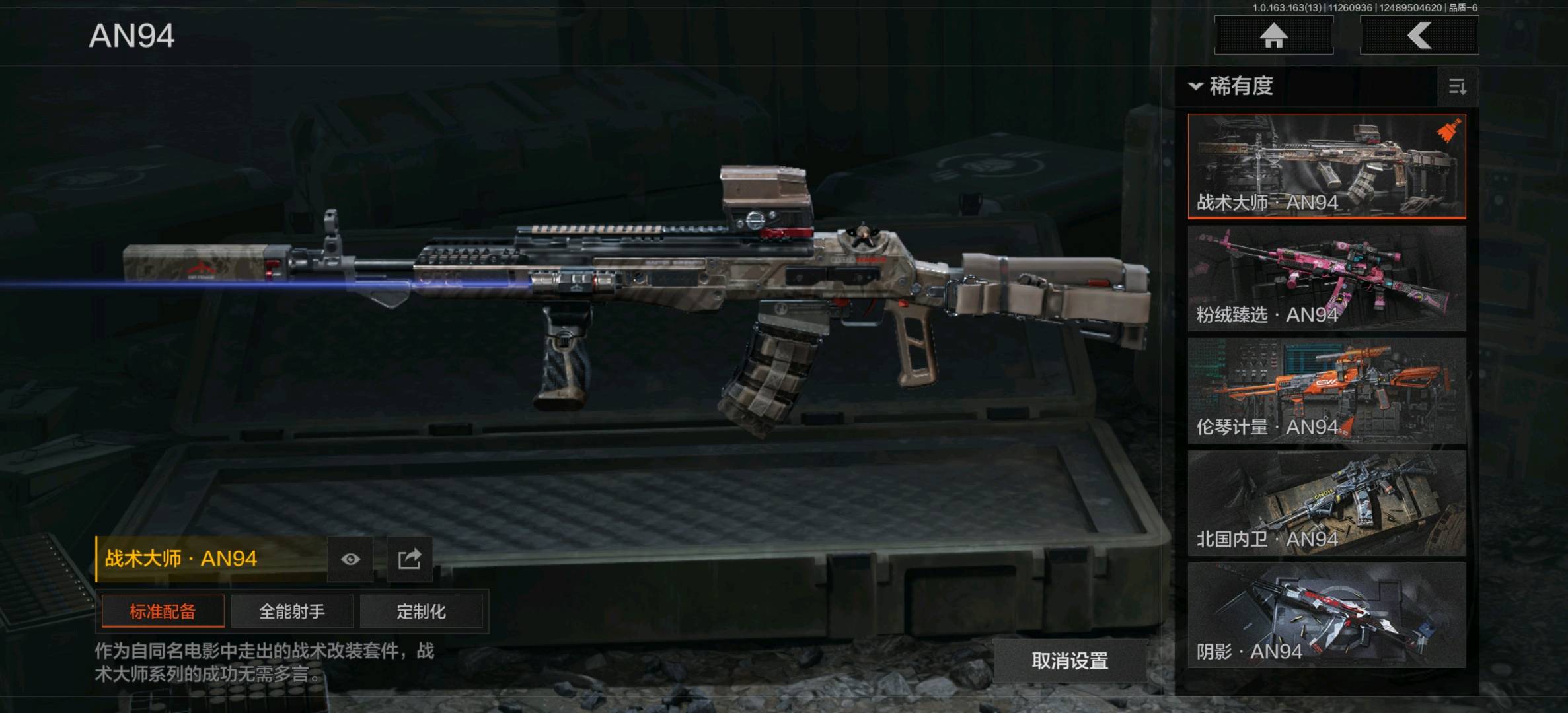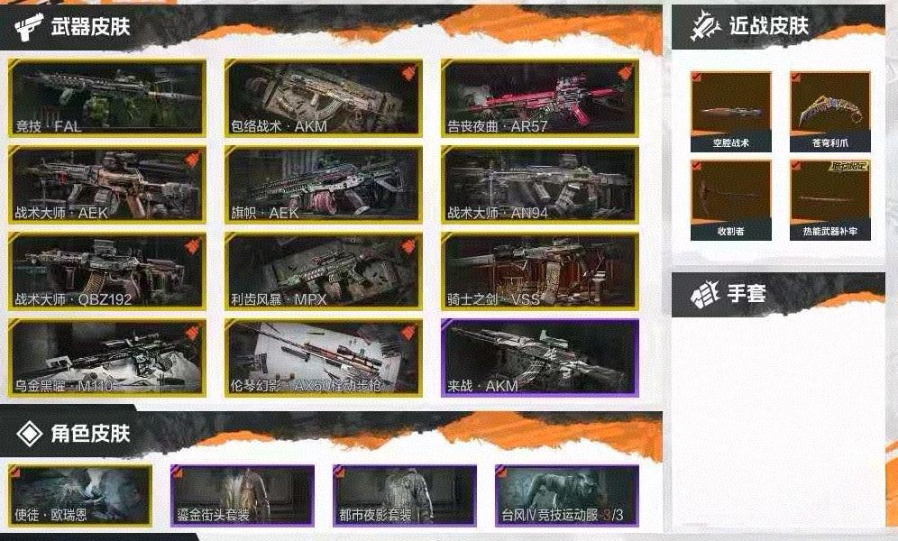 竞技FAL,包络战术AKM,告丧夜曲AR57,战术大师AEK,旗帜AEK,战术大师AN94,战术大师QBZ192,来战AKM,潜渊蛇鳞M4A1,幻域莎绫M4A1,竞技MDR,北国内卫MDR,炎夏浪花H416,自喷网格H416,鱼跃丹青AK102,白垩游魂AK102,火力倾泻AUG,战术大师AK74N,来战AK74N,莫克斯AKS74U,骑士之剑AKS74U,逆火玄石F2000,钢铁真理F2000,炎夏浪花AR57,战术大师ACE31,骑士之剑ACE31,粉绒臻选AN94,伦琴计量AN94,北国内卫AN94,阴影AN94,典礼武备Groza,巡林客T951,伦琴计量T951,武侍FAMAS,利齿风暴T03,07式林地迷彩QBZ191;利齿风暴MPX,边缘矢量MPX,骤羽尖啸MPX,高塔之内P90,利齿风暴T79,伦琴计量Vector45,鱼跃丹青T85,战术大师Suomi;