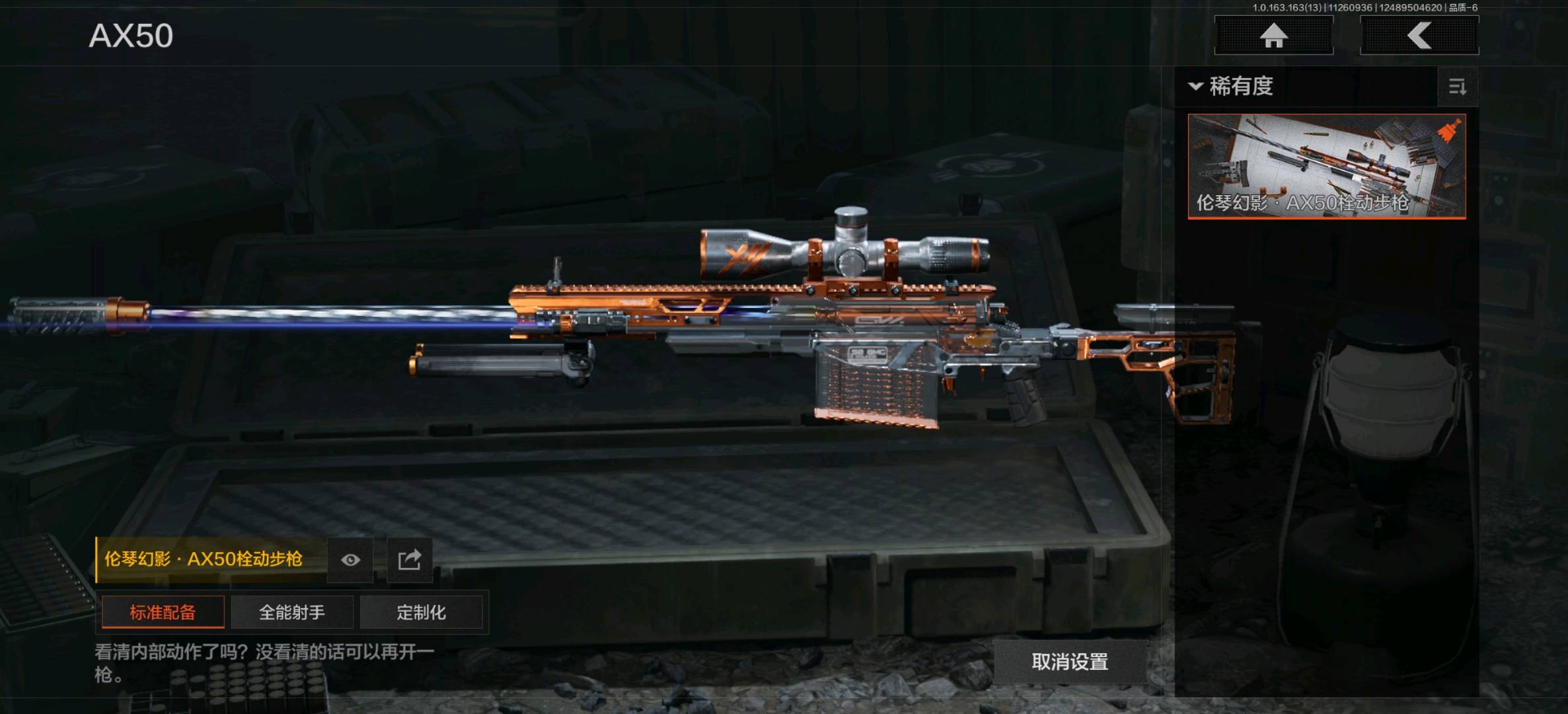伦琴幻影AX50栓动步枪,饰金AR30,战术大师SJ16,骑士之剑SJ16,护命金翎M24;战术大师SKS,逆火玄石M16;白貂F57