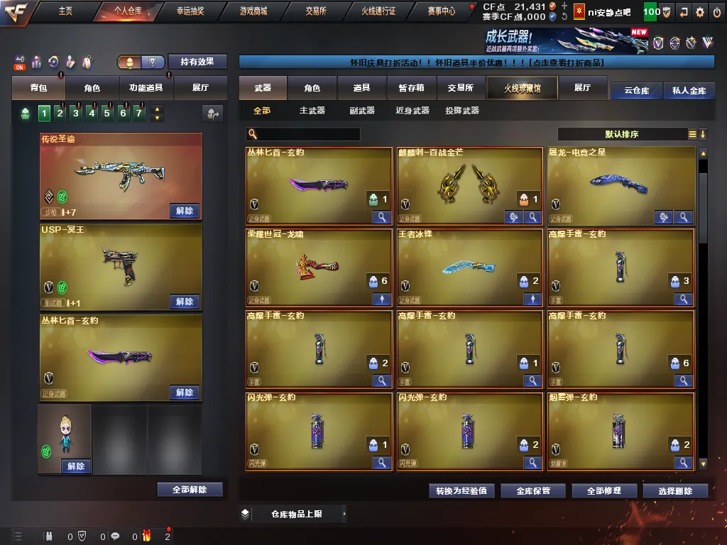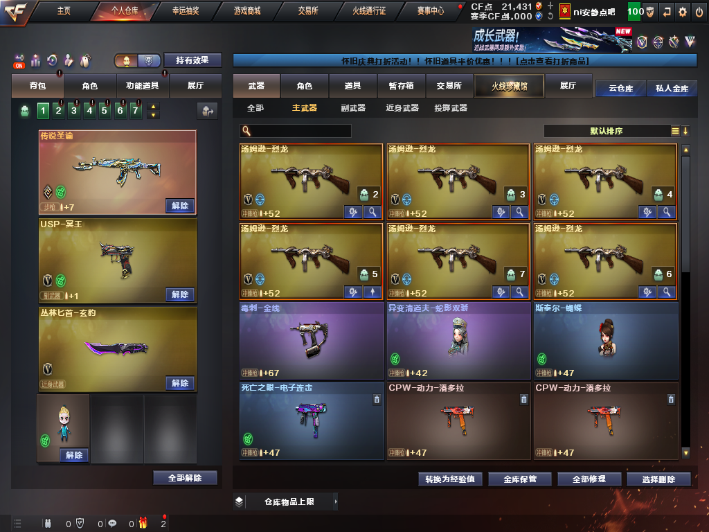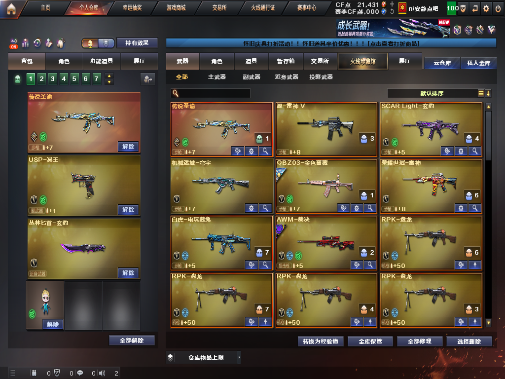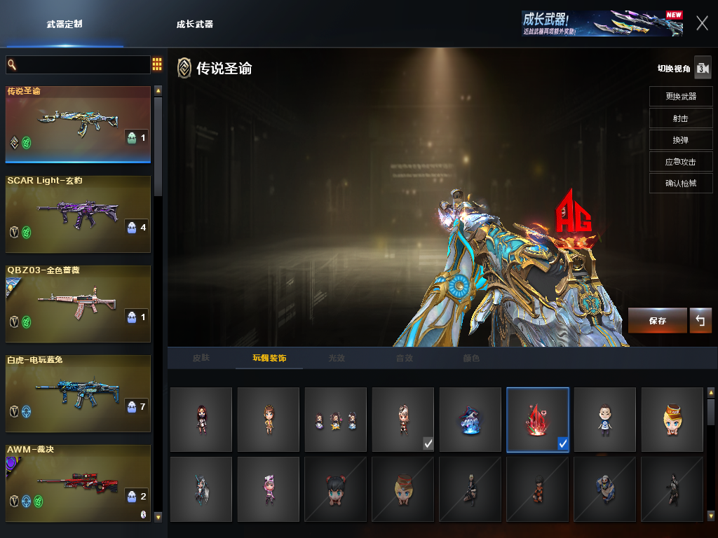 【主武器】传说圣谕/裁决/SCARLight-玄豹/蔷薇qbz/荣耀世冠雷神/白虎电玩蓝兔/斯太尔蝴蝶/异变清道夫蛇影双骄/毒刺-金线/炼狱/炼狱百战金芒/⑥烈龙⑥盘龙/苍鸣雷神/火麒麟零纪元/双面神竞魂/EVO赤血龙魂/