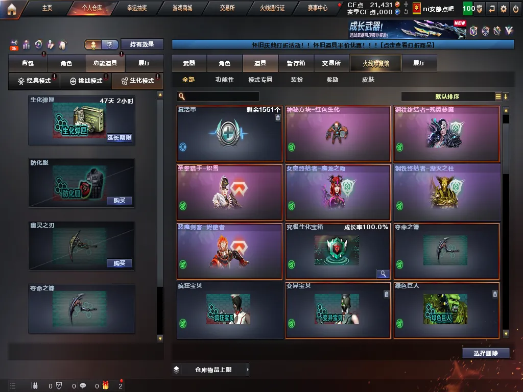 【道具】紫金大元首/全背包/AC/烟雾头/VIP6/变异宝贝/灵魂忍者/疯狂宝贝/迷雾幽灵/绿巨人/步枪/冲锋枪/生化弹夹/圣泉猎手-炽雪皮肤/钢铁终结者-残翼恶魔皮肤/女皇终结者-魔龙之吻皮肤/钢铁终结者-湮灭之柱皮肤/恶魔剑客皮肤/生化爆破全装号