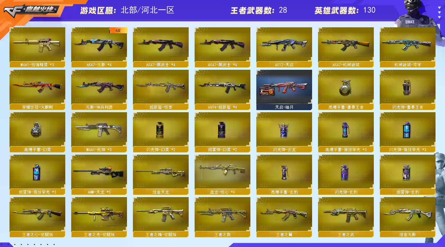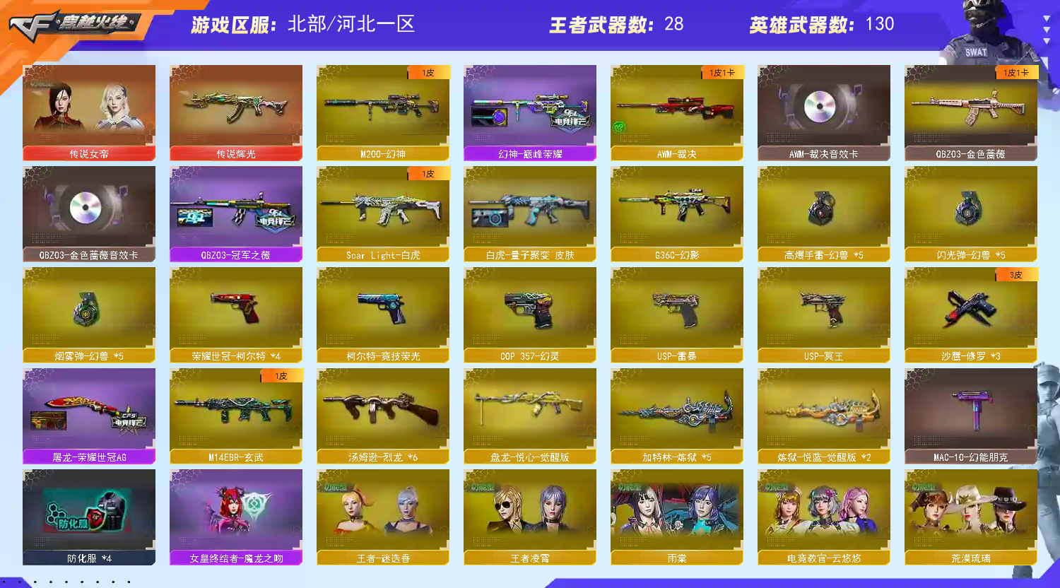 【稀有武器】:传说辉光/M200-幻神/G36C-幻影/ScarLight-白虎/M14EBR-玄武/USP-雷暴/COP357-幻灵/柯尔特-竞技荣光/破空枪刃/沙鹰-幻兽(5)/荣耀世冠-柯尔特(4)/QBZ03-金色蔷薇/M4A1-雷神/汤姆逊-烈龙(6)/usp冥王