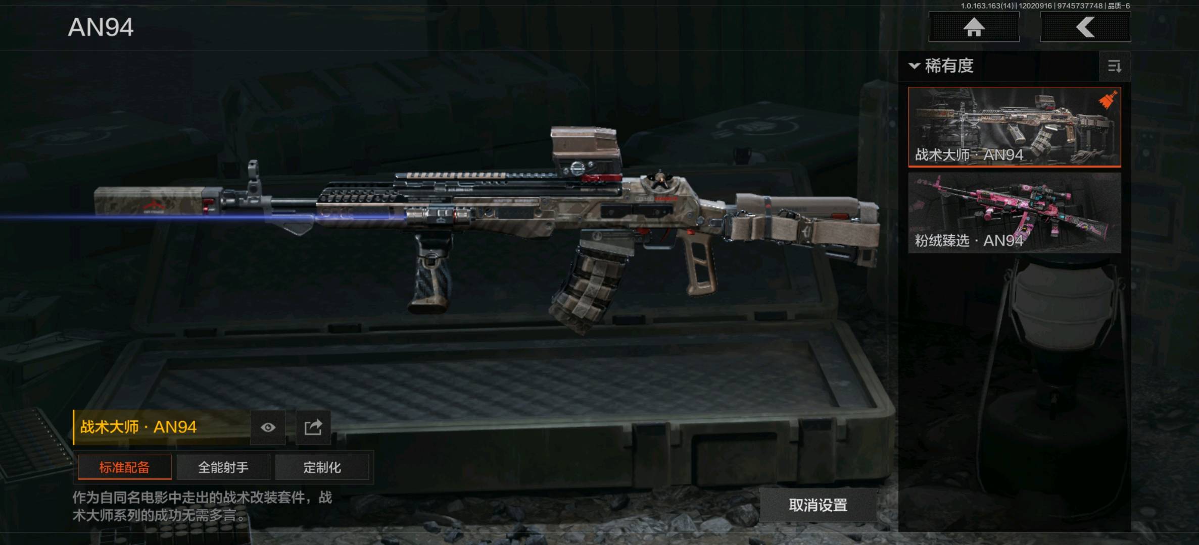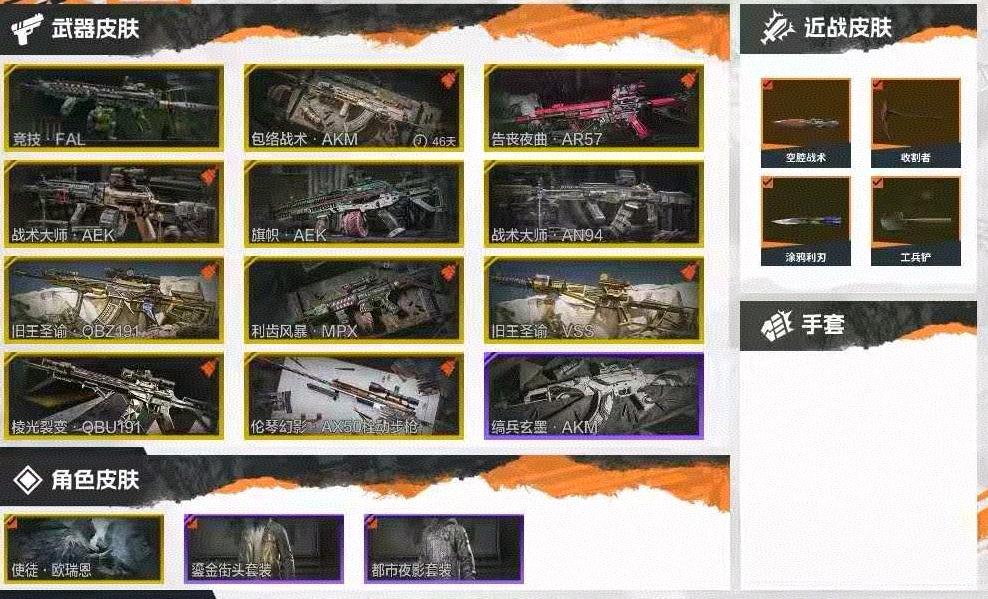 竞技FAL,包络战术AKM,告丧夜曲AR57,战术大师AEK,旗帜AEK,战术大师AN94,旧王圣谕QBZ191,缟兵玄墨AKM,历战AKM,自喷网格H416,德尔塔小队H416,竞技MDR,正在骇入MDR,涂鸦AK102,战术大师AK74N,棱光裂变AK74N,来战AK74N,山地伪装AK74N,火力倾泻AUG,钢铁真理F2000,炎夏浪花AR57,涂绘猎人AR57,粉绒臻选AN94,武侍FAMAS,巡林客T951,伦琴计量T951,利齿风暴T03,林地数码T03,骤羽尖啸AK12,07式林地迷彩QBZ191,利齿风暴MPX,湖冰倒影MP5,骤羽尖啸MPX,涂鸦MPX,利齿风暴T79,伦琴计量Vector45,战术大师Suomi;