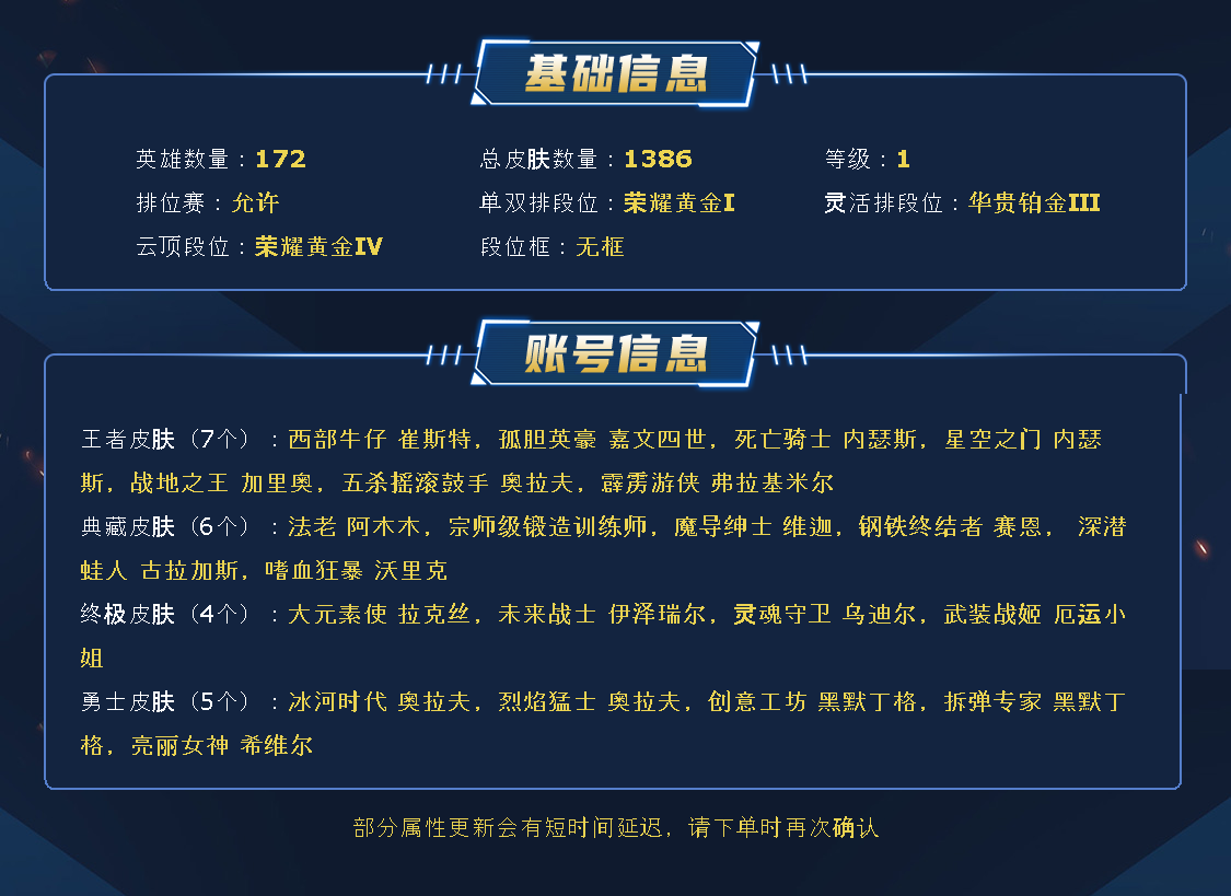 ~~喜欢记得收藏~~可排位~~1400皮全英雄~~租之前尽量查一下游戏ID,确保段位是您需要的,避免浪费您的时间~~请勿挂机逃跑故意送人头,谢谢合作,谢谢~~