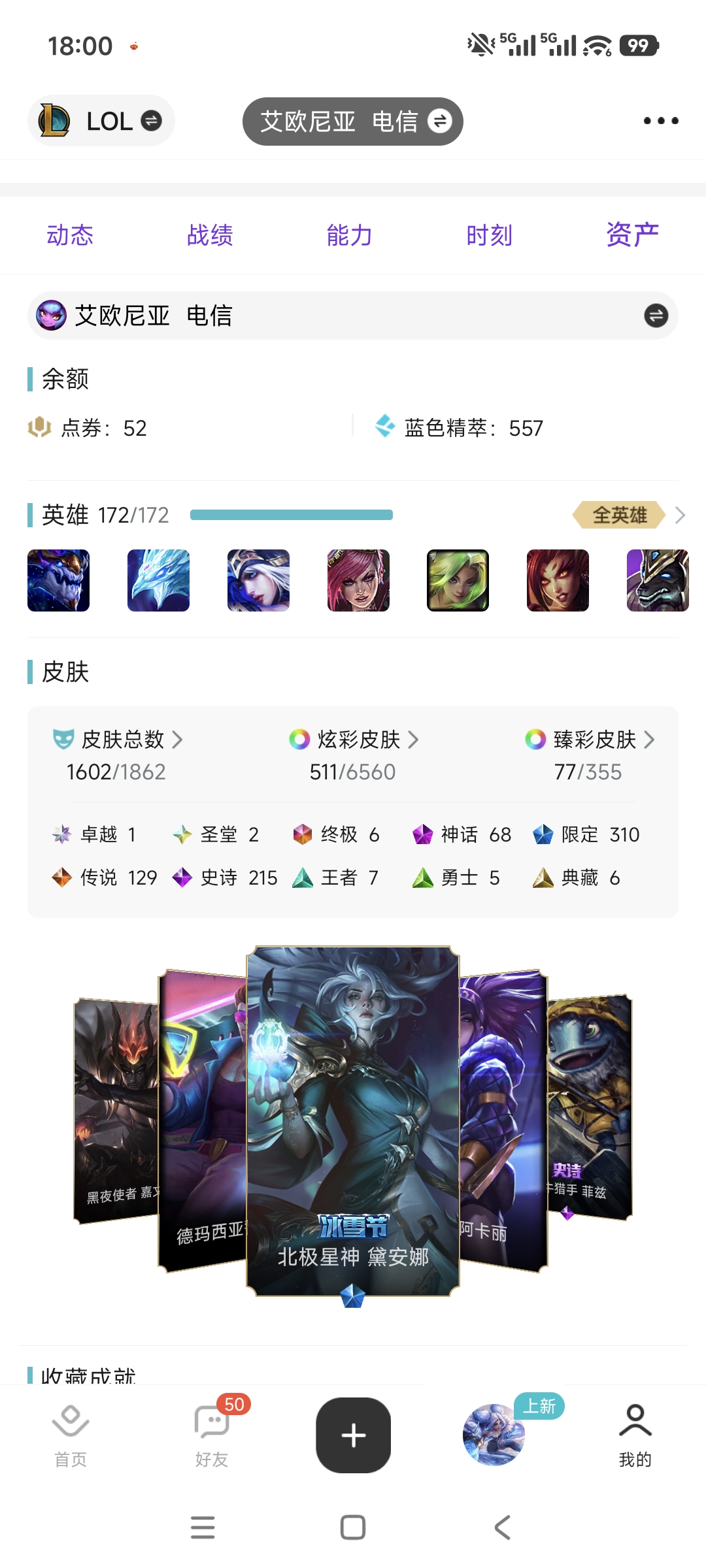 艾欧尼亚原皮1602/️全英雄可下棋可排位/铁男金克斯/2圣堂/6终极️/68神话至臻/幻想狐狸女枪/殿堂卡莎