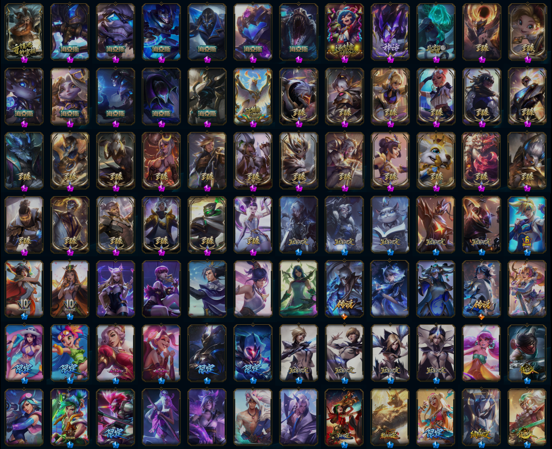 【重要皮肤】北极星使者沃里克至臻 青花瓷拉克丝至臻 女帝黛安娜至臻 战斗学院蕾欧娜至臻 魔女婕拉至臻 奥术师佐伊至臻 未来战士卢锡安至臻 真实伤害亚索至臻 真实伤害赛娜至臻 灵能特工伊泽瑞尔至臻 源计划逆流塞拉斯至臻 源计划阴劫至臻 暗星墨菲特至臻 神龙尊者炎龙瑟提至臻 神龙尊者均衡之龙沃利贝尔至臻 征服者贾克斯至臻 飞升战神潘森至臻 焰执事布兰德至臻 KDA二代卡莎至臻 烈焰美人薇恩至臻 魅惑女巫厄运小姐至臻 魅惑女巫厄运小姐2022至臻 源计划正义艾瑞莉娅至臻 真实伤害奇亚娜至臻 绒毛菲兹至臻 绒毛菲兹2022至臻 未来战士锤石至臻 未来战士锤石2022至臻 黑夜使者李青至臻 黑夜使者李青2022至臻 海克斯科技雷克顿 海克斯科技吉格斯 海克斯科技玛尔扎哈 海克斯科技波比 海克斯科技嘉文四世 海克斯科技阿利斯塔 海克斯科技阿木木 海克斯科技拉莫斯 海克斯科技魔腾 海克斯科技崔丝塔娜 水晶掠夺者卡兹克 光明哨兵奥拉夫 零之枪骑赫卡里姆 胜利剑圣易 胜利女神娑娜 胜利之王泰达米尔 胜利巨口克格莫 战熊骑士瑟庄妮 钢铁军团拉克丝 养蜂人辛吉德 电玩勇者锐雯 电玩女神阿狸 星之守护者伊泽瑞尔 神凰行者幽羽玄凰萨勒芬妮 神凰行者烈羽焰凰霞 银龙裁决泰隆 天龙之子斯莫德 天龙之子易 虎头虎脑崔丝塔娜 招财进宝提莫 神龙烈焰金克丝 你看见过我的熊猫吗安妮 北辰之威内瑟斯 南天之怒沃里克 美猴王孙悟空 玉净夜叉凯特琳 司马懿仲达 金猪烈焰瑟庄妮 征服者贾克斯 福牛守护者阿利斯塔 福牛守护者嘉文四世 碎心之拳蔚 甜心宝贝安妮 穿心之剑菲奥娜 觅心游侠卢锡安 觅心女王艾希 觅心之翼奎因 觅心萝莉金克丝 觅心猎手薇恩 冬境仙灵索拉卡 冬季仙境奥莉安娜 圣诞捣蛋鬼金克丝 圣诞老人布隆 冰雪驯鹿波比 冰雪风暴希维尔 冬季仙境卡尔玛 持胡萝卜的雪人易 冰雪女神辛德拉 魄罗骑士瑟庄妮 平安夜女神娑娜 圣诞糖果棒厄运小姐 魅惑女巫迦娜 魅惑女巫莫甘娜 魅惑女巫崔丝塔娜 魅惑女巫奈德丽 大魔法锅布里茨 死亡誓约劫 克烈古拉伯爵 小恶魔菲兹 南瓜头王子阿木木 海之歌艾希 海之歌萨勒芬妮 海之歌永恩 海之歌泽丽 泳池派对凯特琳 泳池派对佐伊 泳池派对辛德拉 泳池派对嘉文四世 泳池派对黑默丁格 泳池派对厄运小姐 泳池派对塔里克 泳池派对菲奥娜 泳池派对格雷福斯 泳池派对雷克顿 泳池派对布隆 电玩战魂赫卡里姆 斩星魔剑易 穿星魔锋赵信 送披萨的小姐姐希维尔 制胜金靴李青 制胜金球拉莫斯 EDG厄斐琉斯 EDG格雷福斯 EDG悠米 DWG蕾欧娜 FPX锤石 FPX李青 iG卡蜜尔 iG洛 iG卡莎 iG乐芙兰 iG菲奥娜 SSG纳尔 SSG塔莉垭 SSG嘉文四世 SKTT1伊莉丝 SKTT1雷克顿 SSW雷恩加尔 SSW泰隆 SSW图奇 SSW辛吉德 SKTT1贾克斯 SKTT1婕拉 SKTT1李青 SKTT1薇恩 暗杀星奥莉安娜 暗杀星蒙多 暗杀星努努和威朗普 Fnatic迦娜 Fnatic库奇 Fnatic古拉加斯 Fnatic嘉文四世 冰雪节格雷福斯 冰雪节玛尔扎哈 冰雪节辛吉德 防暴机器人布里茨 防暴士兵格雷福斯 防暴士兵辛吉德 防暴天使凯尔 冠军典狱长锤石 冠军蔷薇乐芙兰 冠军之血希瓦娜 鬼影森森茂凯 鬼影重重魔腾 海贼瑞兹 胡桃夹子萨科 惊悚派对费德提克 警用试作体K9内瑟斯 密林猎手提莫 南瓜头费德提克 破空枪骑孙悟空 圣诞狂欢基兰 圣诞狂欢努努和威朗普 圣诞老人古拉加斯 圣诞玩偶波比 糖果使徒费德提克 外星装甲库奇 无头骑士赫卡里姆 喜庆之树茂凯 邪恶圣诞老人维迦 幸福女神乐芙兰 雪默丁格 野兽猎人德莱文 野兽猎人瑟庄妮 野兽猎人泰达米尔 英勇玩具兵普朗克 永恒之森乐芙兰 勇者阿狸 征服者阿利斯塔 征服者诺提勒斯 征服者韦鲁斯 暗影沃里克 冠军之箭艾希 战场BOSS吉格斯 阿木木主人不要我了 2021全球总决赛嘉文四世 波比的巧克力工坊 地底世界崔斯特 十五周年纪念希维尔 十周年纪念安妮 源代码乐芙兰 神凰行者瑞羽圣凰艾尼维亚 机神苍狼瑟提 暗裔英雄盖伦 绝息圣堂洛